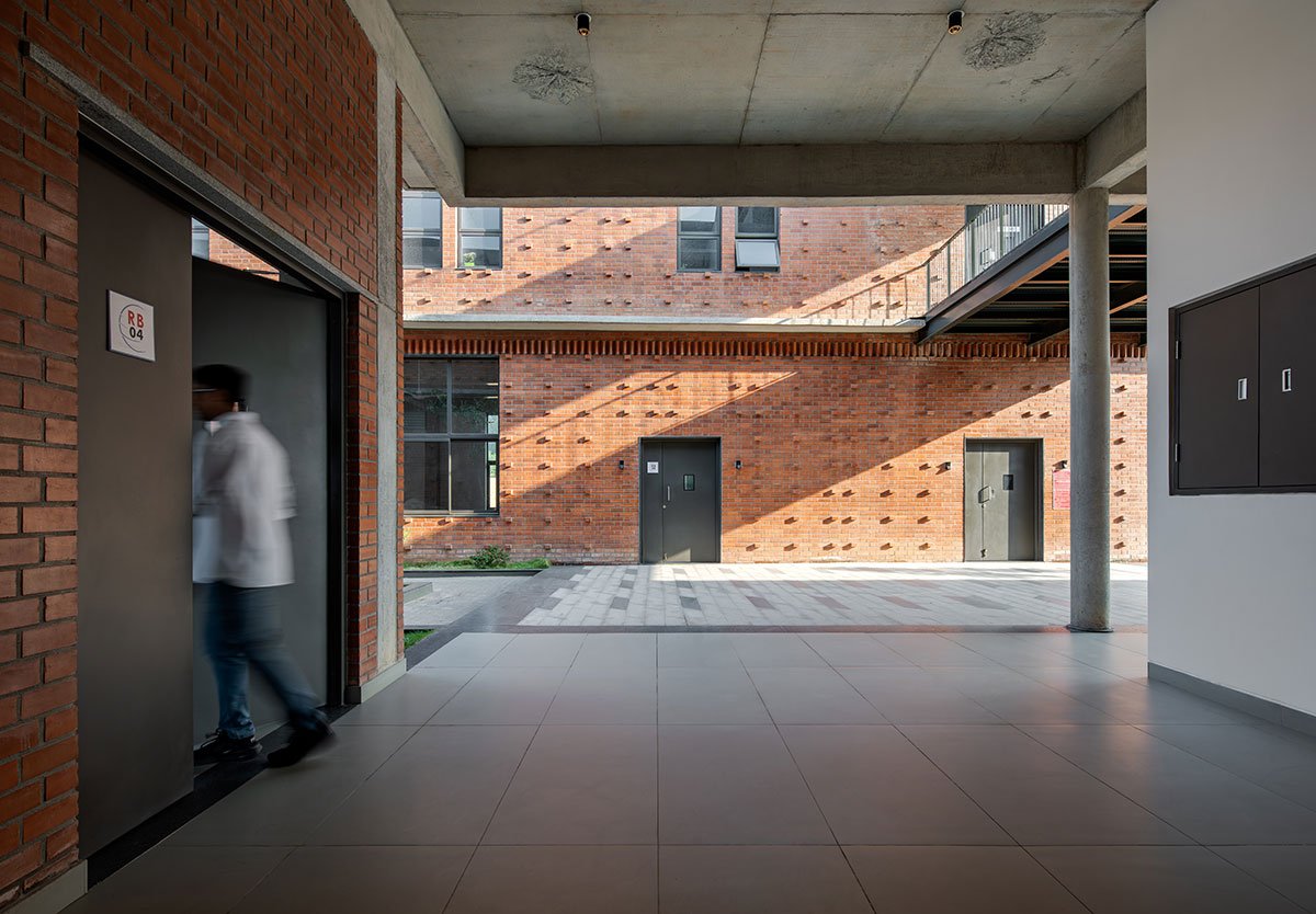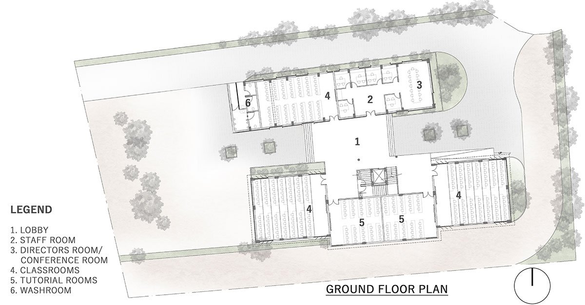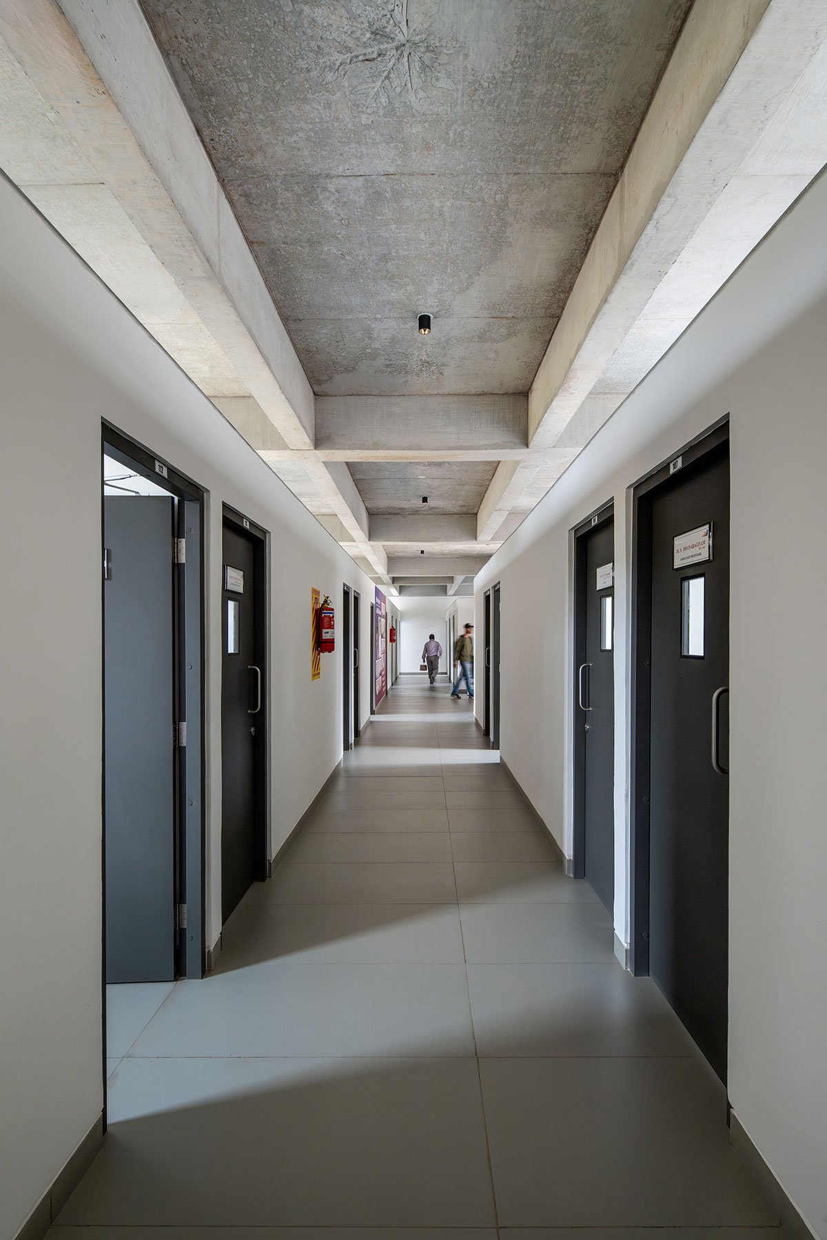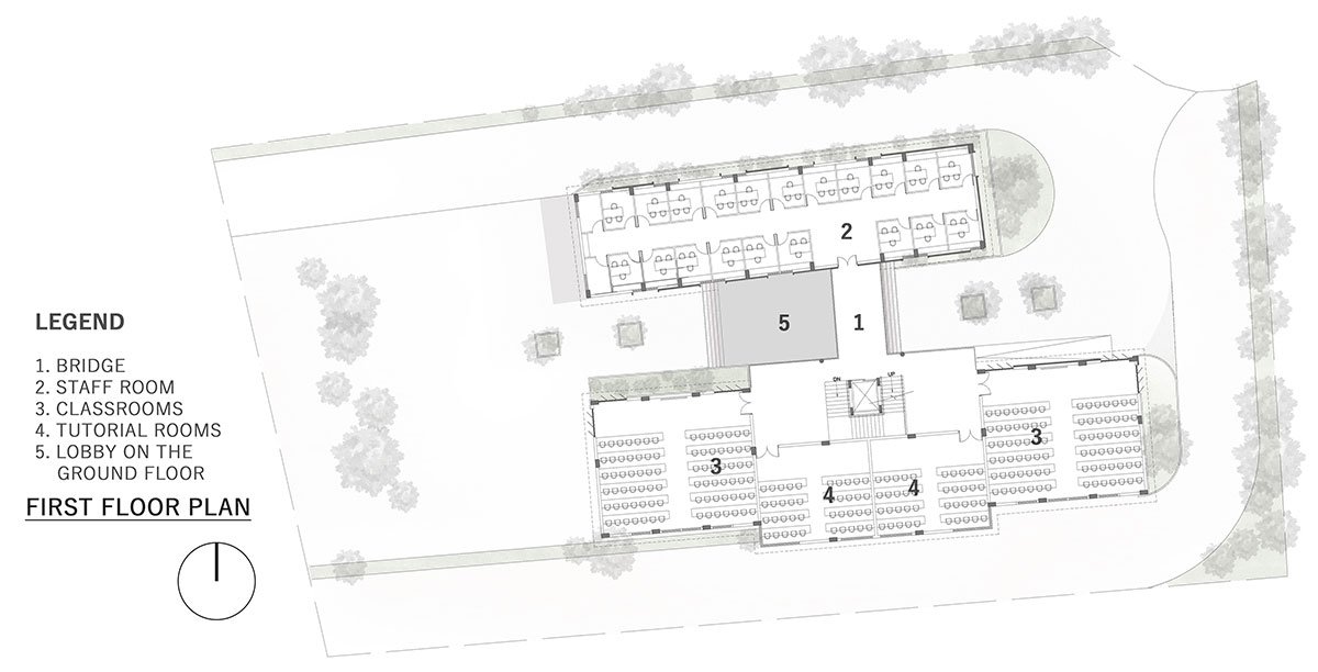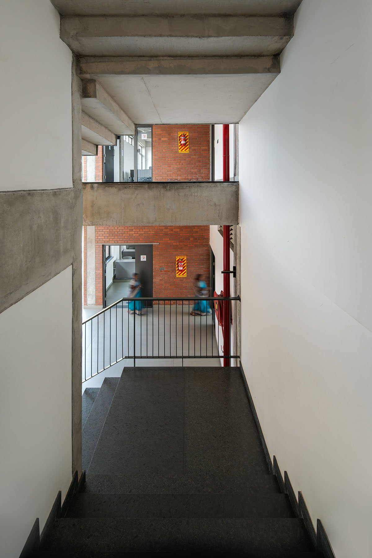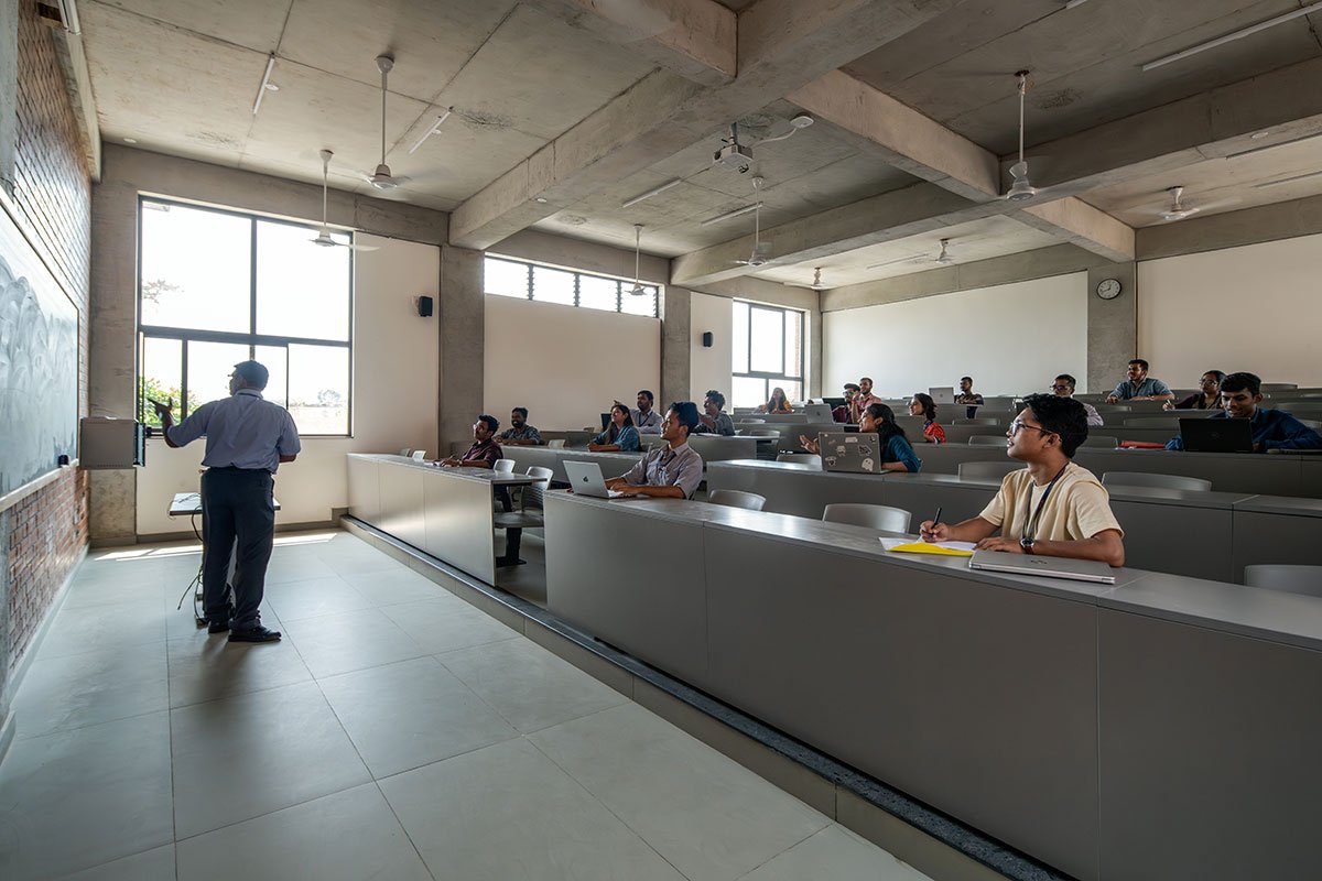 The central spine served as a spill-out area for the two wings and minimized the need for built circulation and thus its FAR consumption. To address the programmatic requirements posed by the education board, the architects designed the academic block with raked, lecture halls on either end, smaller tutorial rooms, and a circulation core that filled the center. The upper-floor classrooms were designed with flat floors that allowed the rooms to be adapted to different functions and furniture configurations.