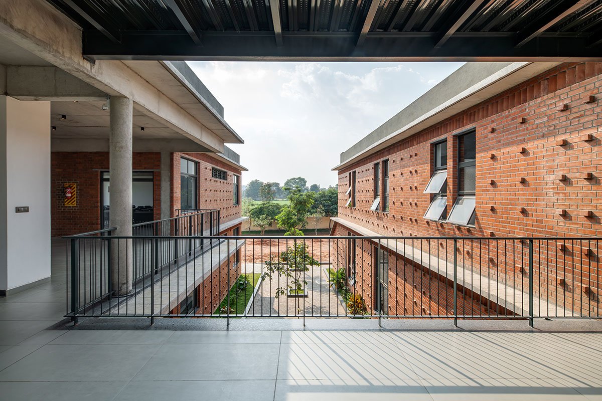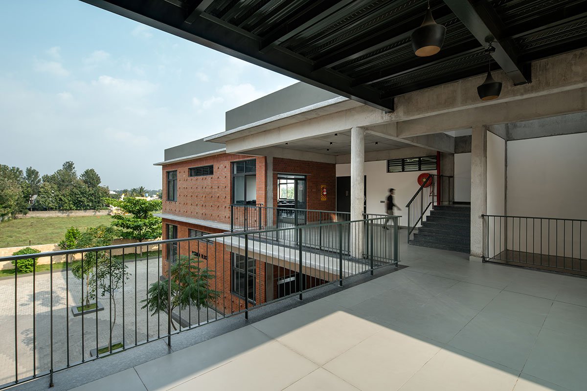 The faculty block housed independent staff rooms over two floors to accommodate their research and focused work. All spaces were designed to capture maximum, indirect daylight, and ventilation, avoiding artificial lighting and air-conditioning during most of the day. Both blocks were also wrapped in wire-cut brick sourced from the nearby region of Malur, creating a play in shadow through the day and adding dimension to the otherwise simple elevation.