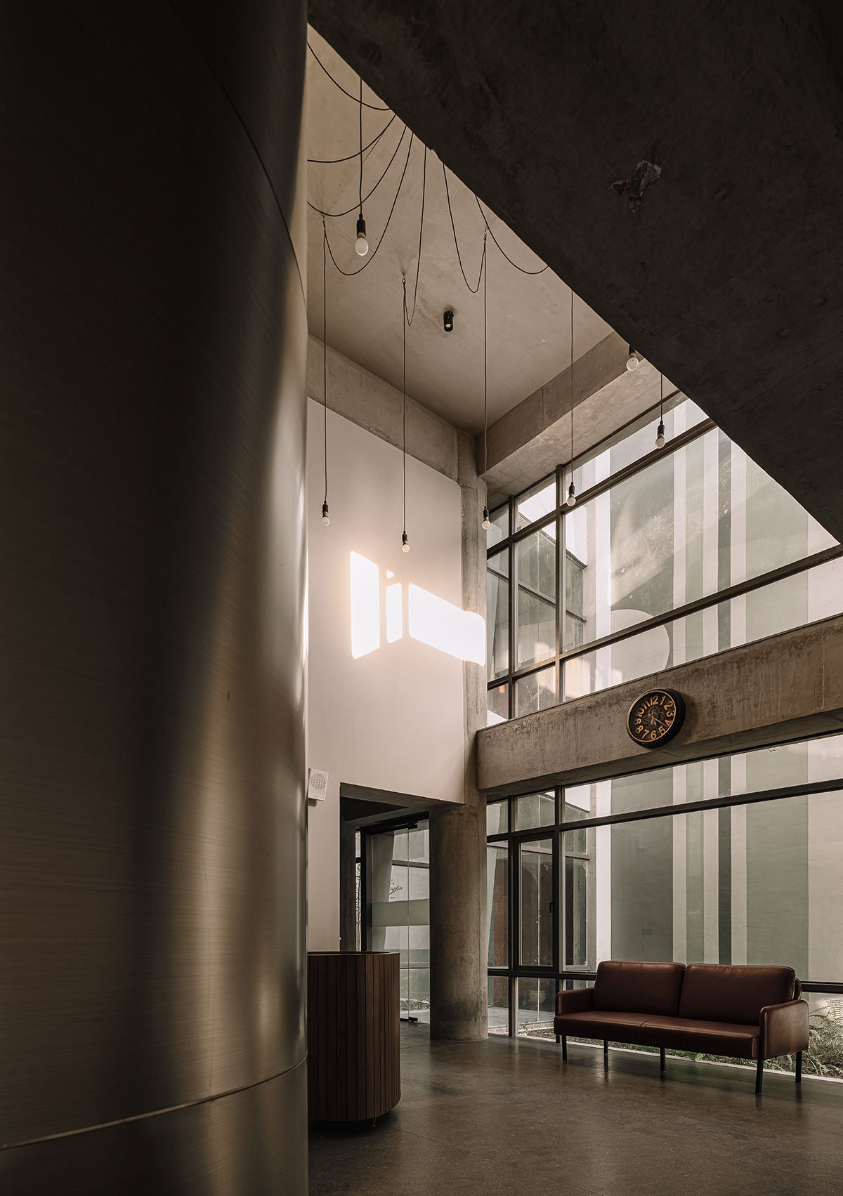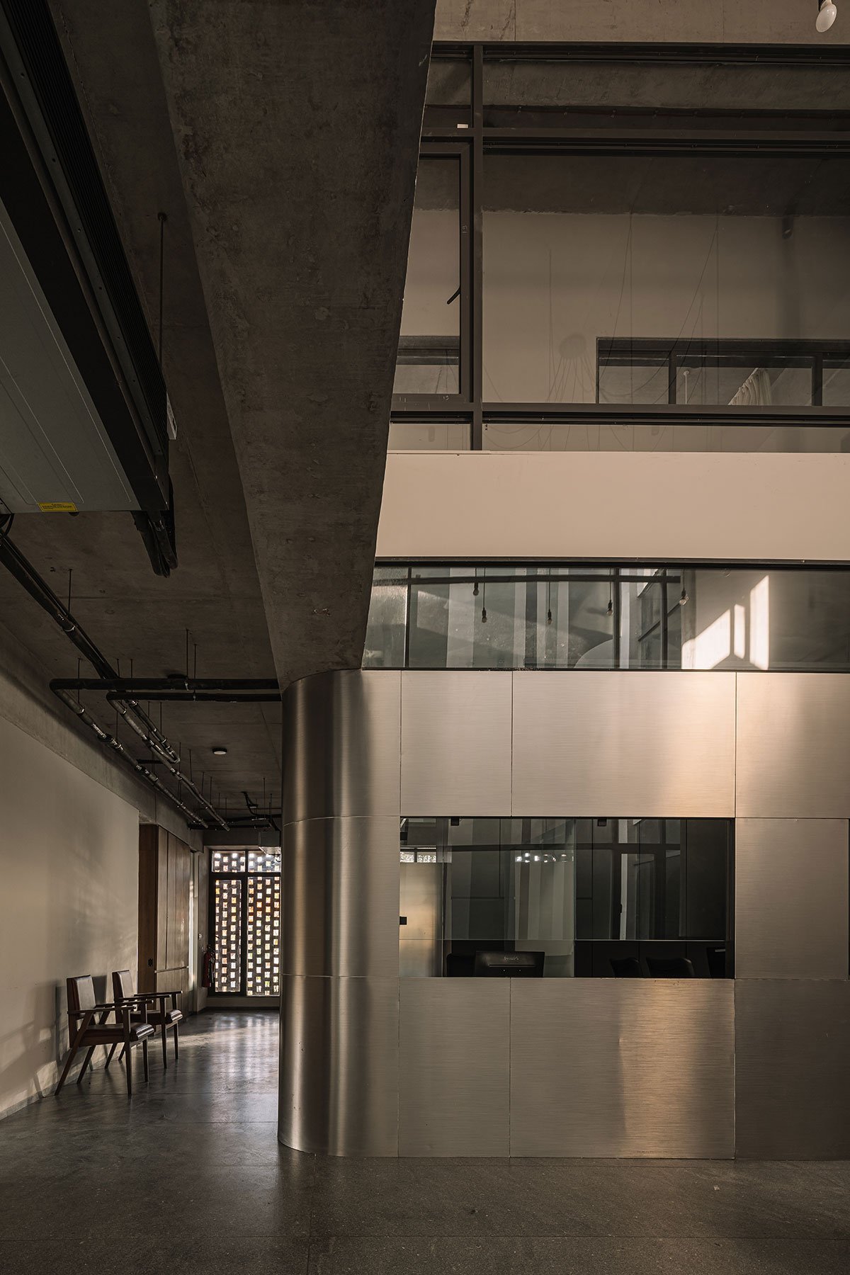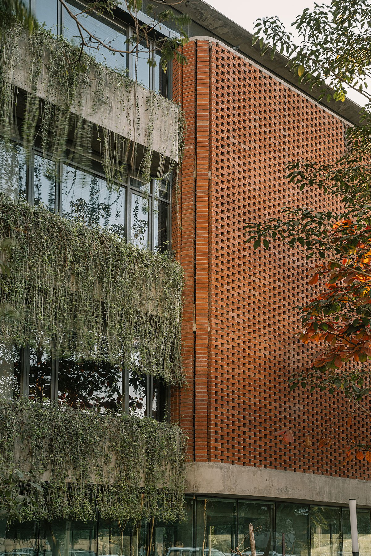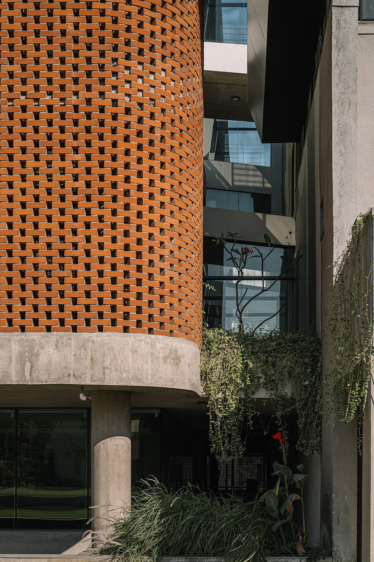 The material palette consists of exposed concrete, glass and brick jali on the exteriors. The interwoven brick lattice gives a contemporary appeal forming a screen, allowing light, view and air to pass through while providing privacy and security. Climatically, it works wonders; it reduces the heat gain from the west face of the building while the glazing on the north face has been kept exposed to grasp the mild sunlight while illuminating the interiors.