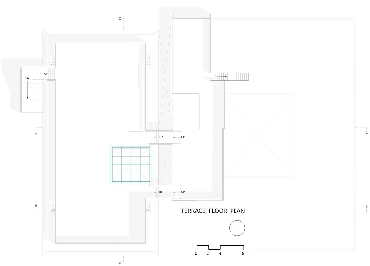 The first floor hosts all the administrative and teaching staff with a double heighted reception area. The second floor has classrooms and an advanced lab, with the passageway overlooking the first-floor reception area on one side and a double-heighted landscape area on the other side. The library and the computer lab on the third floor have an open reading area with a skylight above. All the floors are connected to the old existing building through ramps and passages. These manifold connections ensure adequate circulation space to accommodate the flow of the students and staff throughout and in between the two buildings.