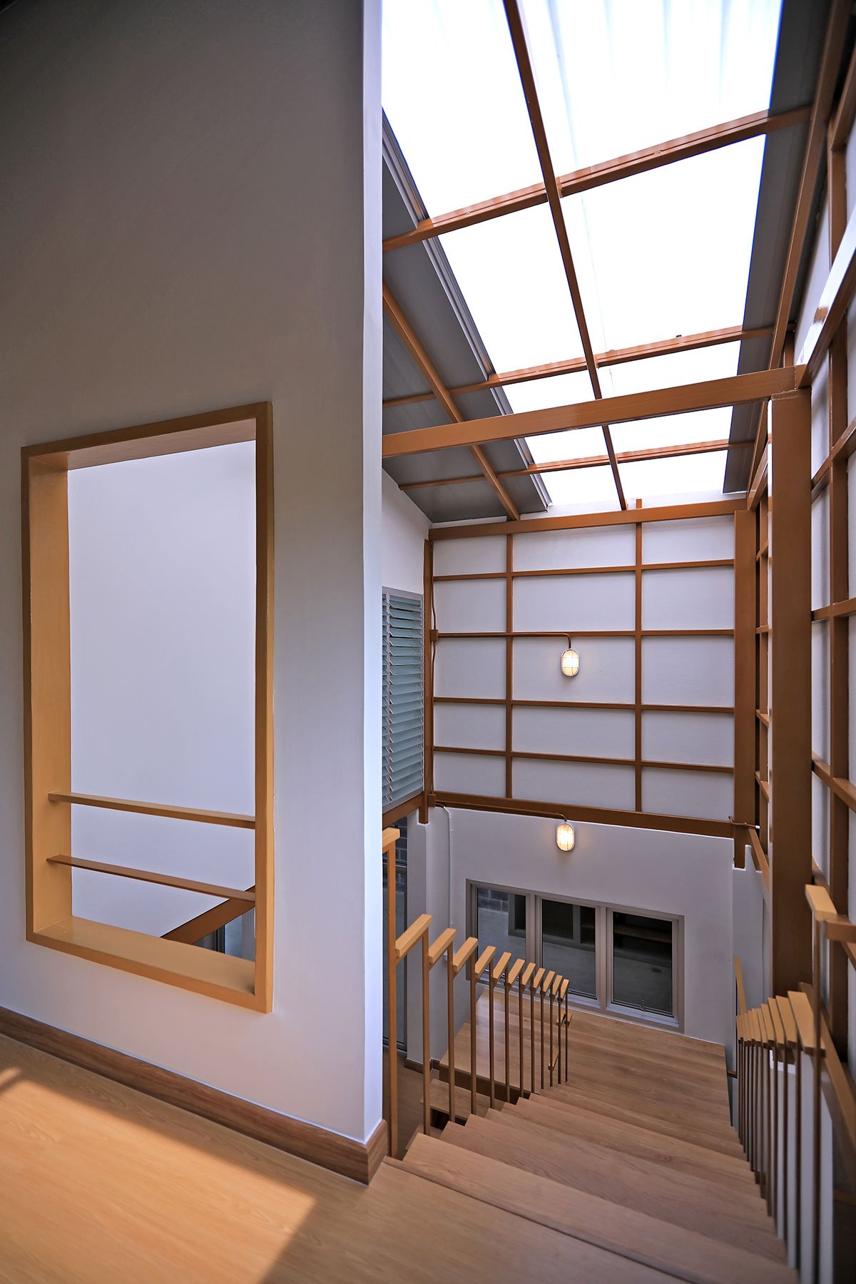 The new house emphasizes the use of natural light through a skylight that sufficiently illuminates all living spaces during the day. The design includes various openings that maintain privacy for the residents, such as a necessary number of windows and privacy screens on the front porch that cleverly interact with morning light from the east. The staircase is specifically designed for elderly users, featuring easy-to-navigate steps and sturdy handrails that provide support.