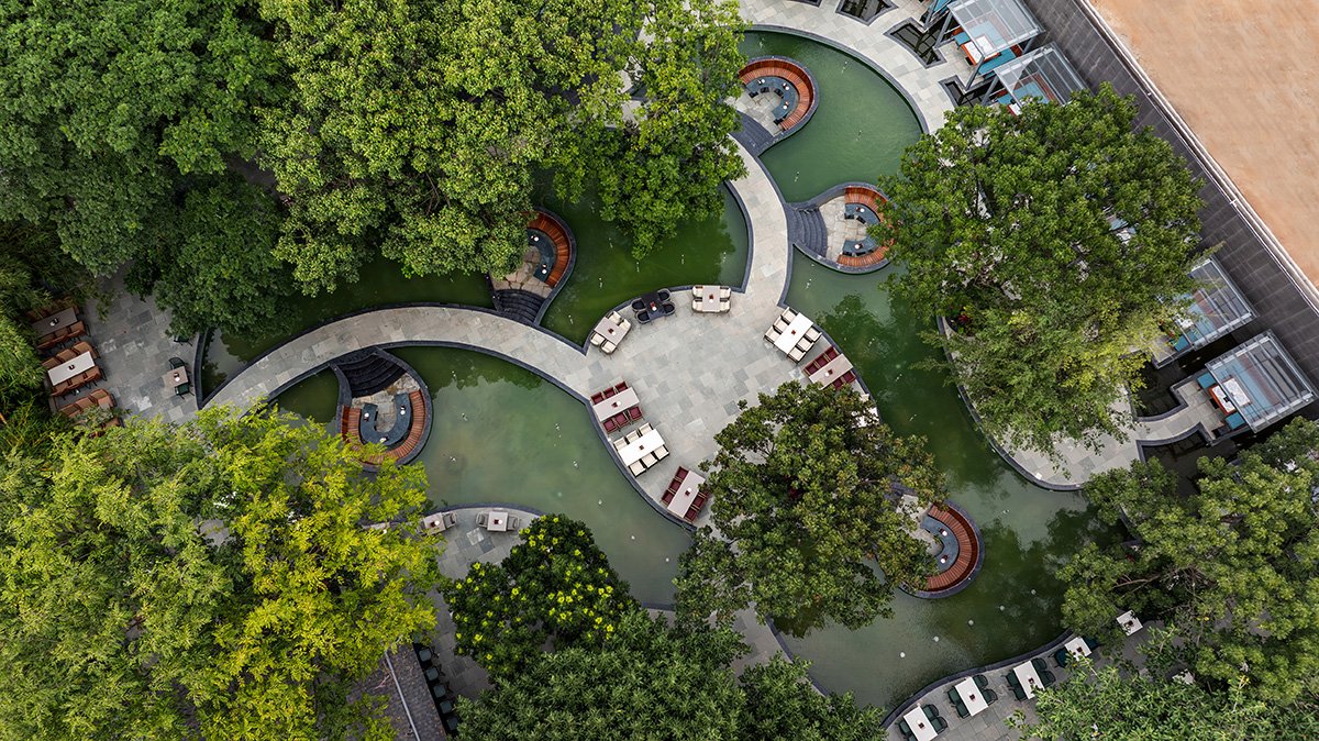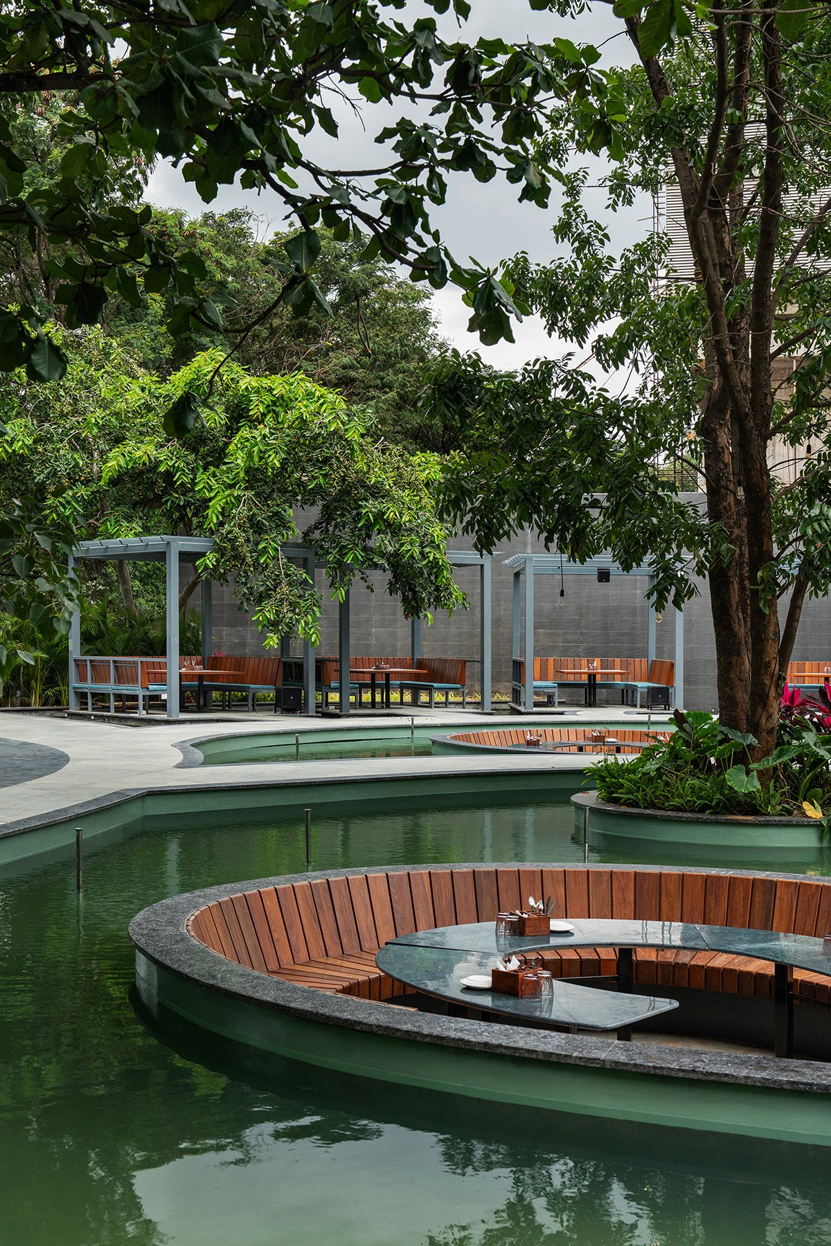 Landscape plays an integral role in defining the spatial experience. Planters, water features, and shaded alcoves soften the built form and create microclimates that encourage comfort and longevity of use. These elements establish what we describe as a sense of “natural luxury,” where material authenticity and spatial restraint evoke a quiet sense of place. The entire outdoor area gets integrated by the water body which is organic in form and is accentuated by the sunken seats inside the water.