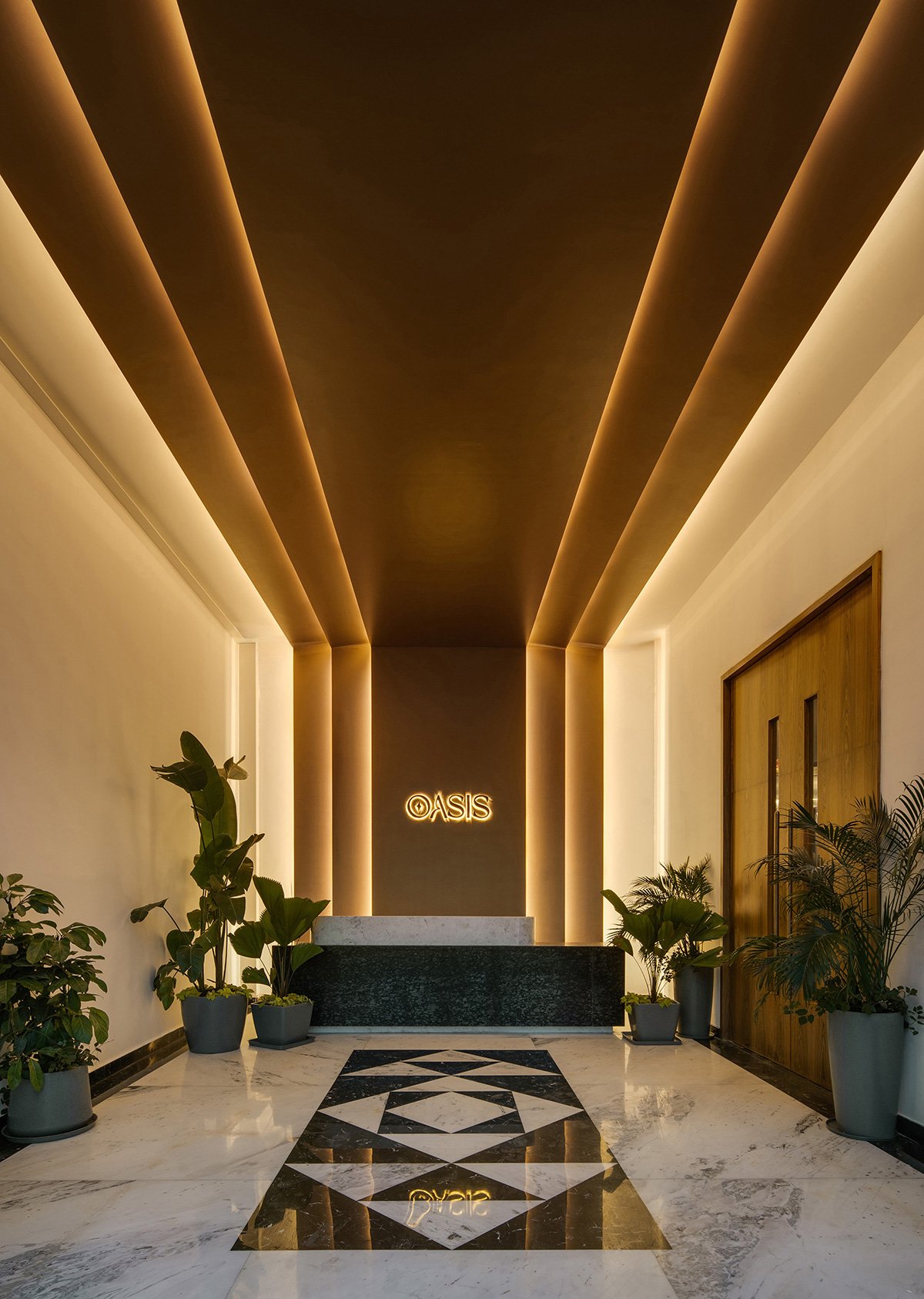 A linear entrance lobby introduces the subtle opulence of the space. Lit by integrated lines of light, the passage leads visitors toward a marble reception desk framed by a patterned black-and-white stone floor. This sequence sets the tone for a project grounded in material precision and sensory restraint.
