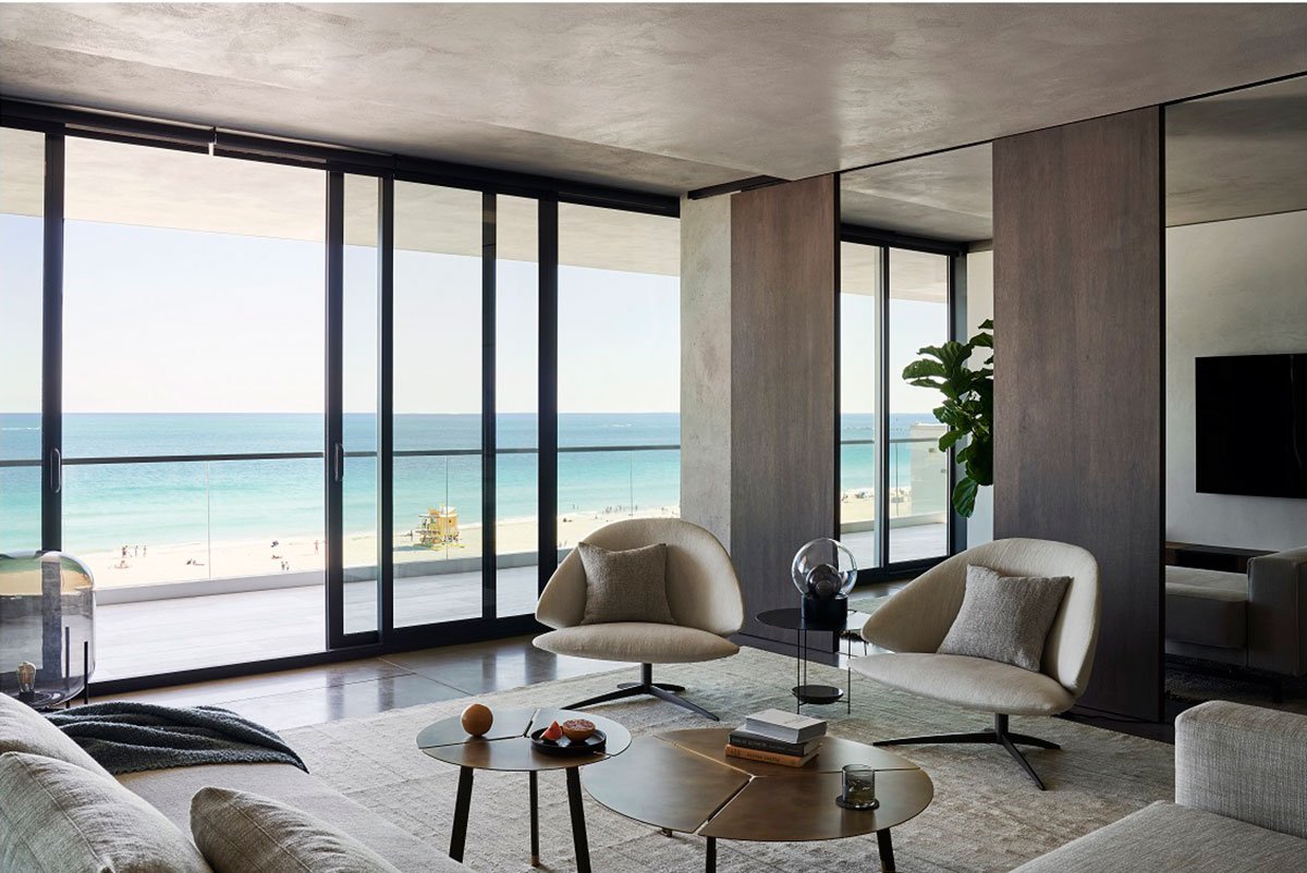 [Text as submitted by architect] Ocean Drive is a 6,112-square-foot single floor condominium unit within a new residential tower overlooking the Atlantic in Miami Beach, Florida. The clients are based in Seattle and travel often but have deep roots in the panhandle and had been looking to return home. To accommodate a family of six, this down to the slab renovation combined two smaller units to create a five-bedroom retreat on the beach.