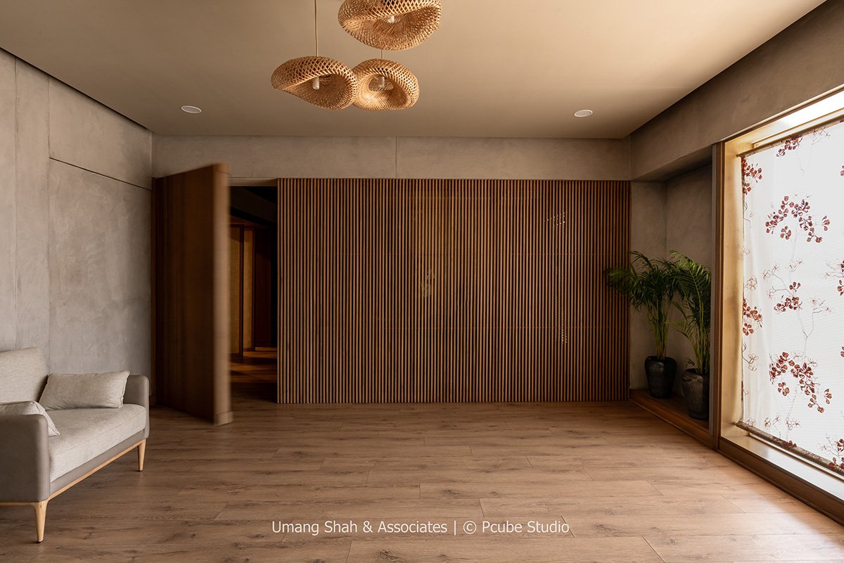 The design narrative unfolds with simplicity and material honesty at its core. The foyer sets a serene tone with muted concrete-textured walls, warm wooden flooring, and indirect cove lighting that highlights subtle architectural recesses. Natural light filters through soft-patterned curtains, casting a play of shadows that animates the otherwise tranquil interior.