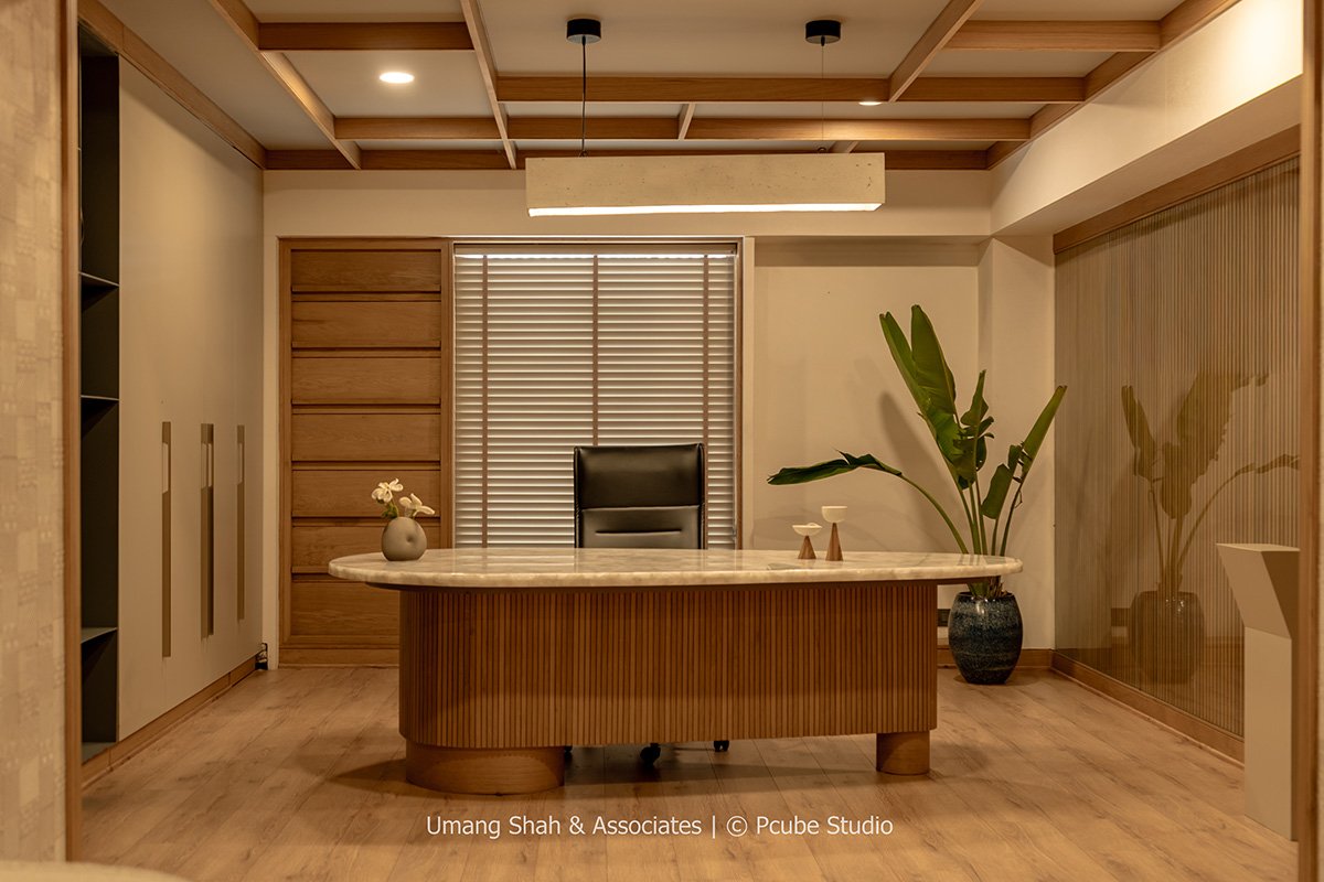 The principal cabin, anchored by a bespoke fluted wooden desk with a stone top, embodies elegance and focus. A wooden waffle ceiling adds depth and rhythm, while the restrained color palette — a balance of beige, oak, and greys — creates an atmosphere of composure. The adjoining wall unit, crafted in matte finishes with curated artefacts, brings a tactile warmth that softens the linear geometry.