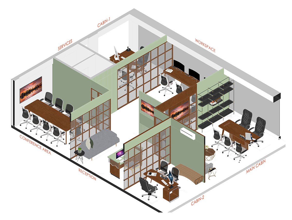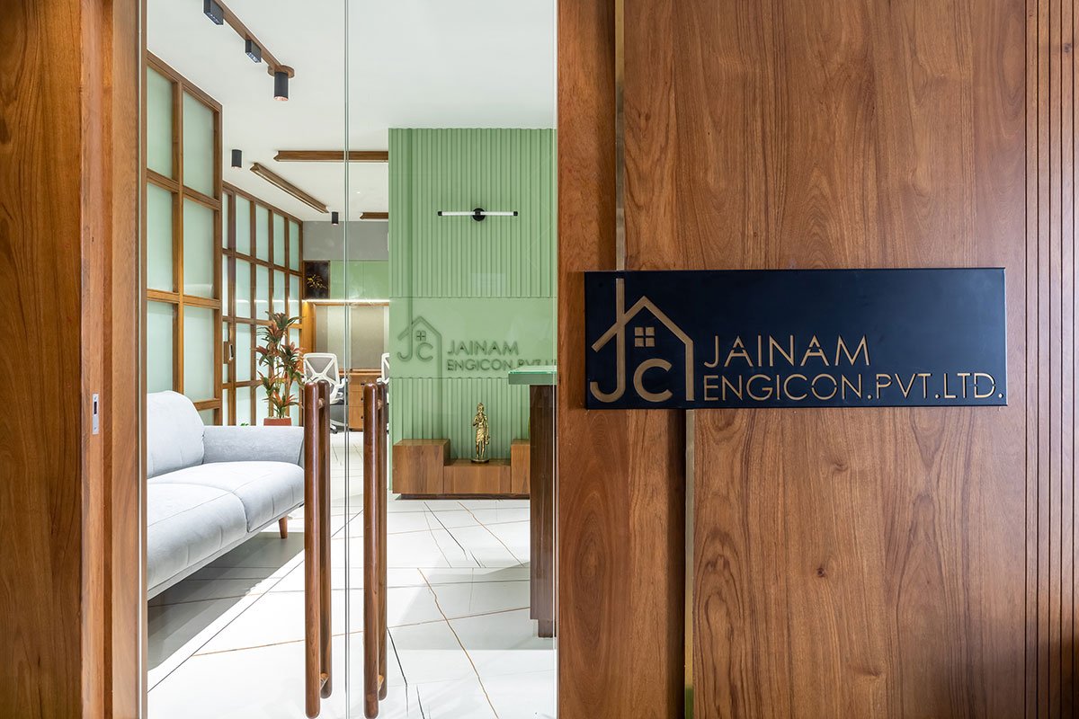 Aside from living plants, materials like wood which is another main focused element on the vertical paneling and openings as well as in furniture products and lighting fixtures, add a touch of nature that is both absorbing and tranquil. The detailed office table with vertical grooves in wood steals the show. Highlighting it and blending it perfectly with the atmosphere. That resemblance can be seen everywhere within the office. The fluted glass and wooden partition with flushed doors help in breaking the continuity.
