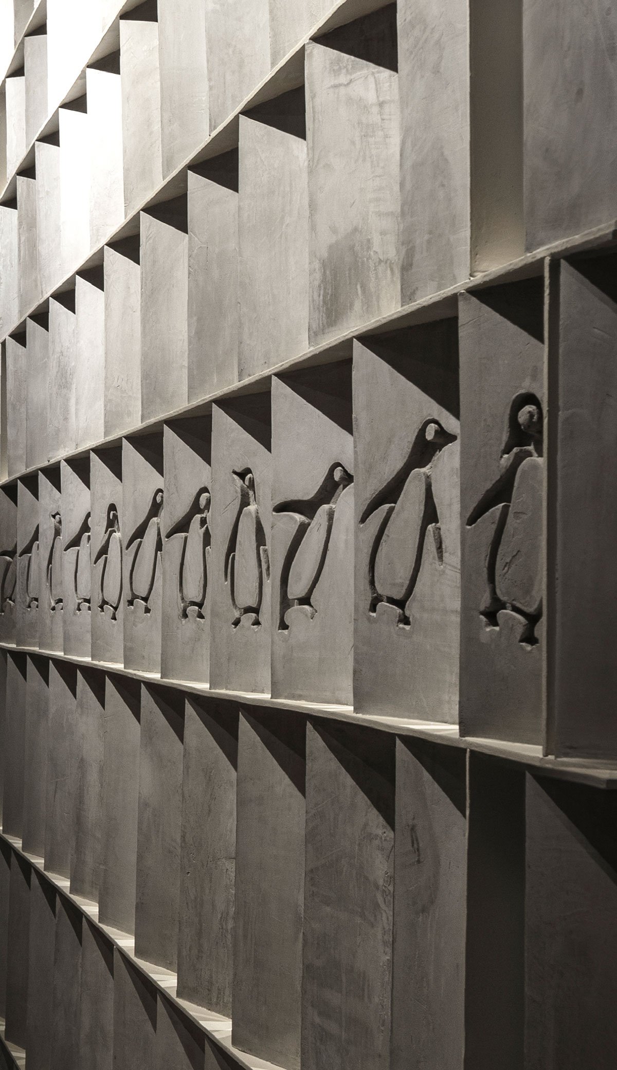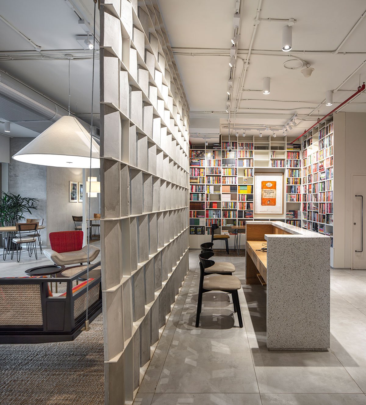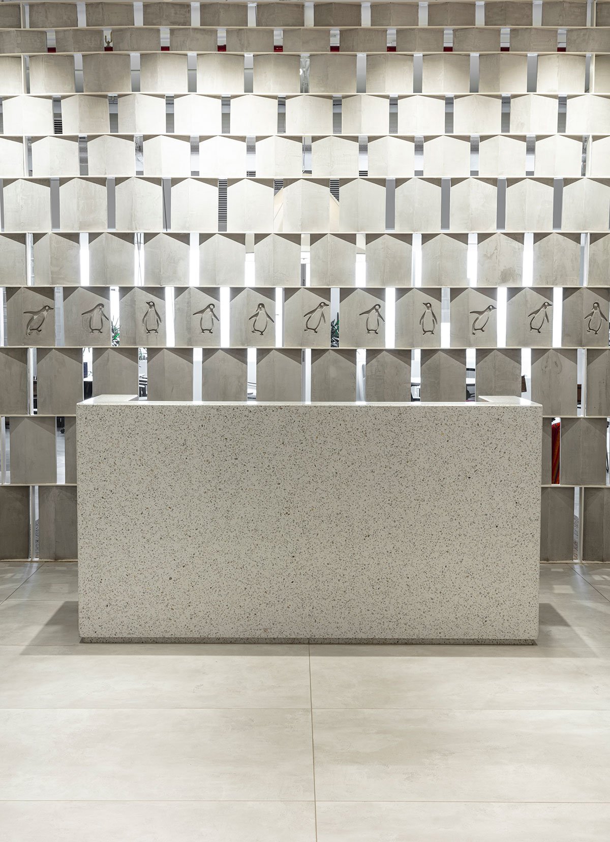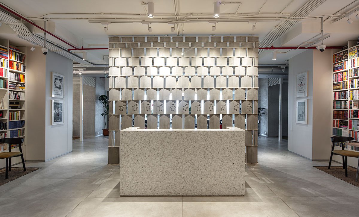 Rather than integrating the company’s name and logo plainly, the architects designed a handcrafted cement screen, resembling books to subtly incorporate the brand identity into the spaces. Featuring penguin-shaped motifs engraved into its central row, the screen forms the backdrop to the reception, serving as the ideal entrance to the creative and collaborative office space of a company that is in the business of books.