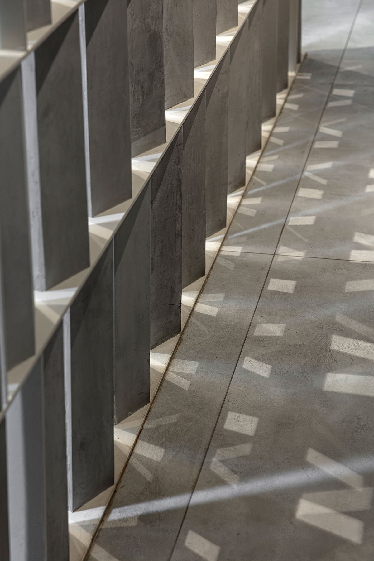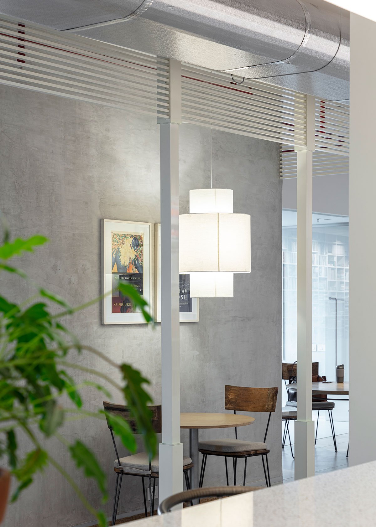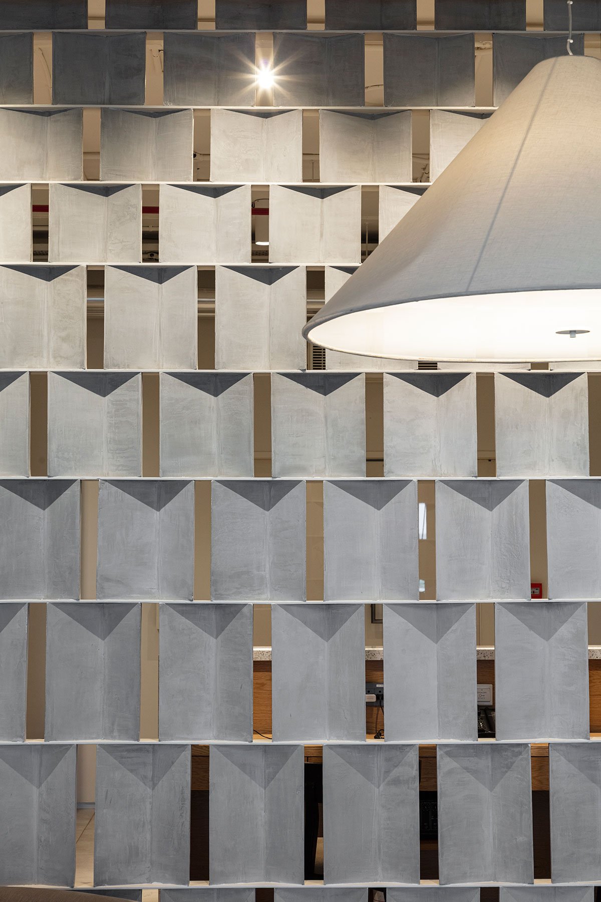 Rather than integrating the company’s name and logo plainly, the architects designed a handcrafted cement screen, resembling books to subtly incorporate the brand identity into the spaces. Featuring penguin-shaped motifs engraved into its central row, the screen forms the backdrop to the reception, serving as the ideal entrance to the creative and collaborative office space of a company that is in the business of books.