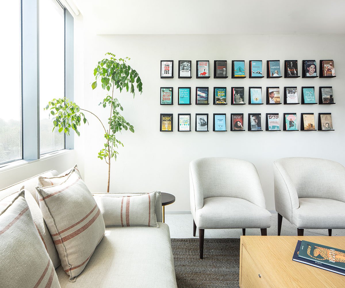 Weaving the Brand’s Identity into Spaces: A restrained material and colour palette is used, featuring white and grey hues as finishes on the floors and walls. The architects worked with the Penguin Random House team to strategically locate thematic artwork, such as framed book jackets, throughout the office to add glimpses of the brand’s heritage and build a sense of belonging. The artwork and dispersed green pockets add a sense of vibrancy to the otherwise muted colour palette.