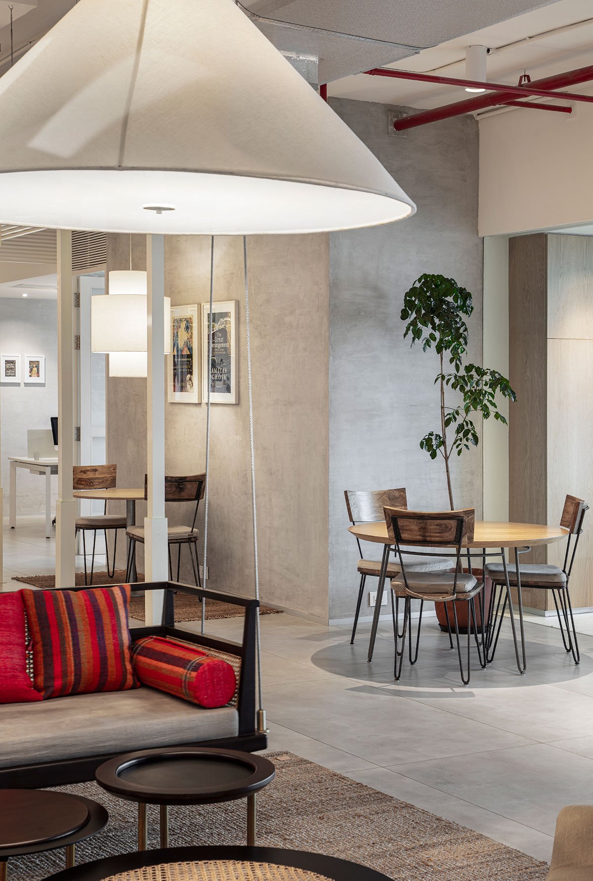 Meeting rooms, cabins, and workstations for individual use are strategically arranged around these clusters to create a welcoming atmosphere. Terrace seating along the corridor acts as a public seating accommodating two people in each pod and transforms the large corridor into a meandering street with humble proportions. All these areas receive ample natural light from the north, east, and west. While primarily serving as individual and/or formal workspaces for creative and non-creative teams, the workspaces break away from traditional formality as the smaller cabins can be adapted into meeting rooms when needed.