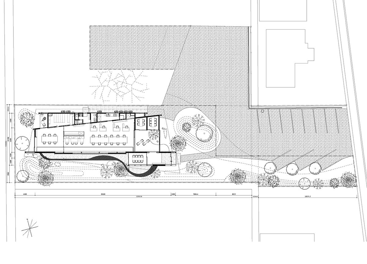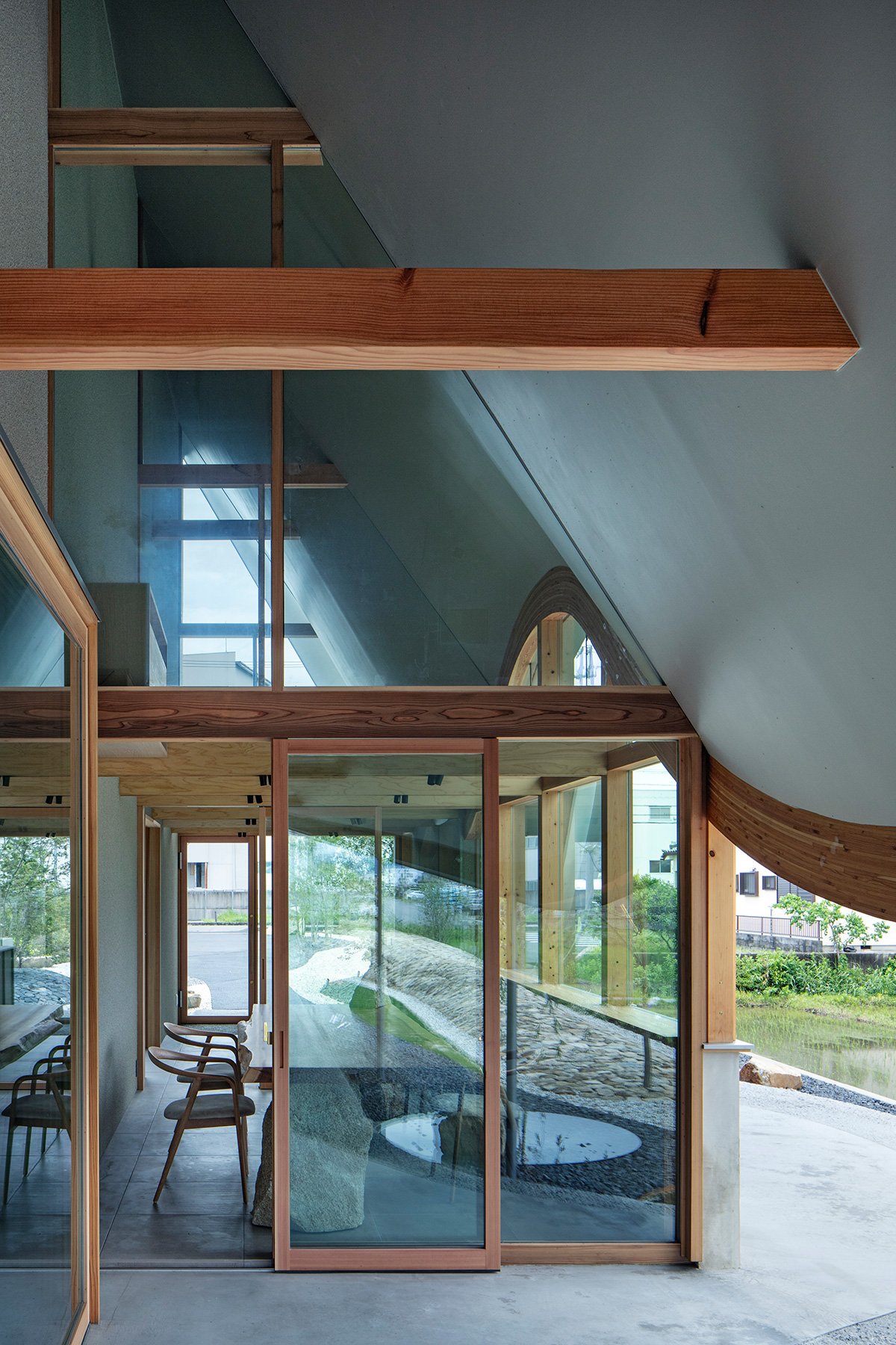 Inside, the spatial organization is conceived to connect with the exterior. Beneath the raised roof, a tall space houses the entrance and meeting rooms, naturally drawing the outside in. Courtyards and verandas are placed beneath the undulating roof to create intermediate spaces that mediate between inside and outside. Small margins and resting places are arranged throughout the building and site, where stones and greenery are incorporated into the interiors, producing a sense of continuity with nature even while indoors.