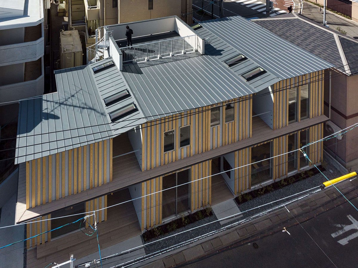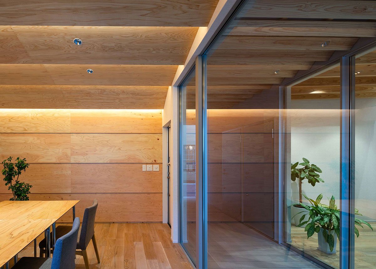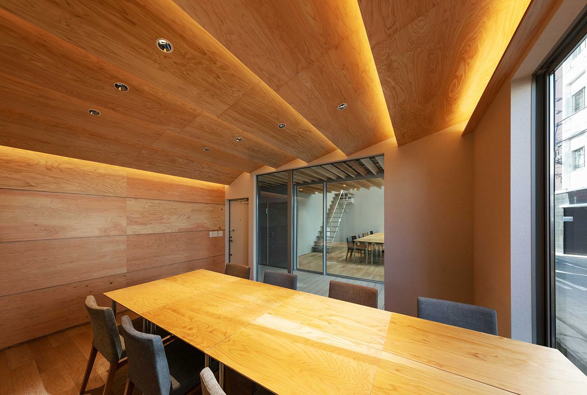 [Text as submitted by architect] ”One large roof” connects the office space and seminar room together with a semi-outdoor terrace to create a building where people can gather. We designed a warm office by using a lot of wood inside and outside.