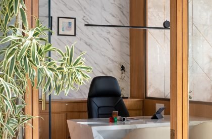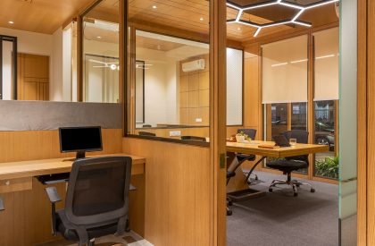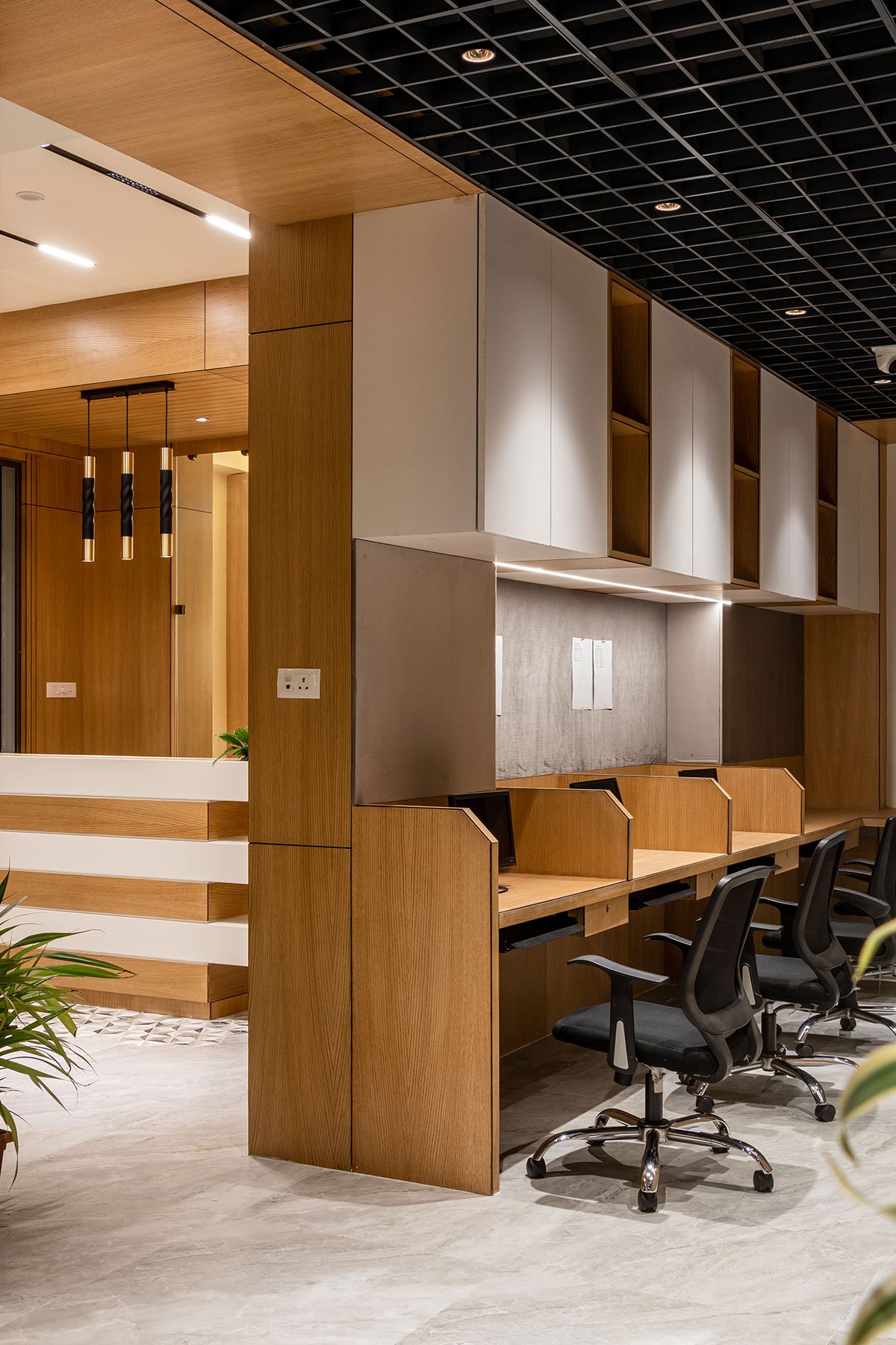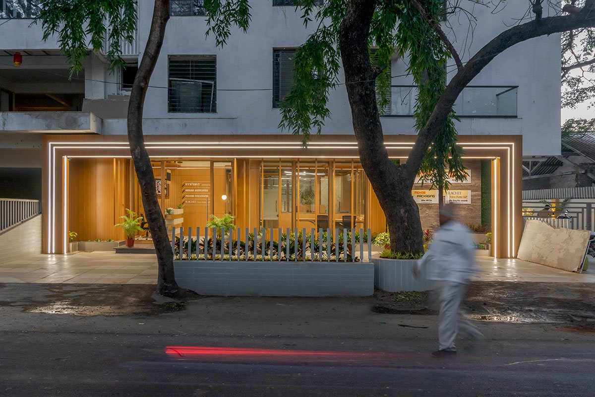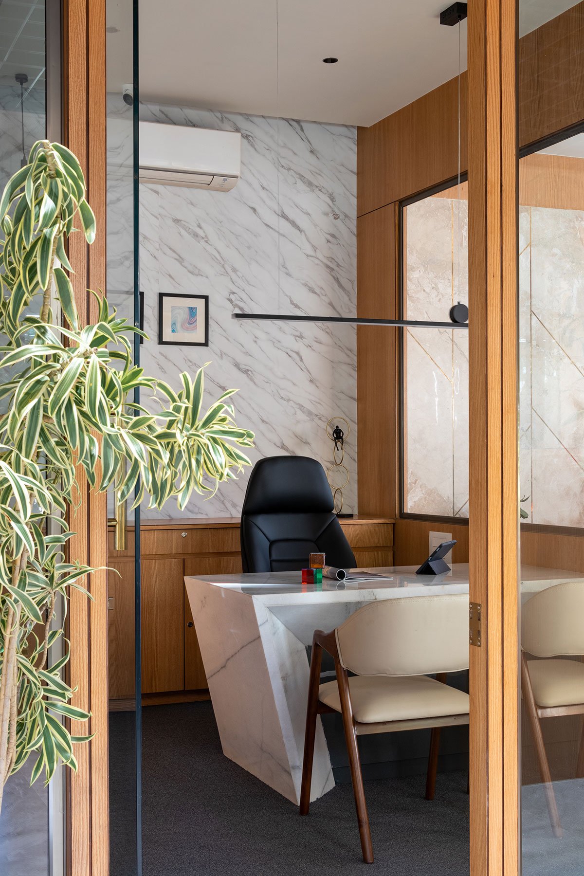 By visibly incorporating nature into the architectural experience of the space, the design aims to create a place to work that responds to the immediate setting and the climate of the city. The derivation is a well-organized area with a modern appearance and traditional values. The interiors are kept simple by giving more importance to the architectural experience. Materials such as wood, marble, shades of grey and indoors populated with easy maintenance plants give a natural feel to the space.