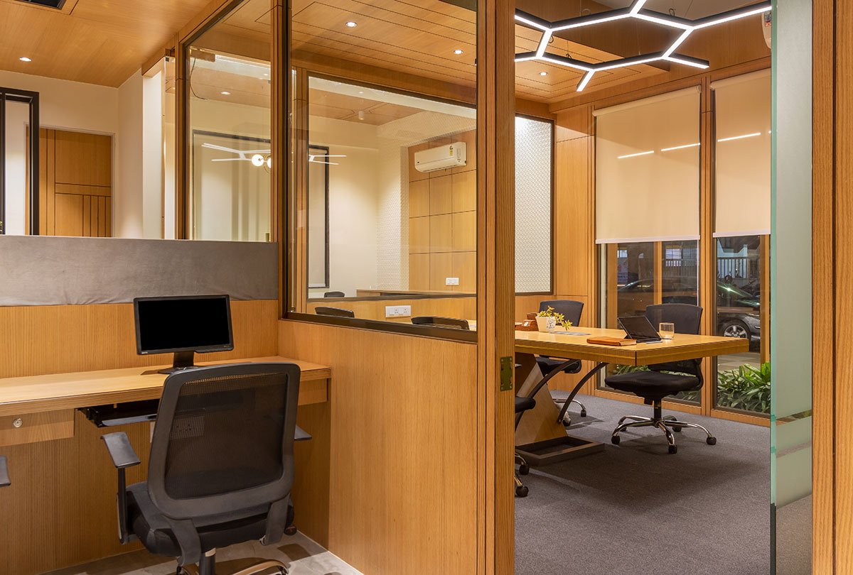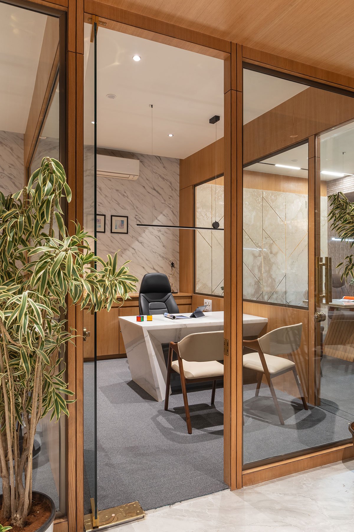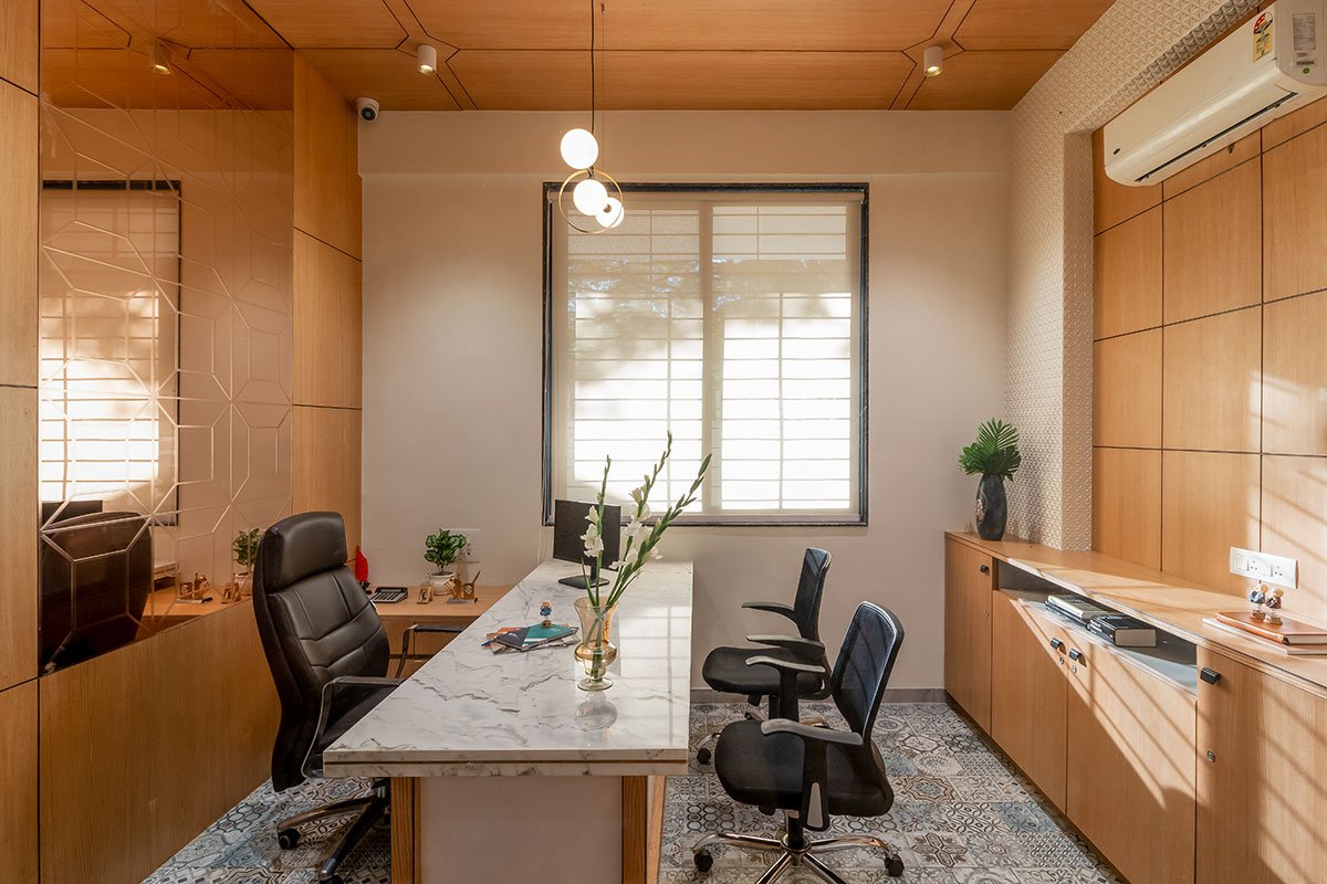 The seating faces the reception area which further connects to the pooja room and the cash counter cabin. The area assigned for the workstations follows the same minimal and formal language. It is a minimal composition of wooden tables, chairs, and plants. This semi-private zone further connects to the cabins, where every cabin follows the same theme but standout differently. Despite the office being adorned principally in a single hue, this design by Archielecto is bold, arresting, and unrepentantly alluring.