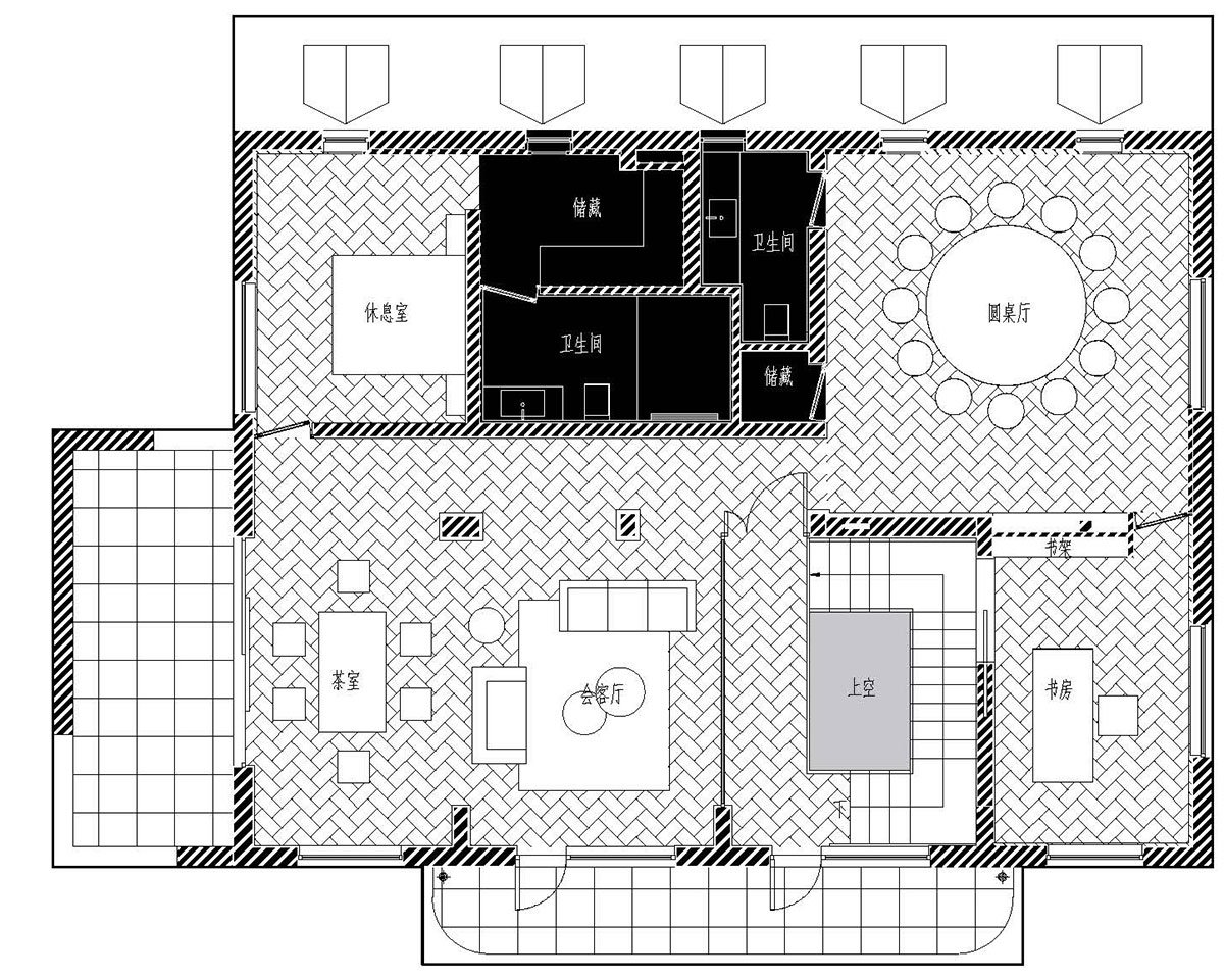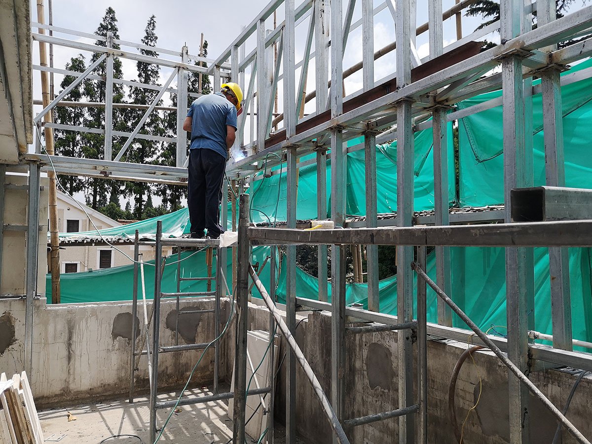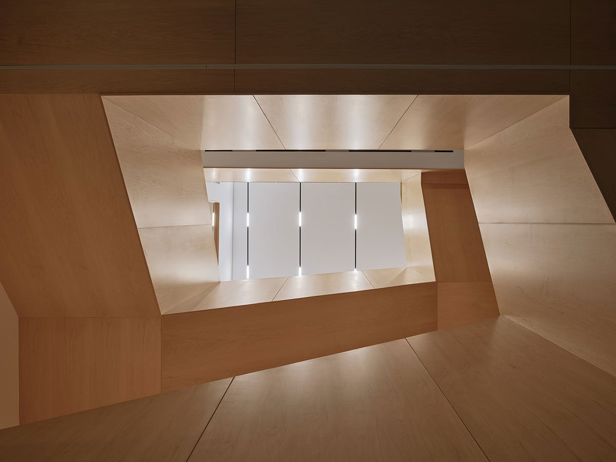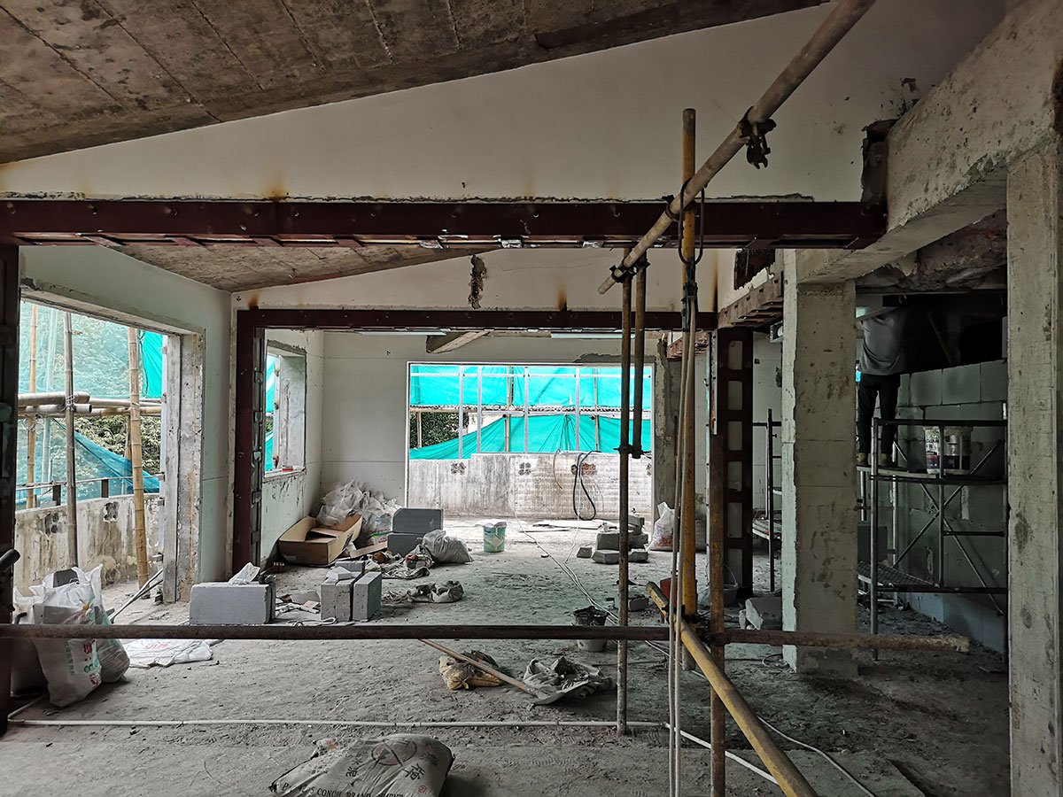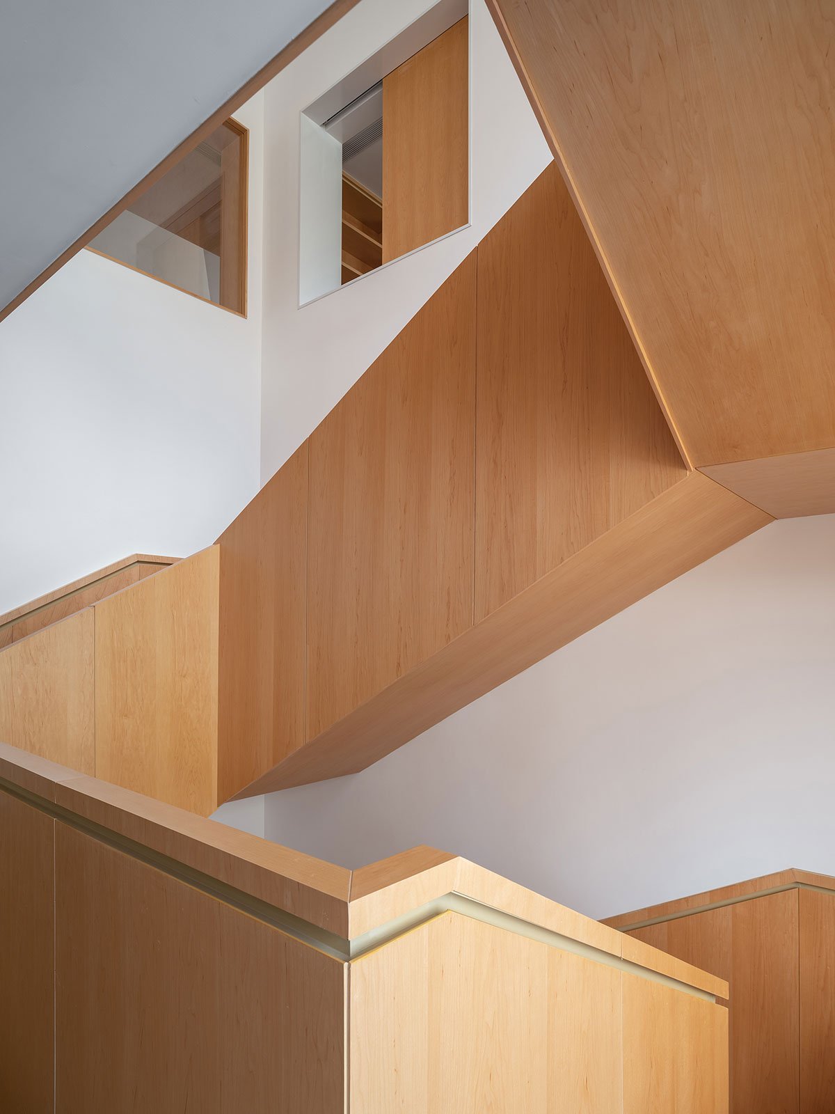 Concrete walls around the atrium are reinforced by steel frames. Beams are added to large span openings. All the reinforced components are intentionally concealed. The materials include wallpaper, paint, oak floor, maple siding.