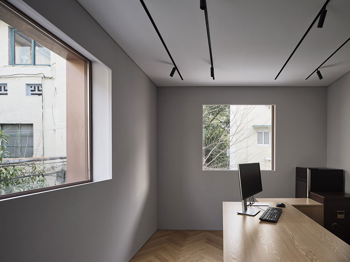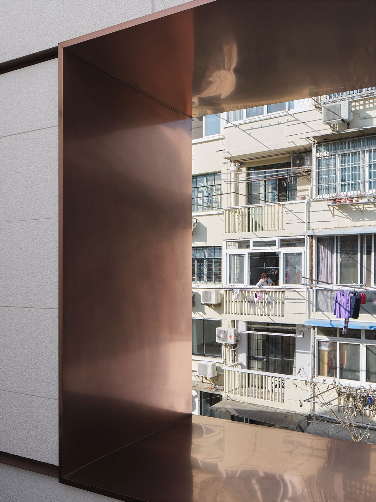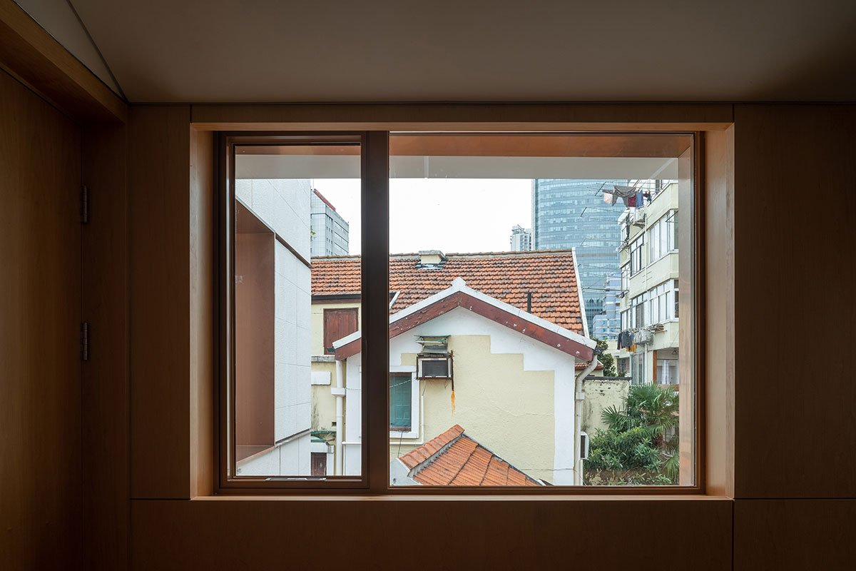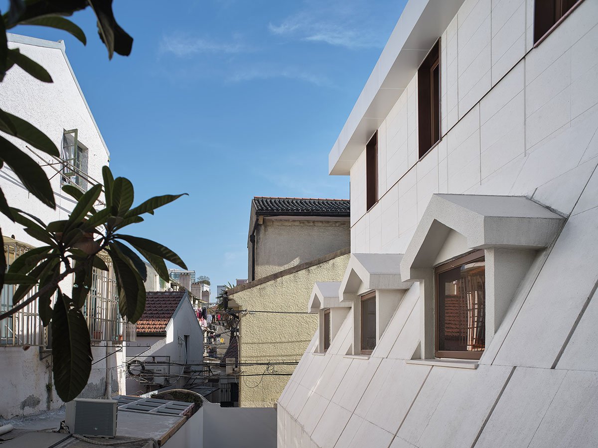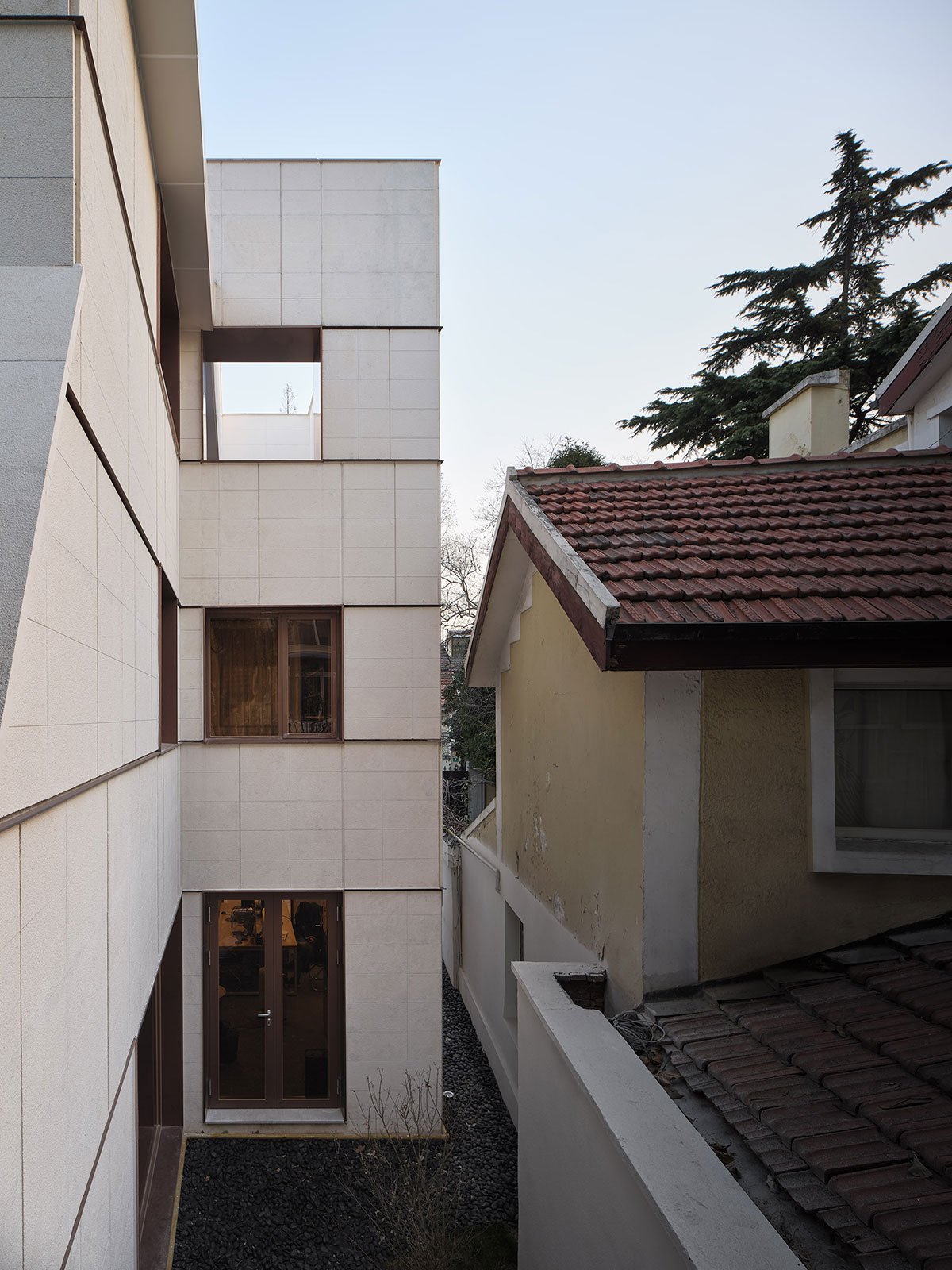 The building can be neither a nostalgia of concession, nor a mimic of modernism. It can only be itself under specific conditions, trying to fit in while confronting its surroundings. The building has only one exposed facade while the volume was missing on the southwest corner. By making up the walls on the corner, the outline is completed, which offers a special moment of the building. The intact and abstract massing stands out from its surroundings, while the opening on the corner variates the repetition of the existing windows. It also provides a frame looking at the neighborhood, which works as a supplement to the limited outdoor space.