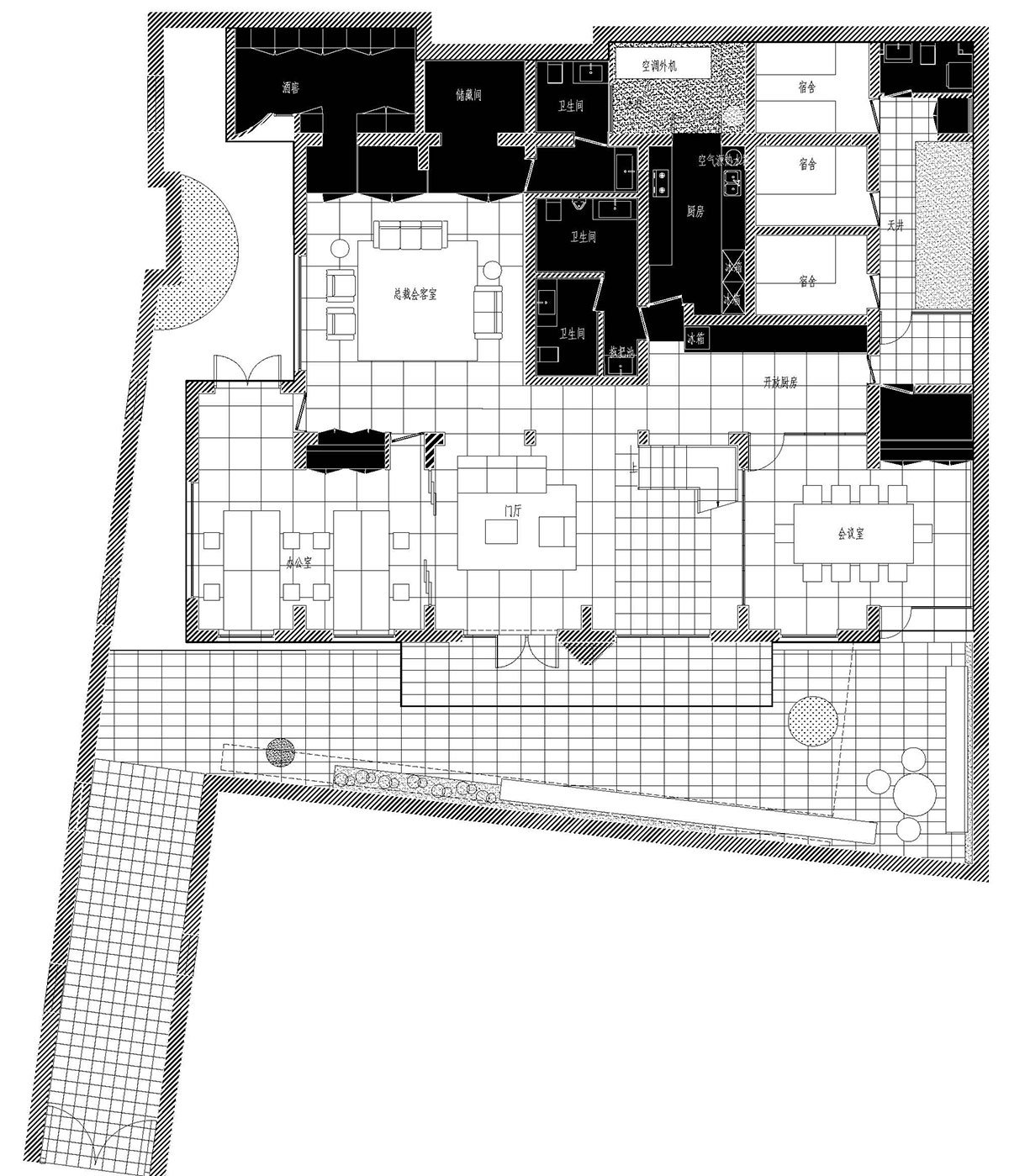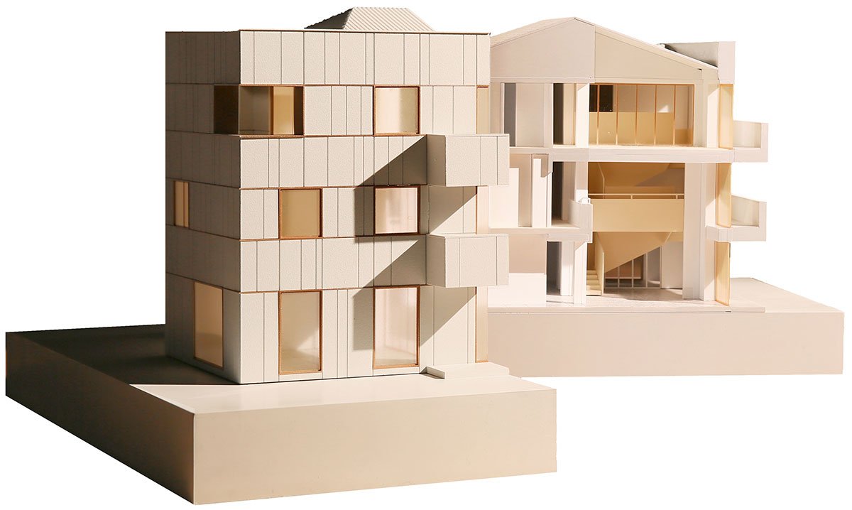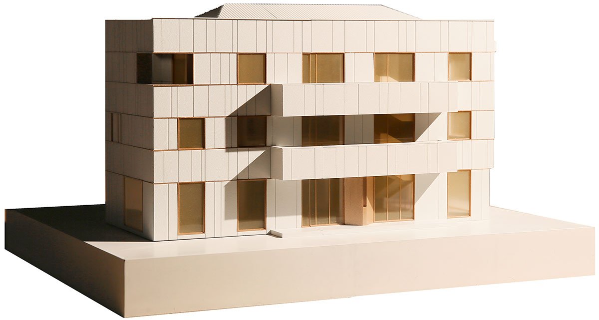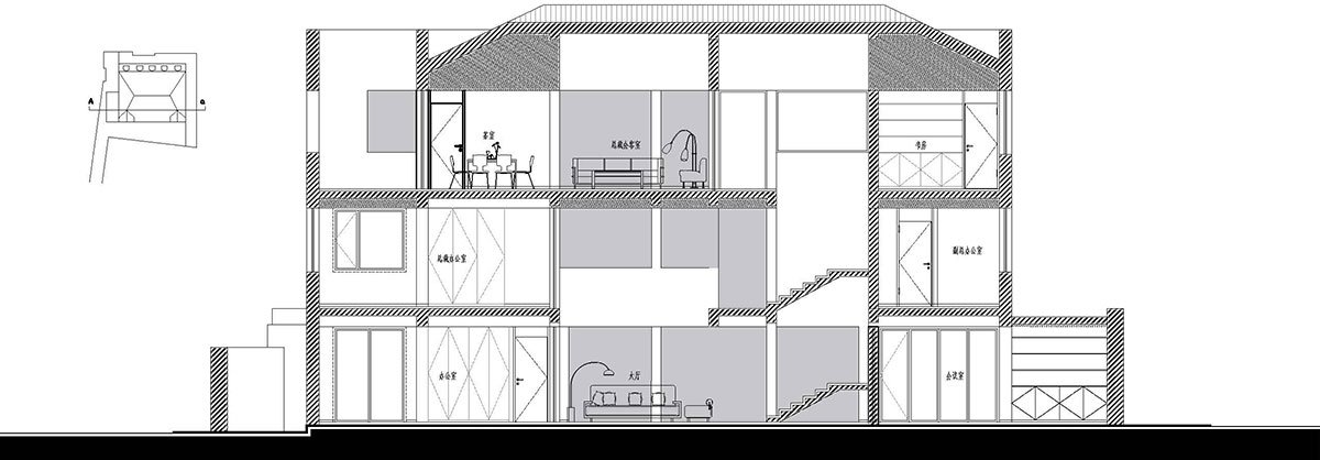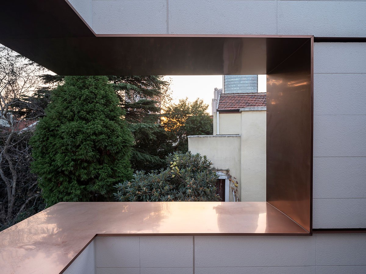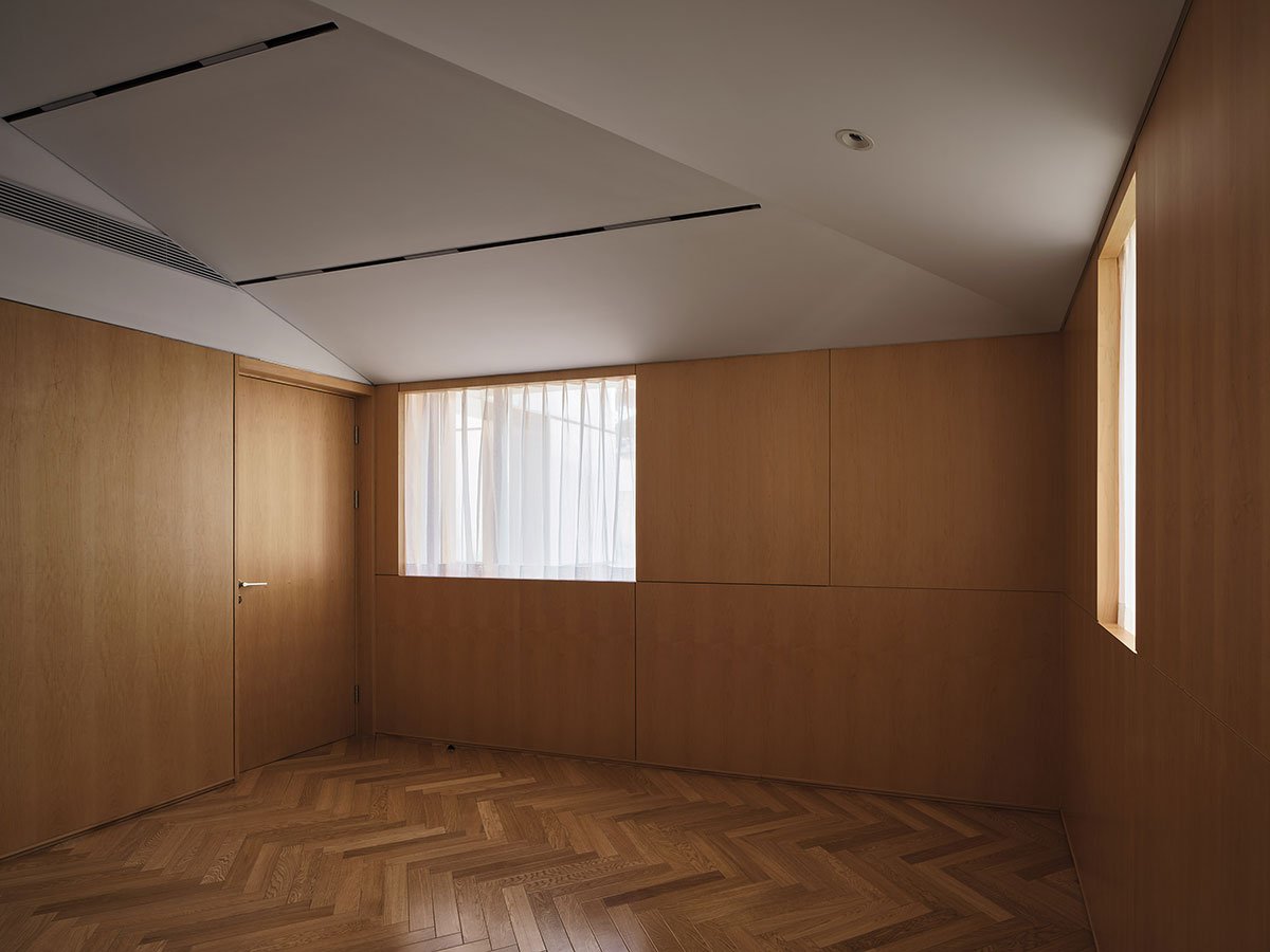 The building can be neither a nostalgia of concession, nor a mimic of modernism. It can only be itself under specific conditions, trying to fit in while confronting its surroundings. The building has only one exposed facade while the volume was missing on the southwest corner. By making up the walls on the corner, the outline is completed, which offers a special moment of the building. The intact and abstract massing stands out from its surroundings, while the opening on the corner variates the repetition of the existing windows. It also provides a frame looking at the neighborhood, which works as a supplement to the limited outdoor space.