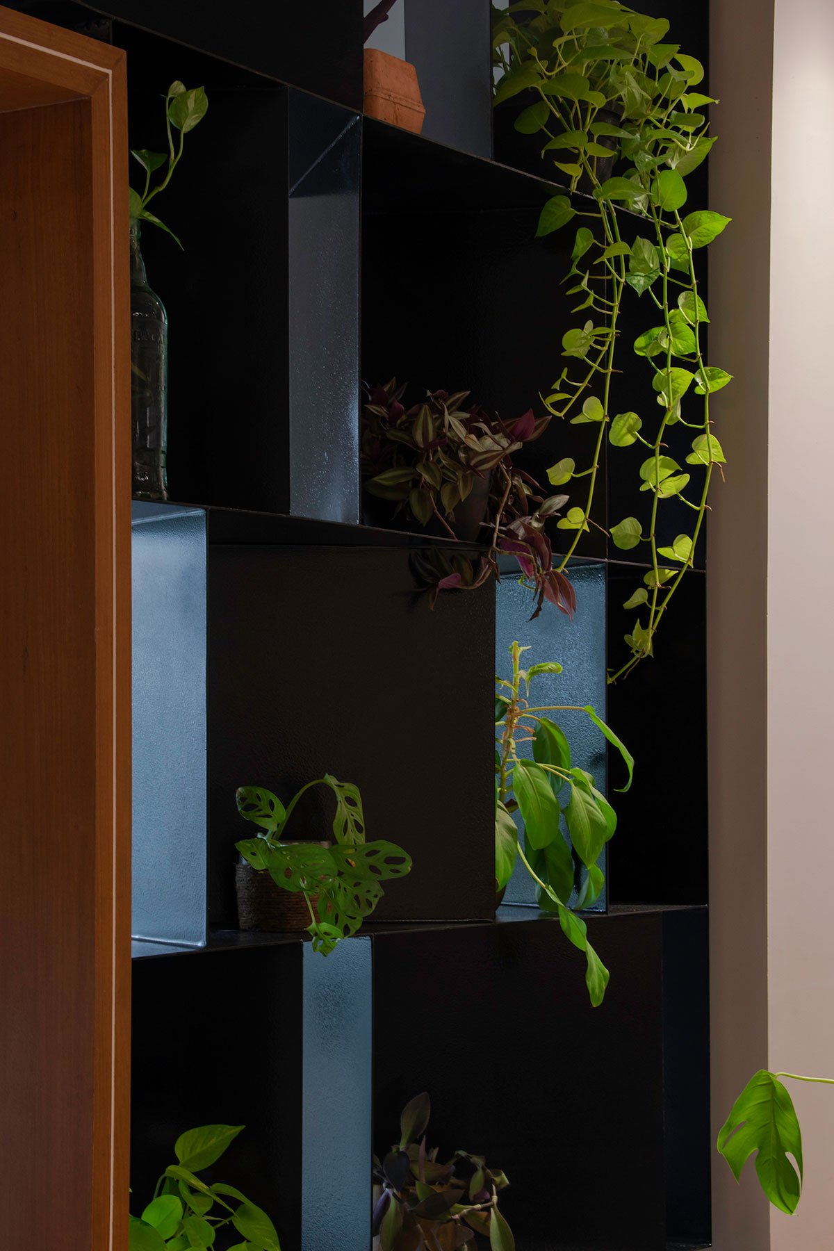 The second screen was a play of ‘hide and seek’ with inclined planes accommodating plants, company exhibits while also framing pleasant views of the road and city beyond. We call this partition the life-giving element of the project.