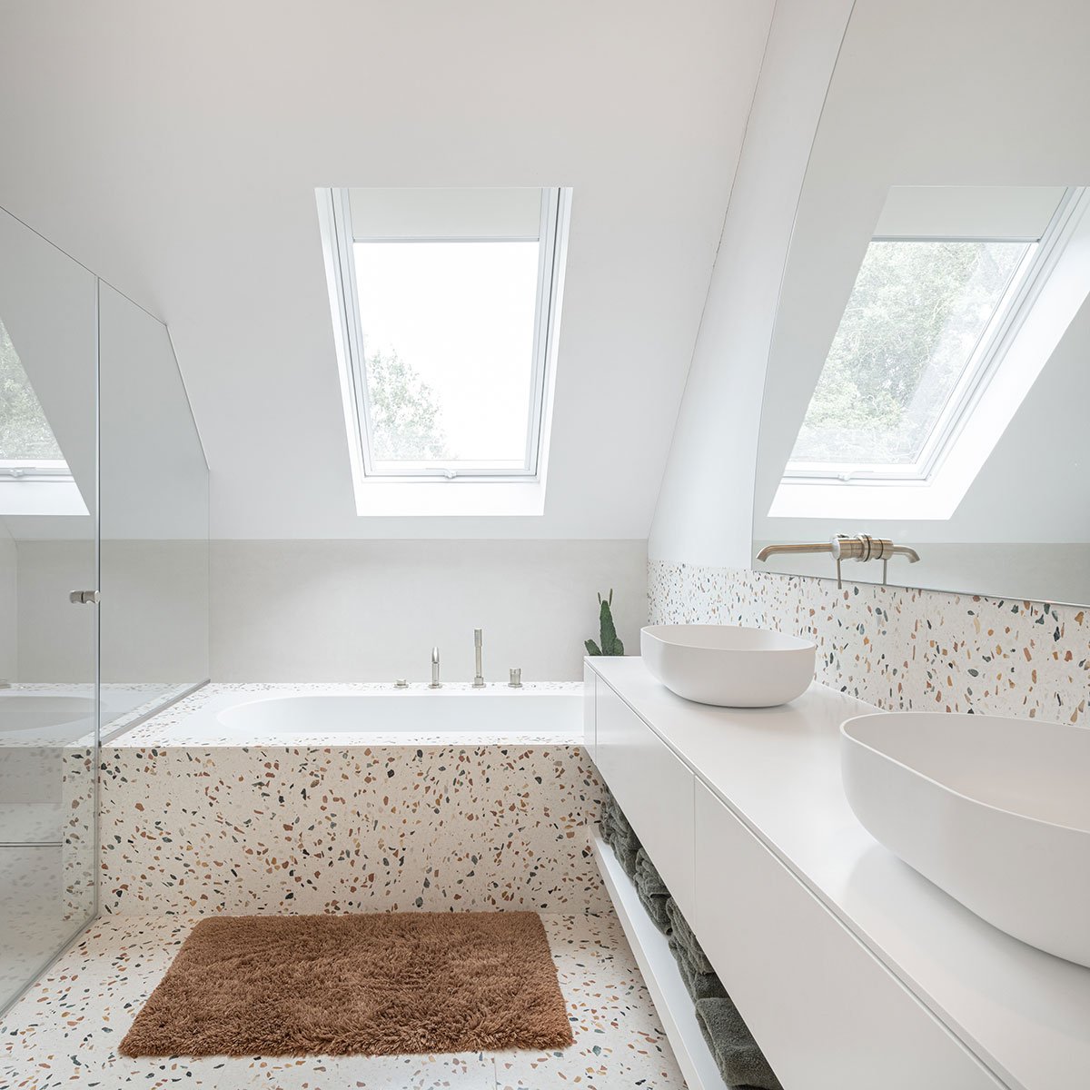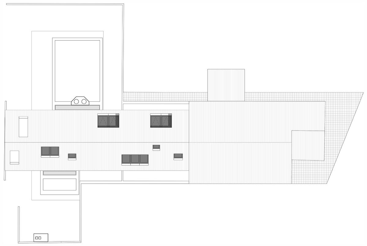 The inclined roof of the existing care home was extended so that it stands perpendicular to the new volume, which was designed as a concrete beam supported by diamond-shaped columns. The space under the roof houses various sleeping quarters, a bathroom, and several spacious storage rooms. In addition, a direct connection to the care home was provided so that, in case of an emergency, the residents have quick access to the bedroom on the ground floor. On the other side, the roof rests on the original exterior wall, which ensures that the new residents can enjoy a covered outdoor area in bad weather or in high temperatures. The bedrooms are linked by one long night hall. Several skylights of varying sizes provide sufficient light. Custom furniture on one side alternates storage space with lower benches where residents can retreat to read a book.