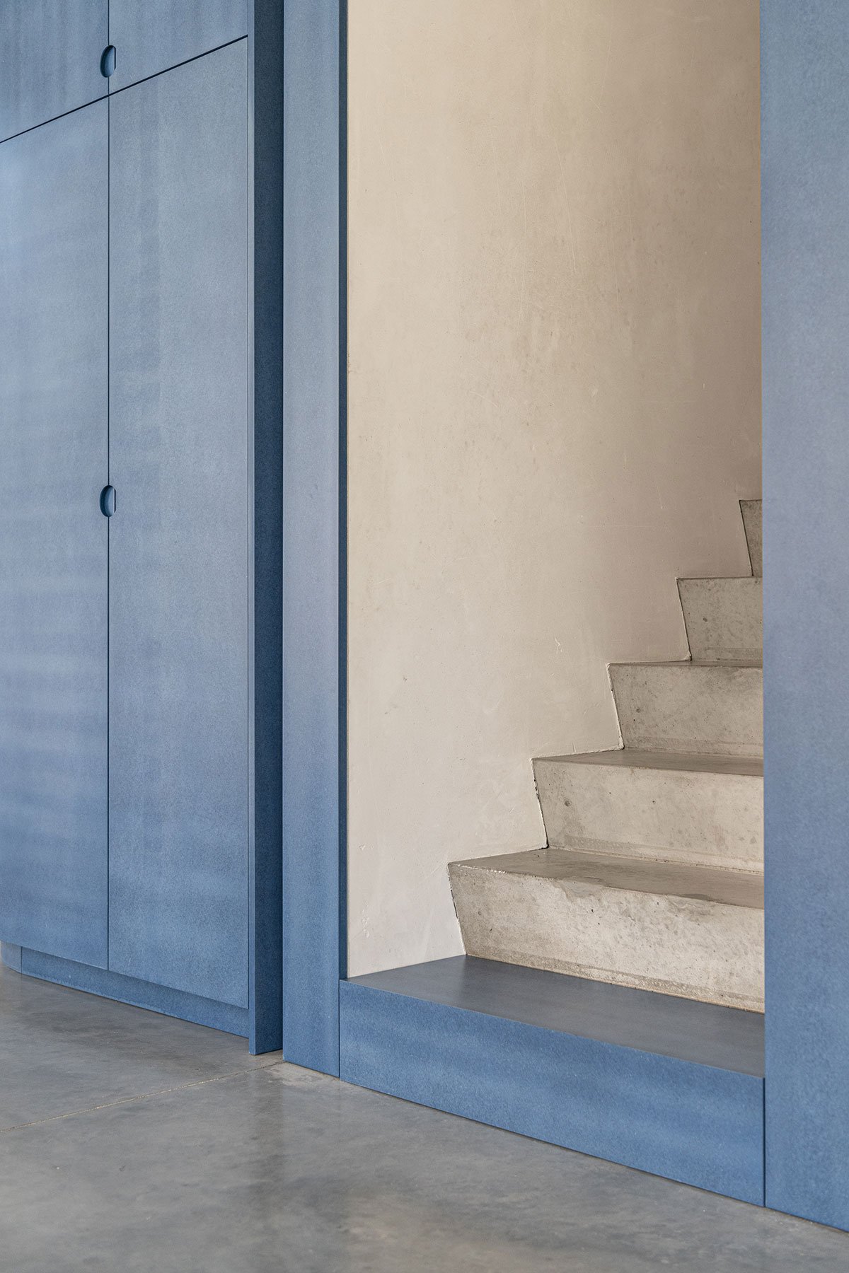 In the new house, the choice fell on a low-maintenance, polished concrete floor. In the sitting area – which houses the lounge and the play area – a contrasting sandblasted oak herringbone parquet was chosen. In the center of the house, we find a royal blue core, which on one side houses a toilet, a cloakroom, and a staircase, and on the other side is part of the kitchen and storage room. The rounded kitchen island, finished in a natural wood tone, has a peach-coloured countertop. Together with the brass accents, these give the whole a contemporary, luxurious look.