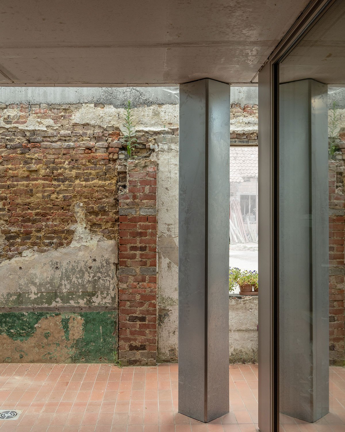 The exterior appearance of the existing house and barn was left unchanged. The classic bricks and roof tiles ensure that the farmstead retains its authentic character. The new volume, largely fitted with large windows, was given a bronze-colored aluminum finish. Structural elements in concrete and brown-red floor tiles provide the necessary contrast without disturbing the whole. The brutal and raw character of the old elements reinforces the delicate and clean look of the new residential entity.