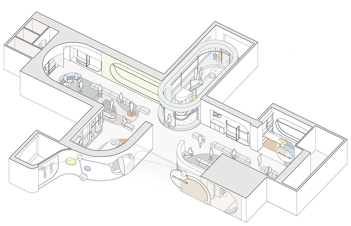 The inner storefront of the store appears as a smooth, porous surface containing a variety of displays for different scales of enticing products. This generates a more playful relationship between interior and exterior than a conventional display window. Near the arched entrance way, a mirrored half-sphere rotates, offering tantalizing glimpses of the interior, whilst reflecting the surroundings. To the far right, a vortex of LED screens forms a tunnel-like pop-up zone to the far right, arousing the curiosity of passers-by.