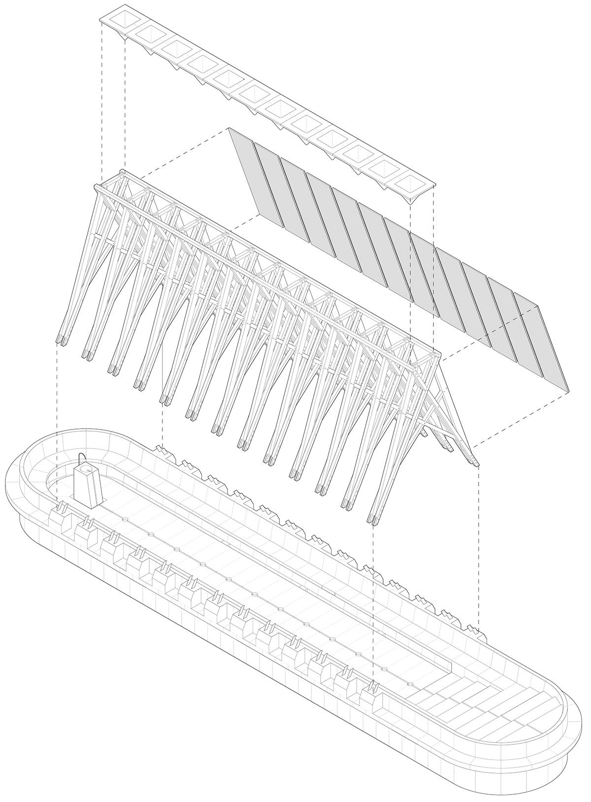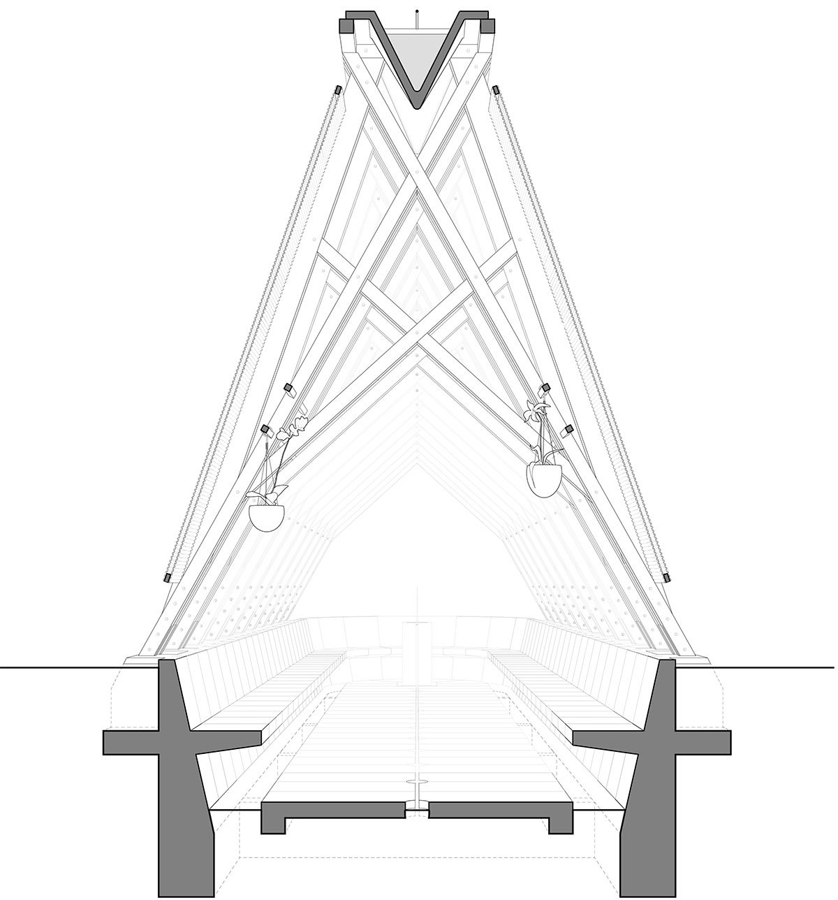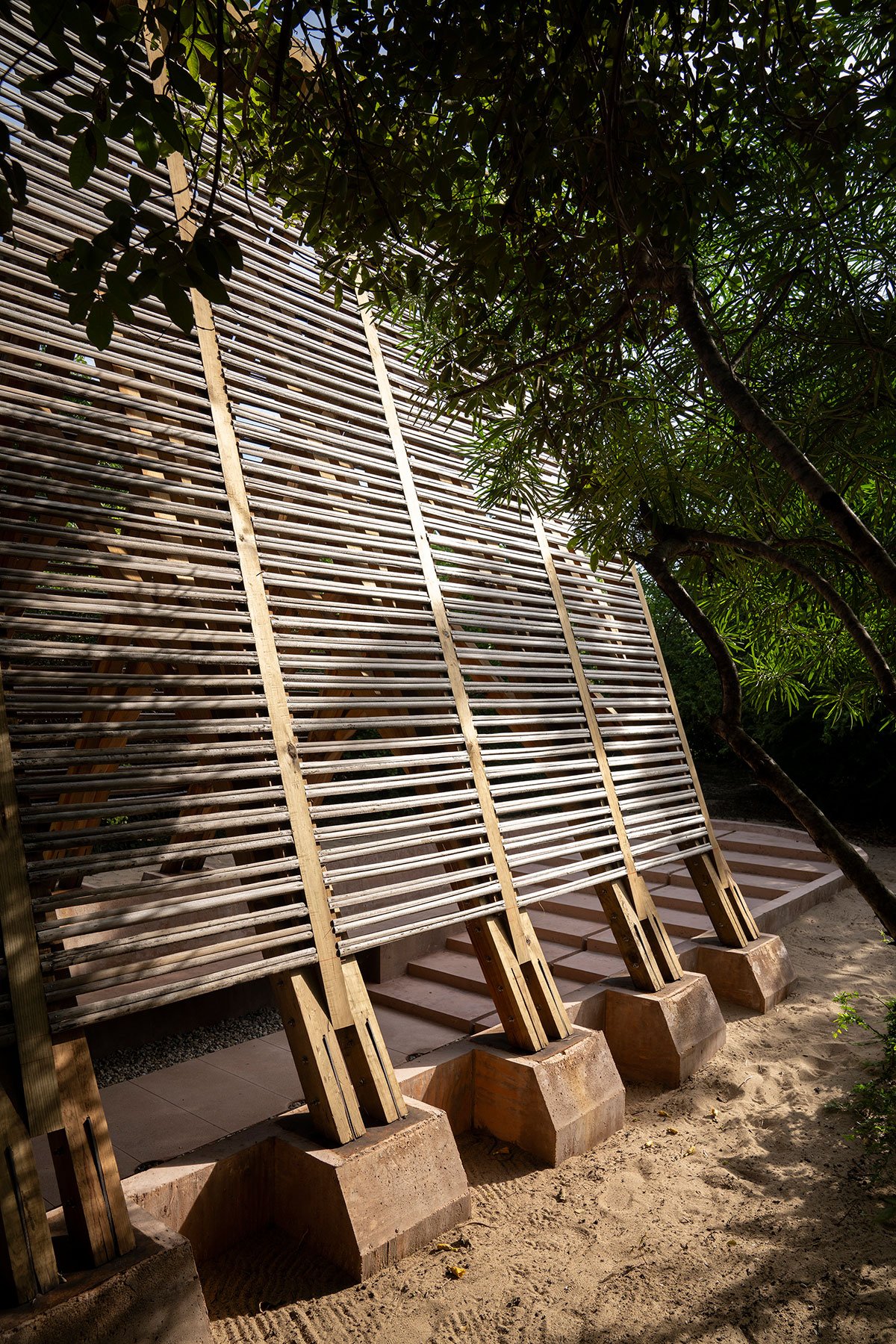 The main element that allows orchids to thrive is a humid environment. The intricate roots, branches, and leaflets gather water from the air, soil, and all surfaces. A series of pyramid-shaped, water-filled concrete basins rests at the top of a simple wooden structure. The basins slowly filter tiny droplets of water that fall to the ground, allowing for drip irrigation. The water is collected by concrete-based trays that remain permanently humid. The breeze and heat enable the orchids to drink water directly from the environment, eliminating the need for manual watering of the specimens.