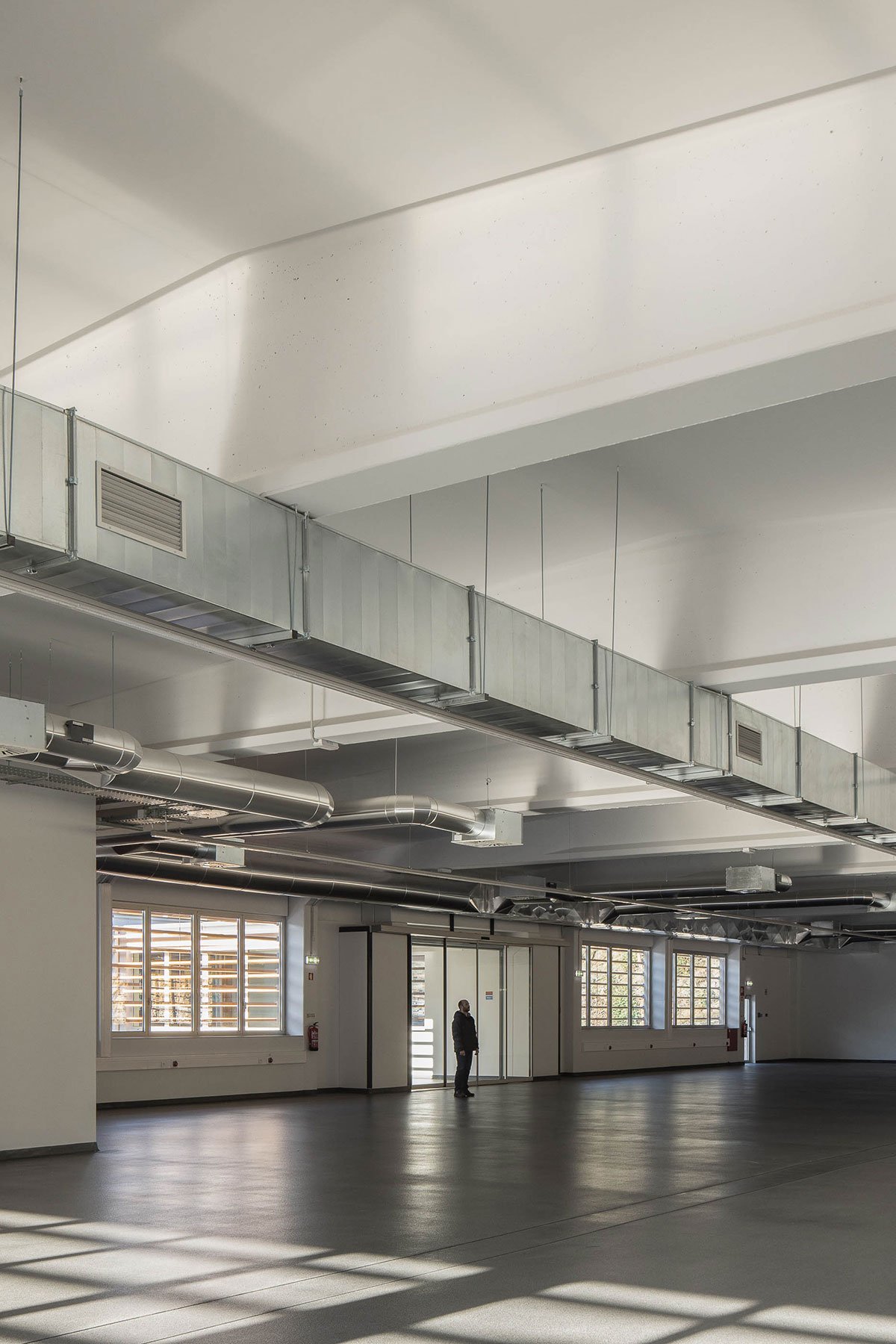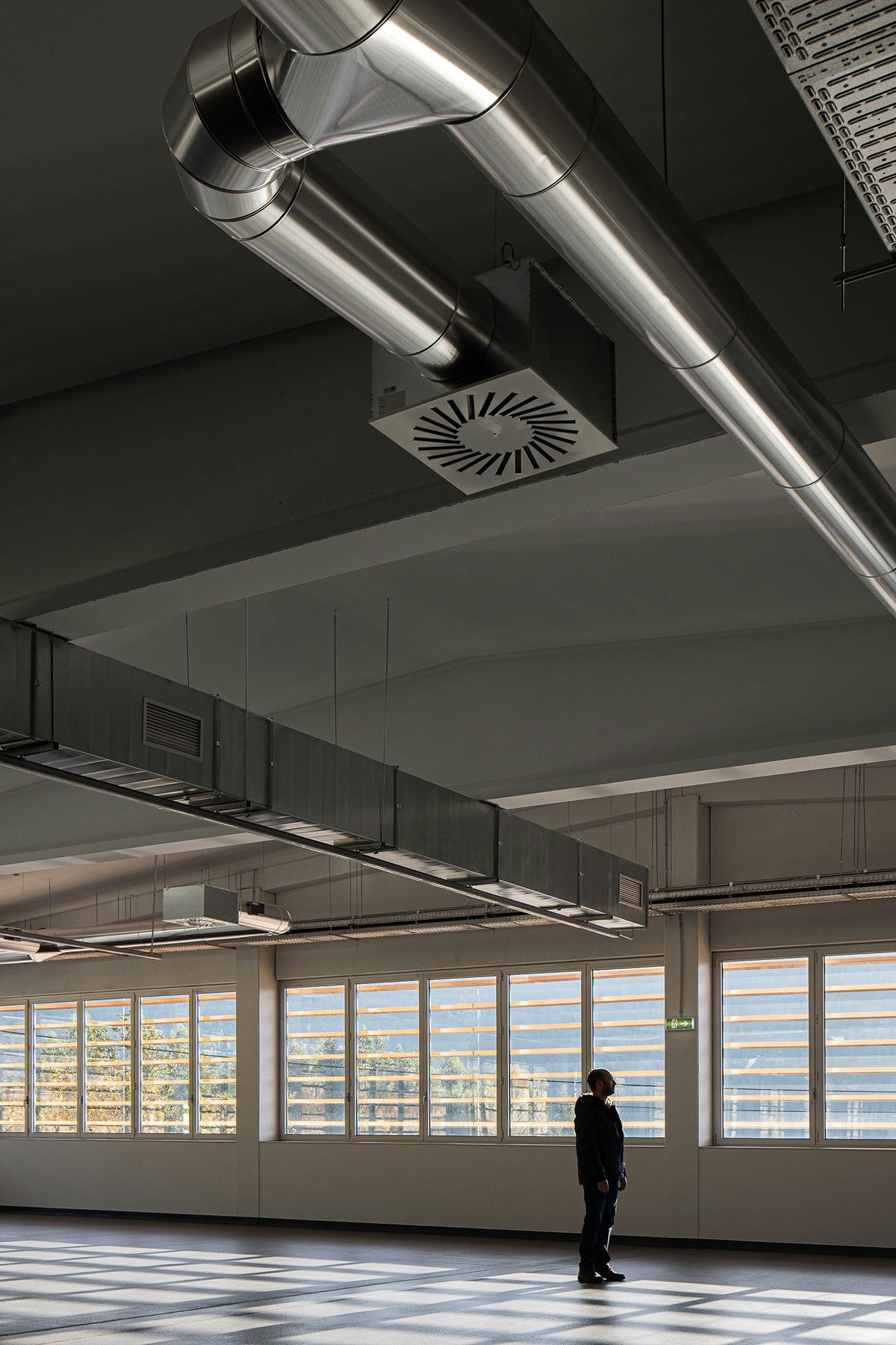 Excerpt: Oropol Industrial Unit by Em Paralelo aims to create a bold, distinct architectural approach between two buildings by utilizing blades for aesthetics, incorporating moments of shadow and controlled light, and also considering thermal concerns. Despite its wood-dominated veneers, the building seeks a symbiosis with the existing structure, transforming into a more neutral interior with a white-painted concrete structure.