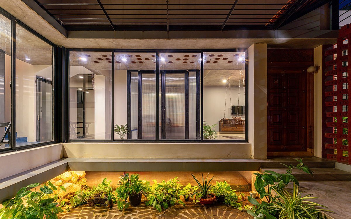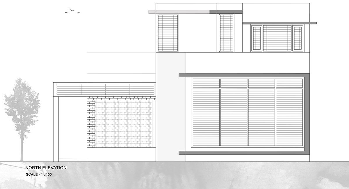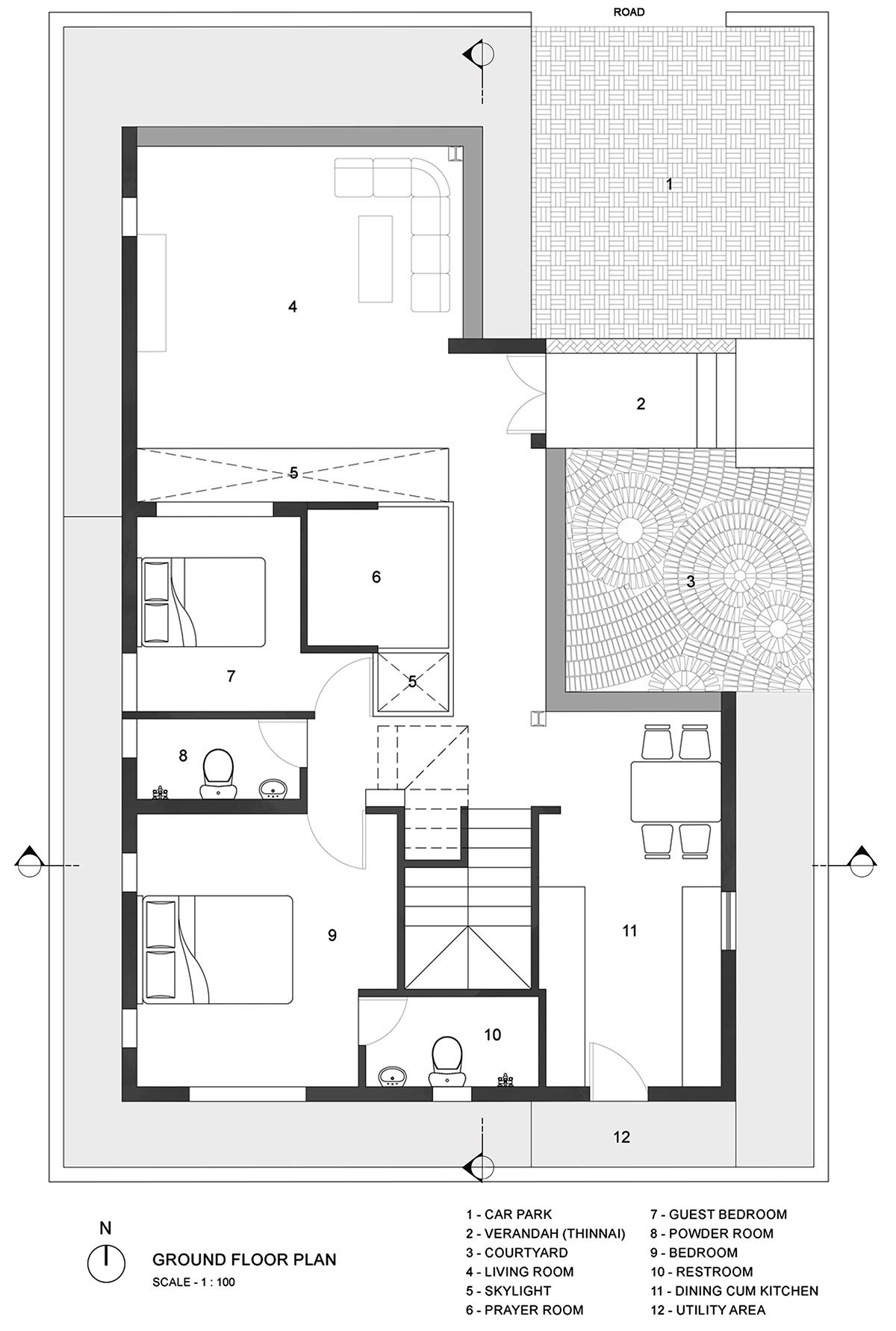 Inspired by traditional courtyard houses from the region, we consolidated nostalgia with modernism. The Thinnai (in Tamil verandah looking to the street) was intentionally made to look inward to the courtyard for privacy and to function as a social space exclusively for family. Locally sourced kiln bricks were used for a screen wall that separates the parking lot and courtyard. A weave pattern was devised to let in the northeastern sunlight whilst providing privacy and security from the street.