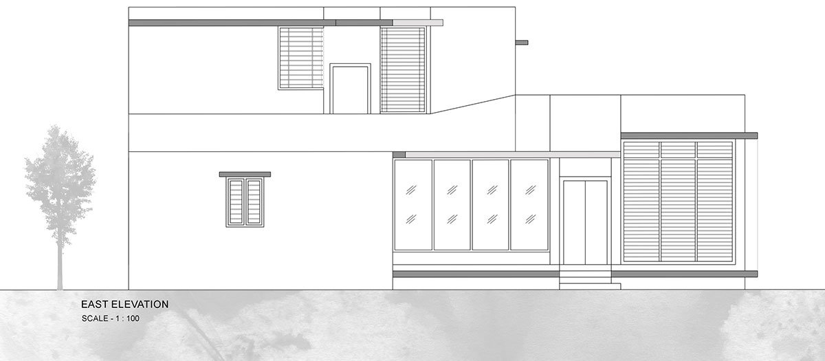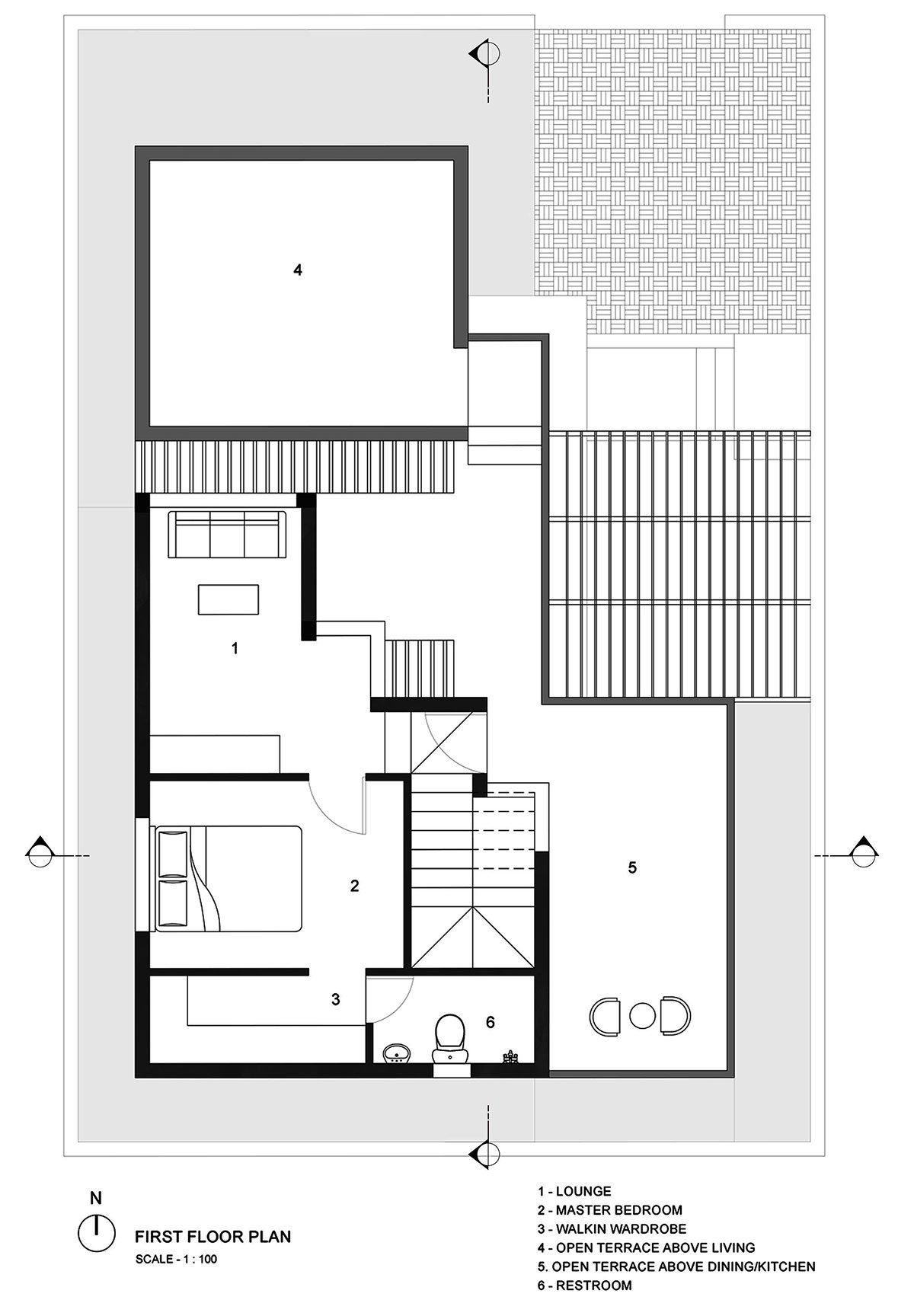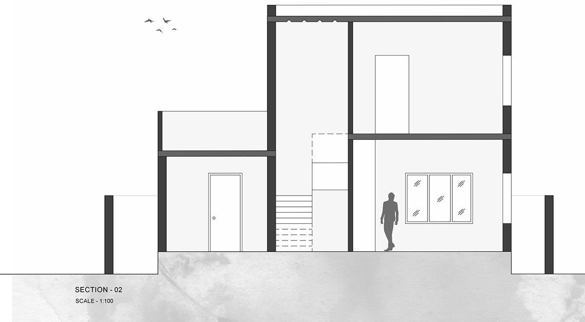 Living room ceiling is left exposed, with north and east walls full-height glass sliding windows highlighting no visible roof beams; they also contrast and balance with no opening south and west walls that shield from afternoon sun. With different levels of ceilings distinguishing the spaces, the filler slab ceiling using terracotta pots in the passage and stairwell breaks the monotony of space and cools the low-height ceiling. The design intends to blend natural elements with practical and economical ideologies that tastefully resonates within a space called home.