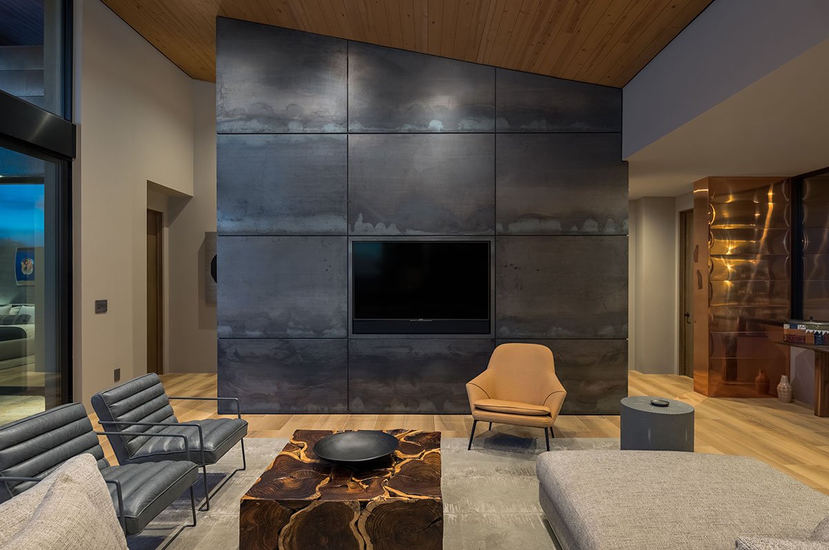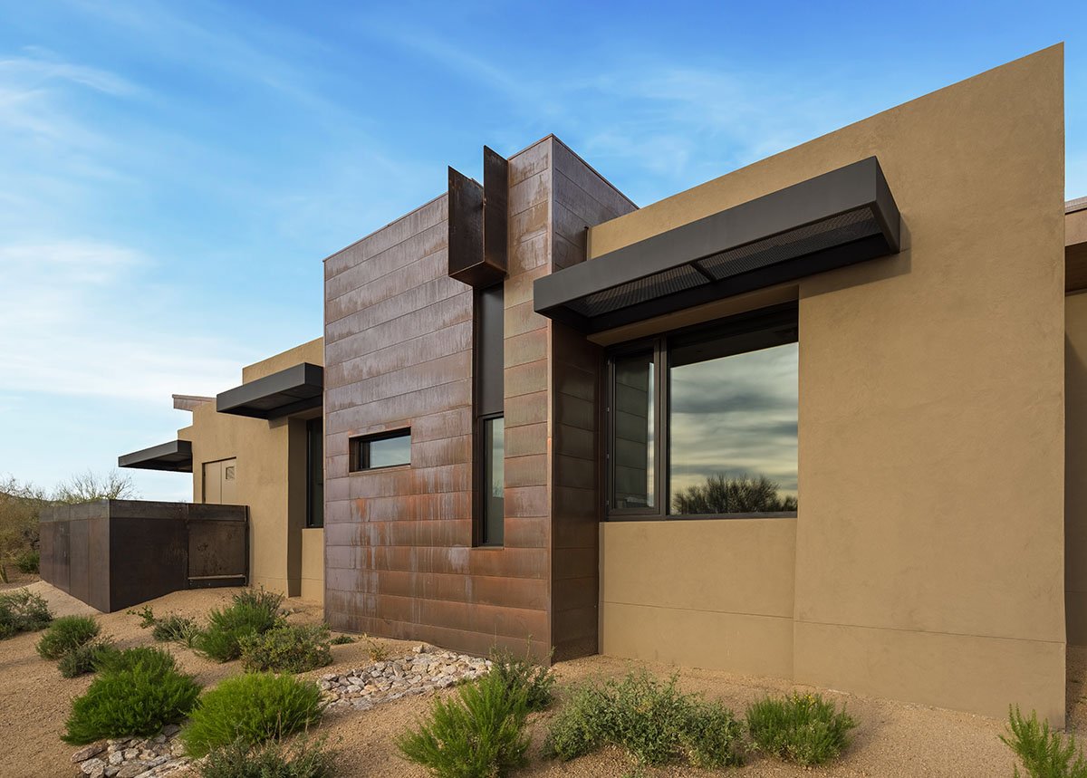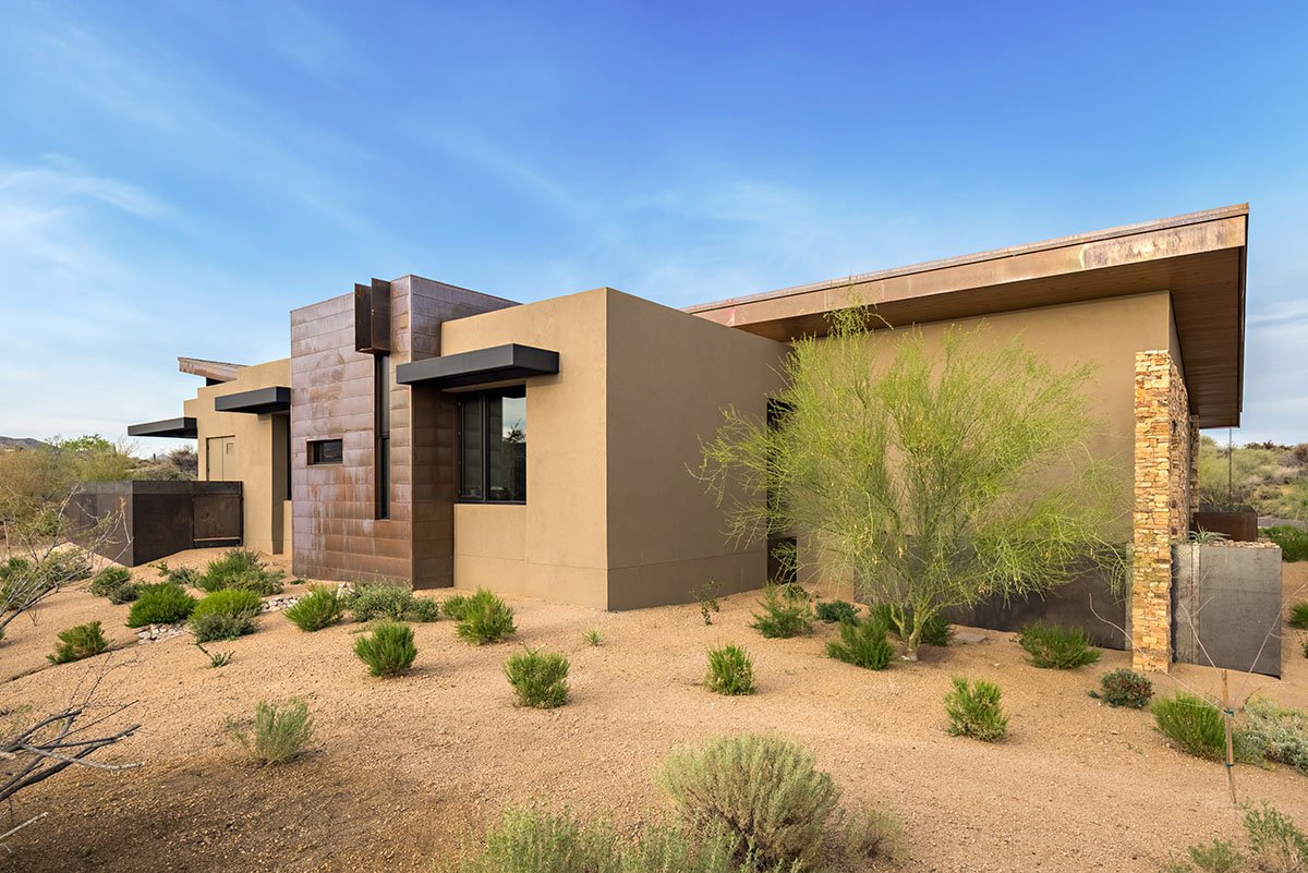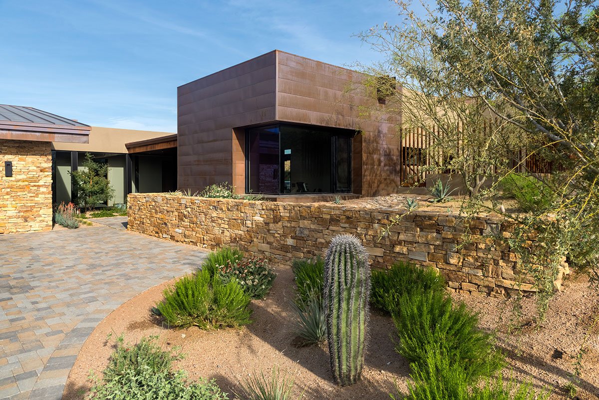 Materials including natural field stone, earth-toned stucco, naturally weathered copper and cold-rolled steel adorn this home defining its various interior spaces while forming a pleasing composition of color and form that feels as if scattered amongst the desert over time. The most “elemental” of all forms, the shed roof, protects this home from the harsh desert elements. Starting low at the front entry, defining a welcoming human scale, this simple, unifying form dramatically rises towards the sky revealing mountain views to the north.
