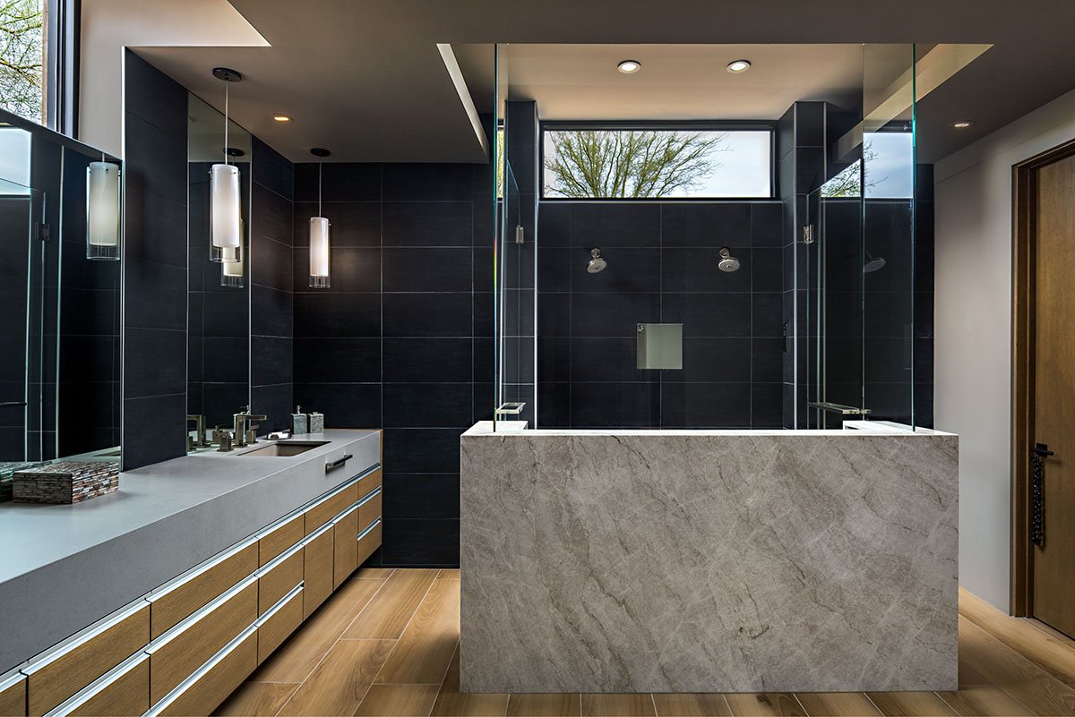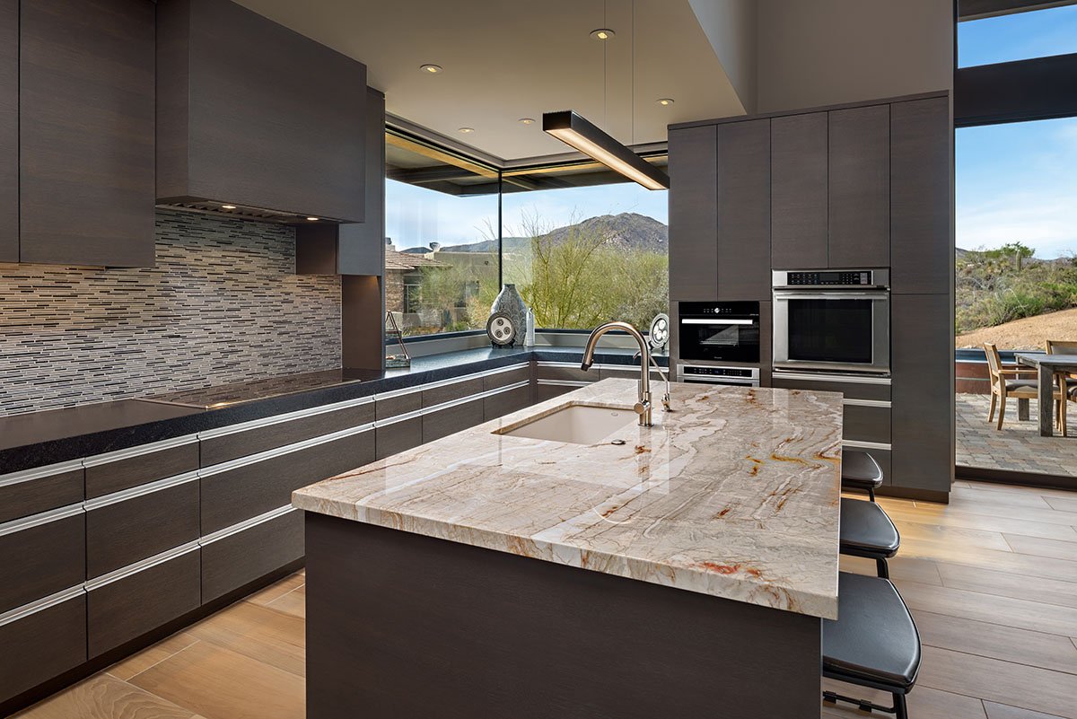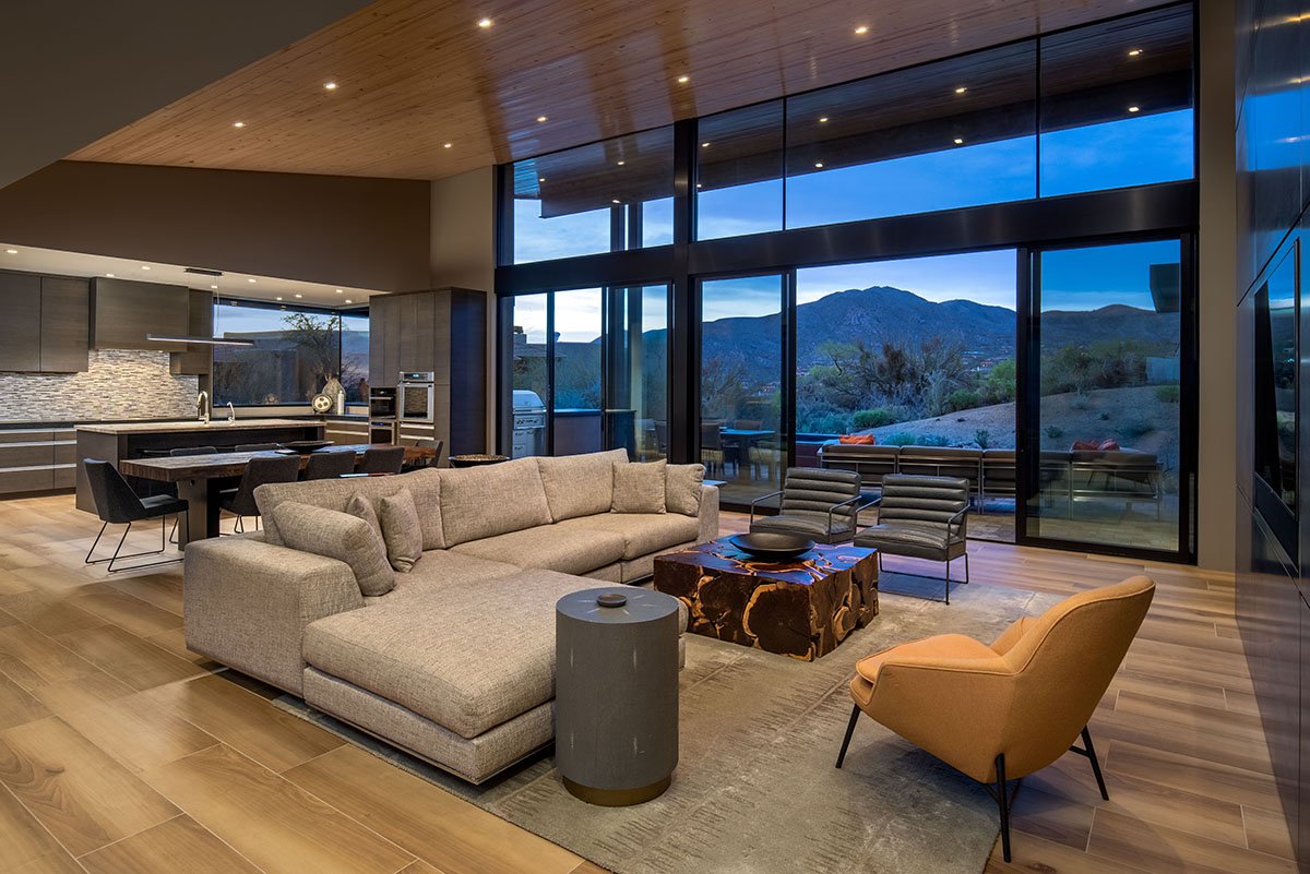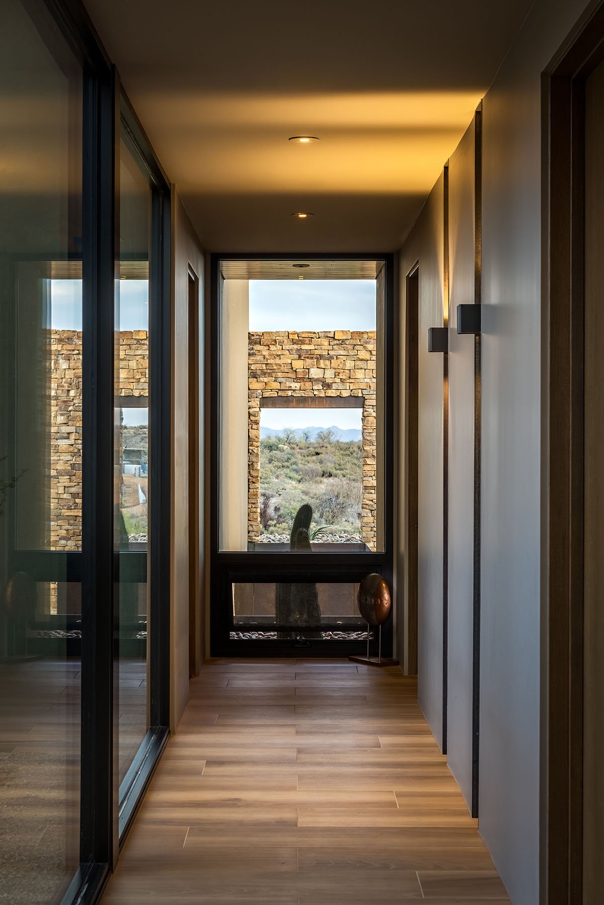Materials including natural field stone, earth-toned stucco, naturally weathered copper and cold-rolled steel adorn this home defining its various interior spaces while forming a pleasing composition of color and form that feels as if scattered amongst the desert over time. The most “elemental” of all forms, the shed roof, protects this home from the harsh desert elements. Starting low at the front entry, defining a welcoming human scale, this simple, unifying form dramatically rises towards the sky revealing mountain views to the north.