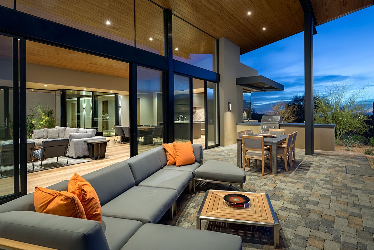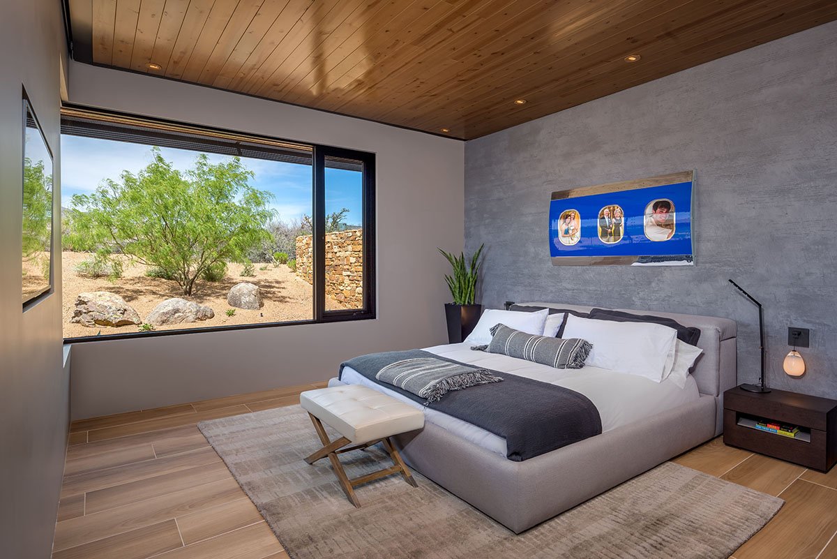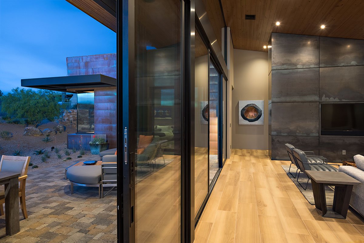 Furthering this homes sensitivity to the natural terrain, this single level home, designed for the homeowners to age in place, burrows into the gentle swale of the site rather than sitting proud upon it. Copious amounts of glass ensure that nature is always on display while eyebrow-like overhangs shade these penetrations from the desert sun. Interior materials such as wood ceilings extend to the outdoor living spaces while exterior materials such as copper and cold-rolled steel extend to the interior further blurring the delicate line between inside and out. This is a home not simply in the desert, but of the desert.