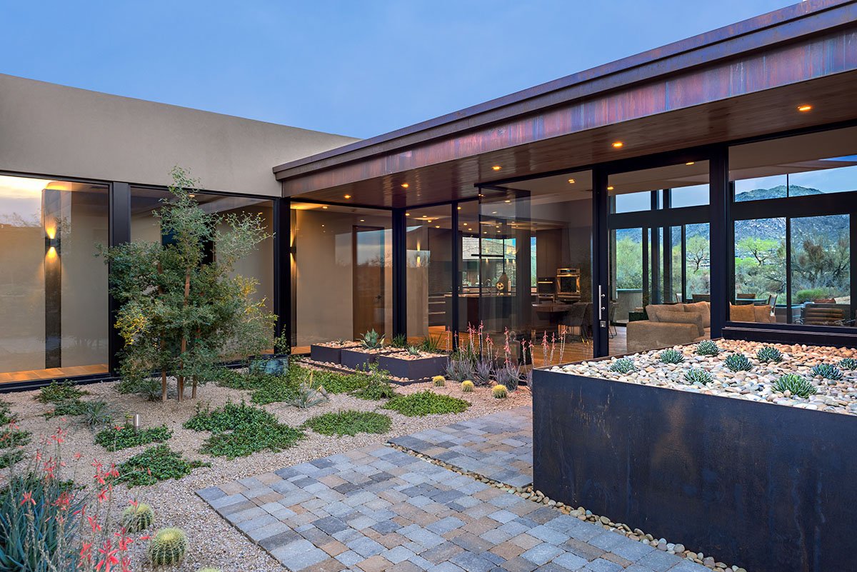 Excerpt: Painted Sky Residence, designed by Kendle Design Collaborative, is a home of modern simplicity, void of cliché ornament or stylistic language, a home that is as timeless as its natural desert surrounding. Our response was to organize the home about an enclosed courtyard. This traditional southwestern architype provides privacy and shelter from the elements while drawing light to the interior. Materials including natural field stone, earth-toned stucco, naturally weathered copper and cold-rolled steel forming a pleasing composition of color and form.