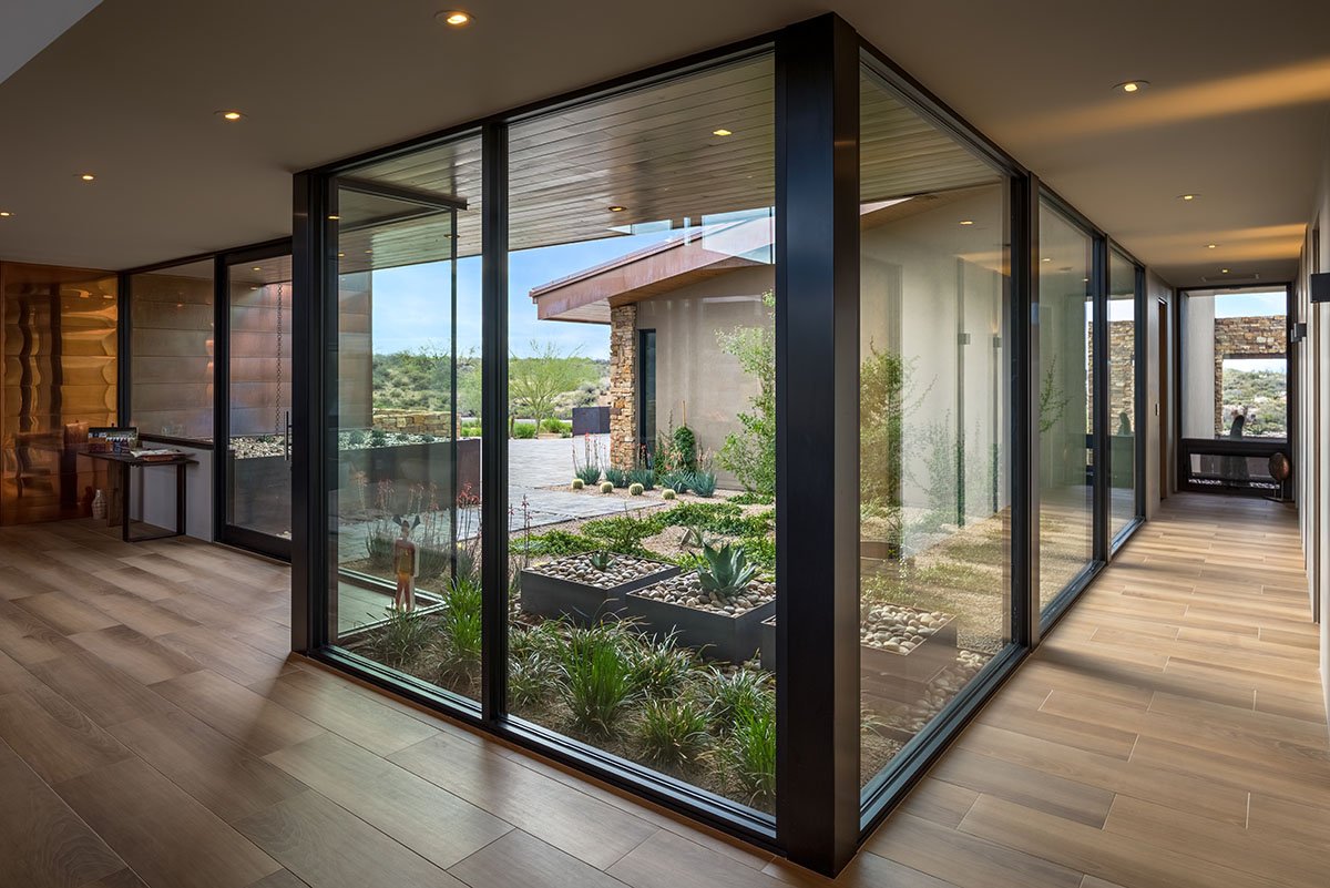 [Text as submitted by architect] Our client for Painted Sky requested an “elemental home,” a home of modern simplicity, void of cliché ornament or stylistic language that often looks dated in just a few years, a home that is as timeless as its natural desert surrounding. Our response was to organize the home about an enclosed courtyard, a traditional southwestern architype that provides privacy and shelter from the elements while drawing light to the interior. Walls of glass surround this courtyard such that interior social and circulation spaces benefit from its controlled views of nature while accessing its soft reflected daylight. Private areas, such as bedrooms and bathrooms, all with their own focused views, are reached via pathways that embrace the courtyard or focus on framed views of nature.