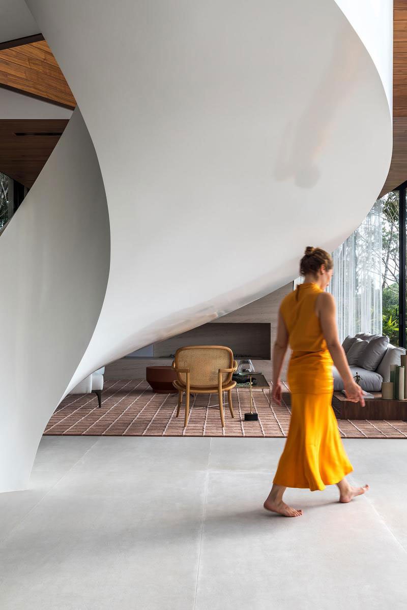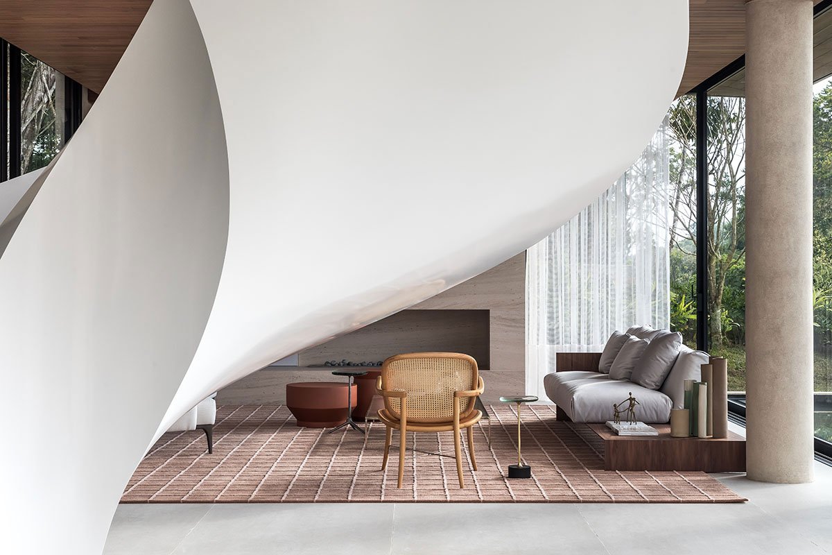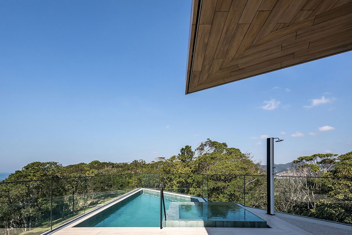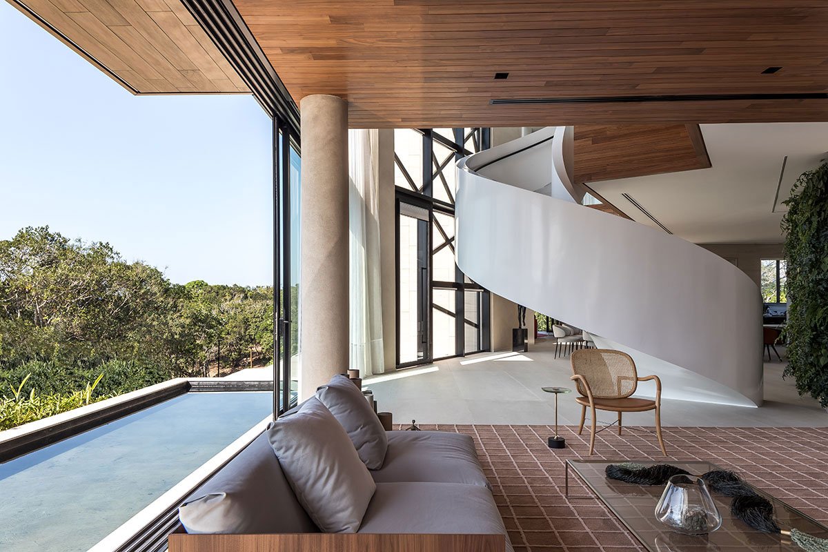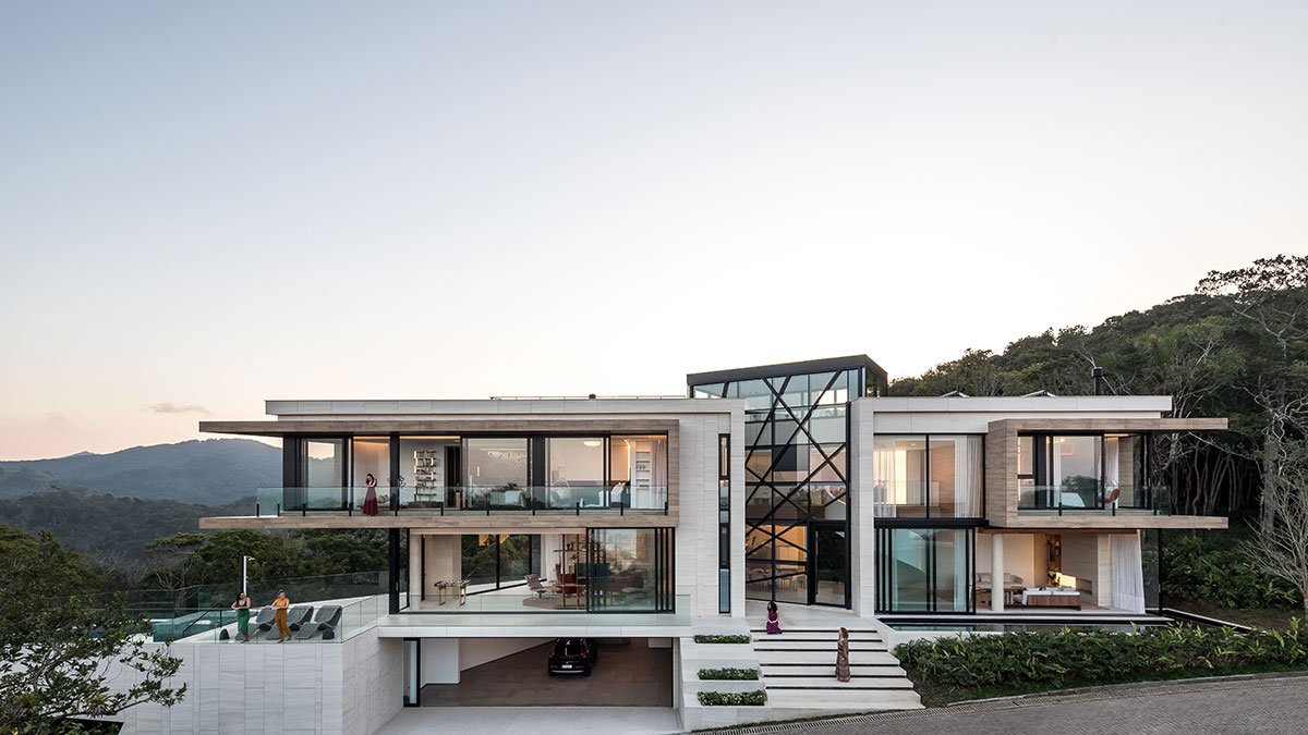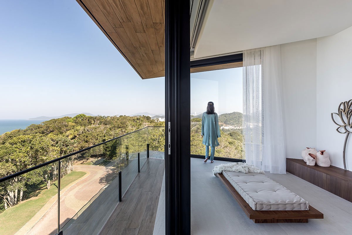 [Text as submitted by architect] The residence was designed for a family in search of a new lifestyle in the port city of Itajaí (SC). An atmosphere of belonging and identity, a panoramic view of the sea, elements of Brazilianness and an ecofriendly construction were some of the premises of the project. The terrain is located In the middle of an Atlantic forest hill facing the sea. It was carefully selected for this great project by having one of the most privileged views of the sea. The attention to a delicate architectural insertion resulted in an implantation that followed the challenges of the extremely rugged topography and the closed angle on the corner where the two fronts of the terrain meet — precisely the highest visual point of the place, with a beautiful panoramic view.
