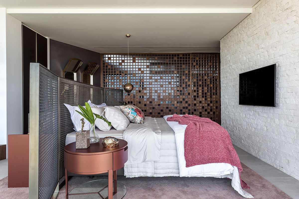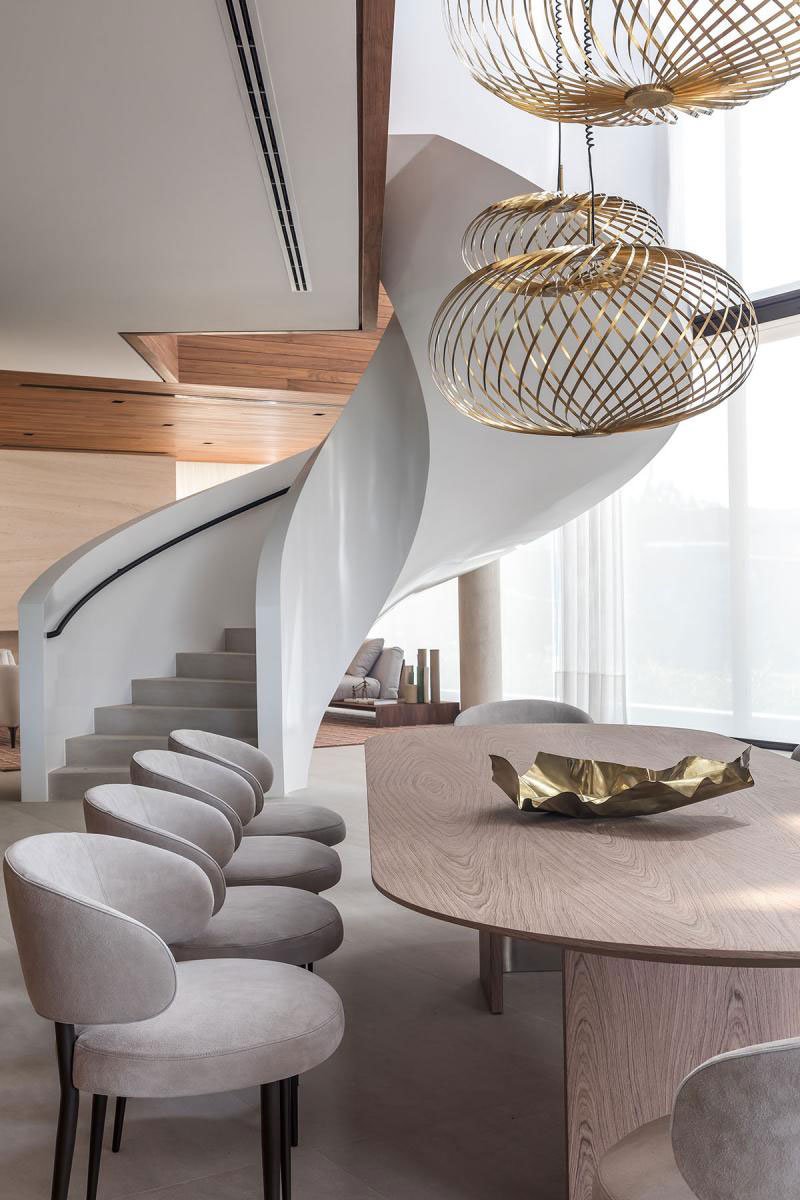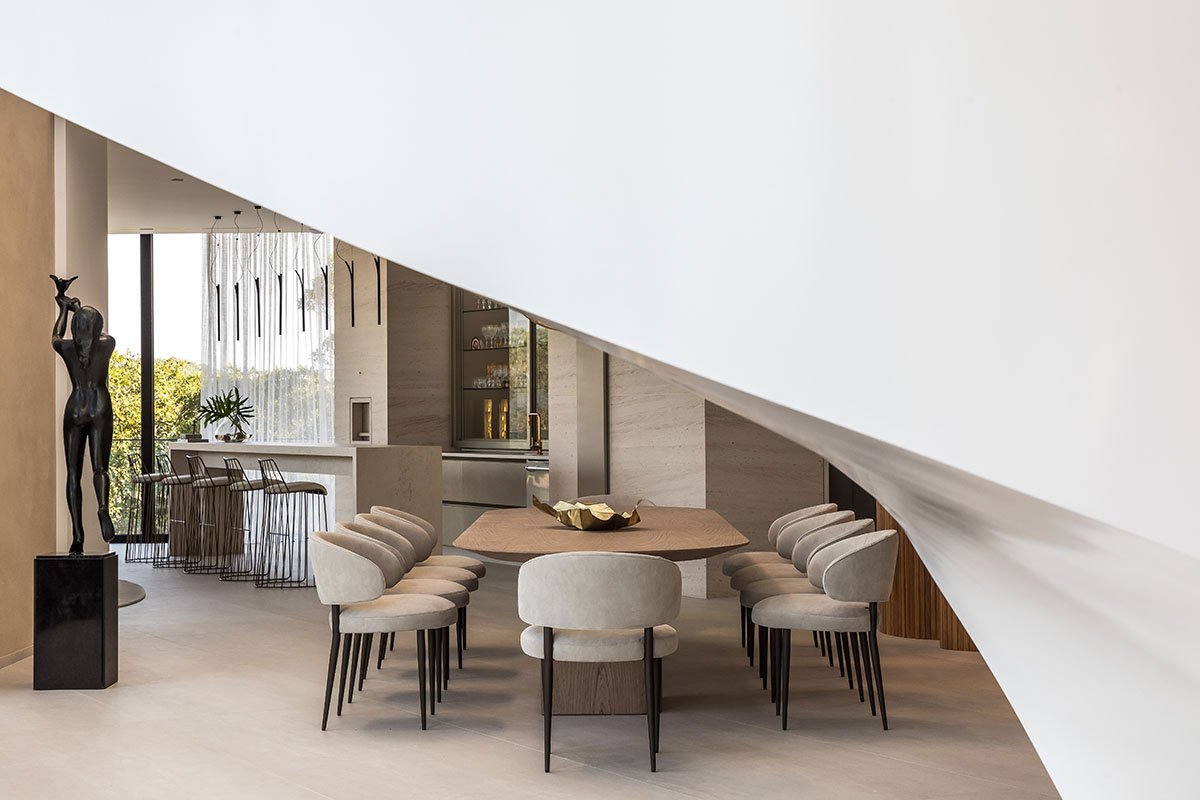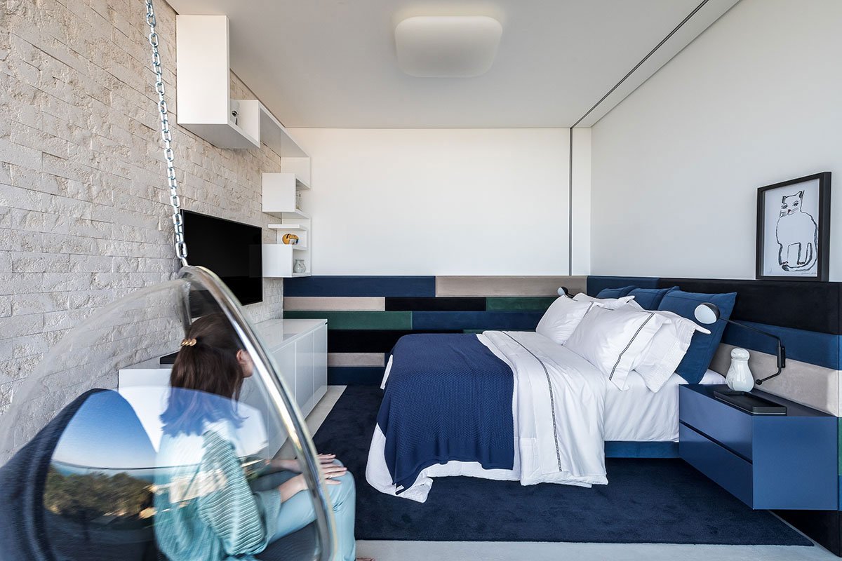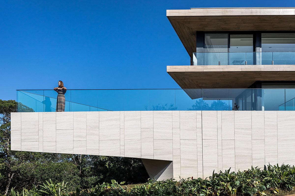 We developed an architecture of highly visual impact for the facade, bringing the element of glass and the boldness of the vertical line to demarcate the main access and dialogue with the purity of the horizontal lines, highlighted in the design of the project. In response to the challenge of occupying the tip of the land, we designed the pool that comes loose to make room for a beautiful garden below. The pool swing, promoted by the unusual and surprising structure of a single fixation point, receives a parametric polishing executed in limestone.