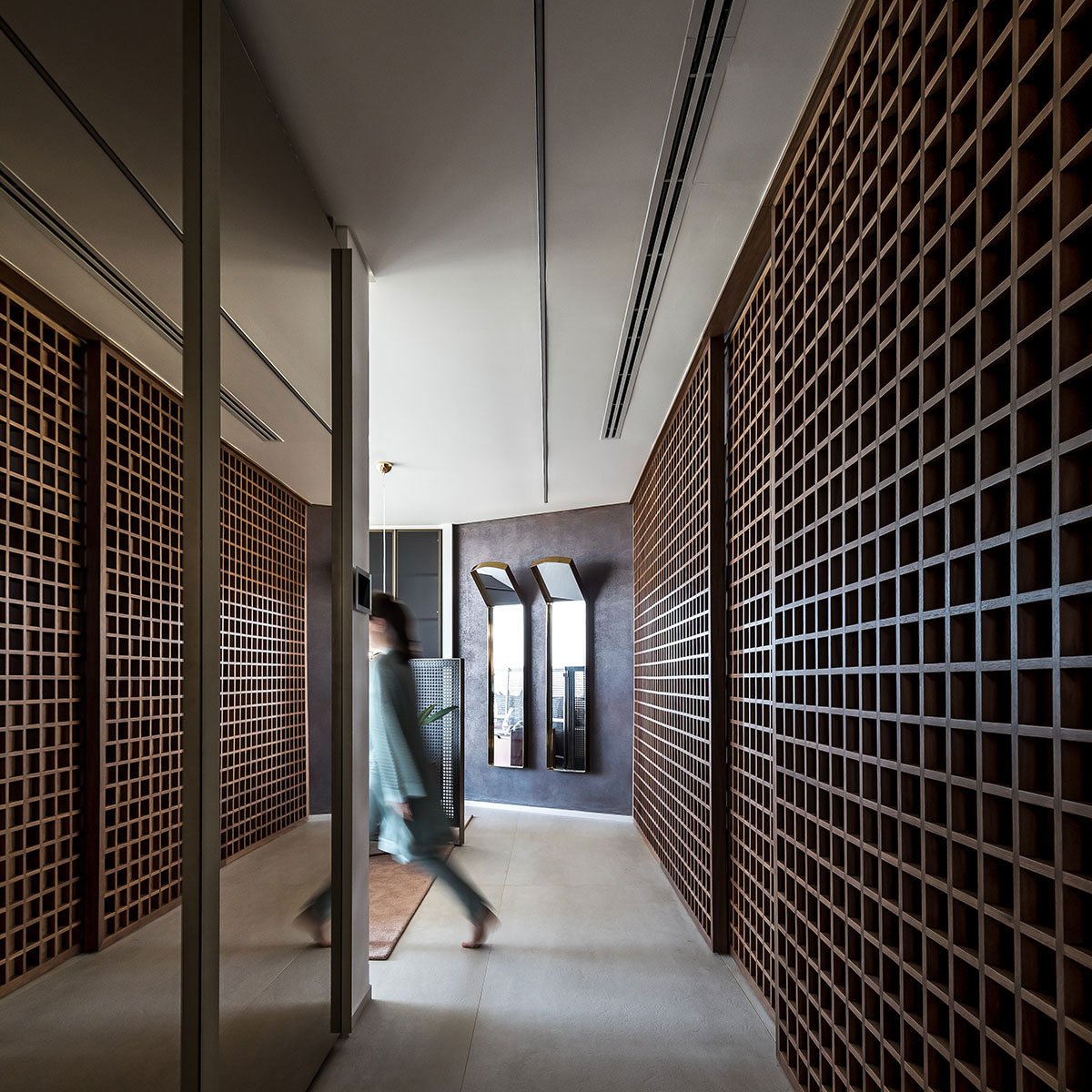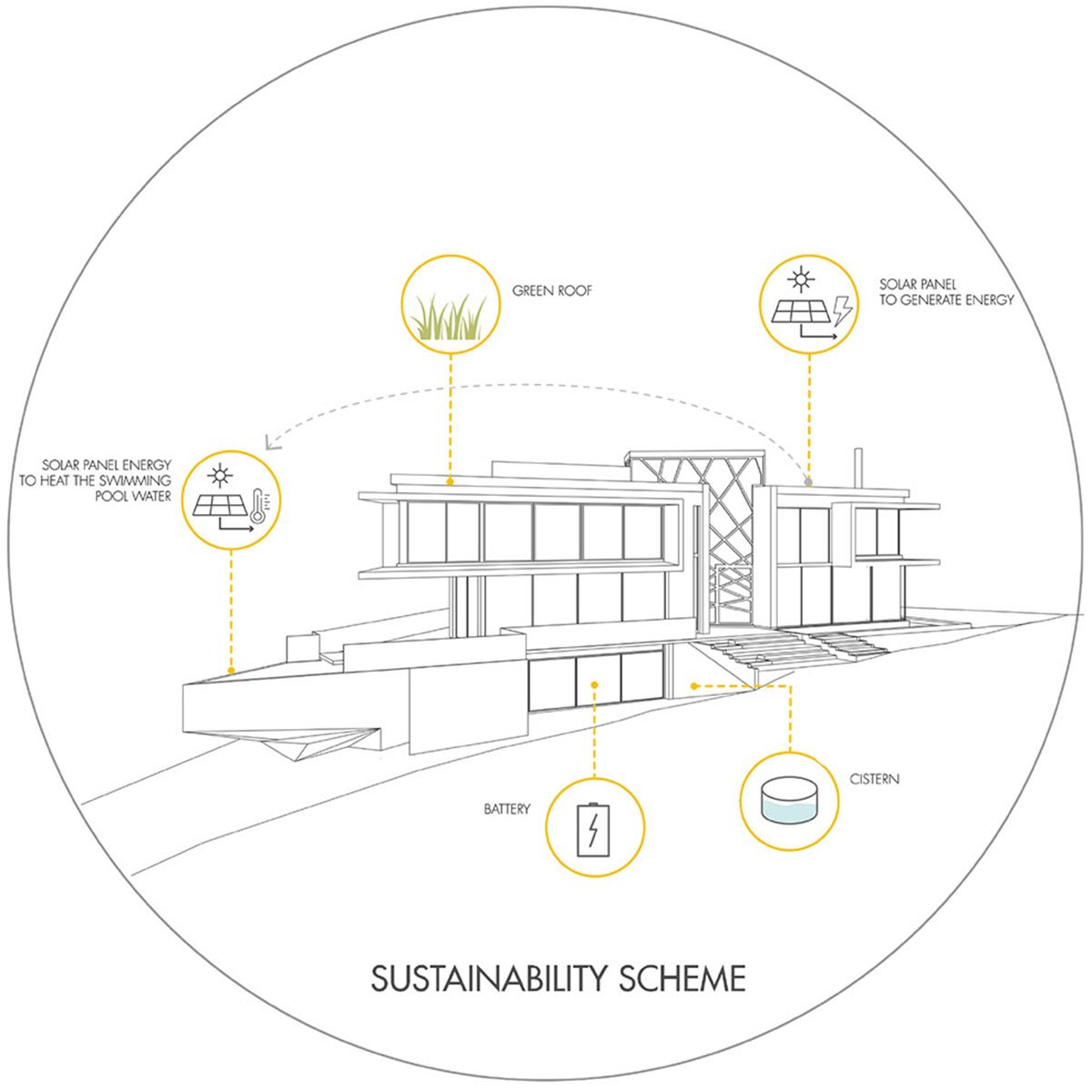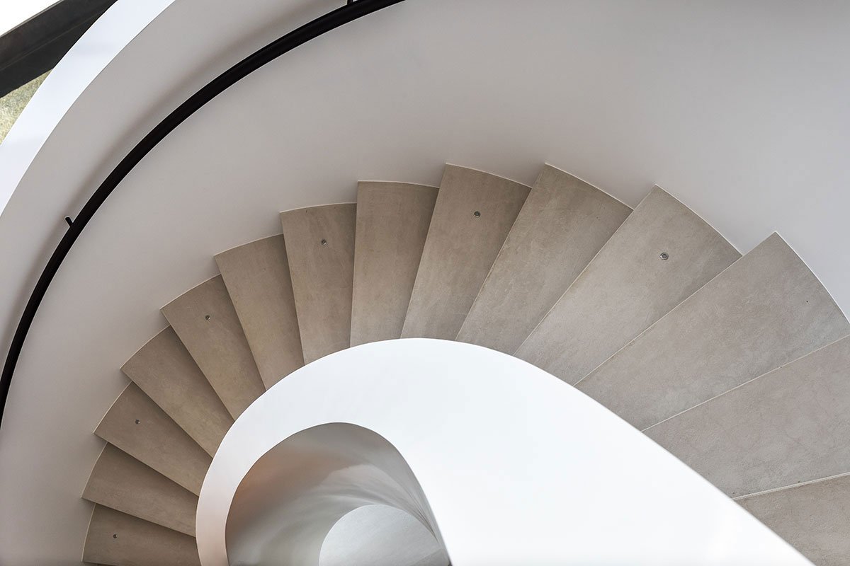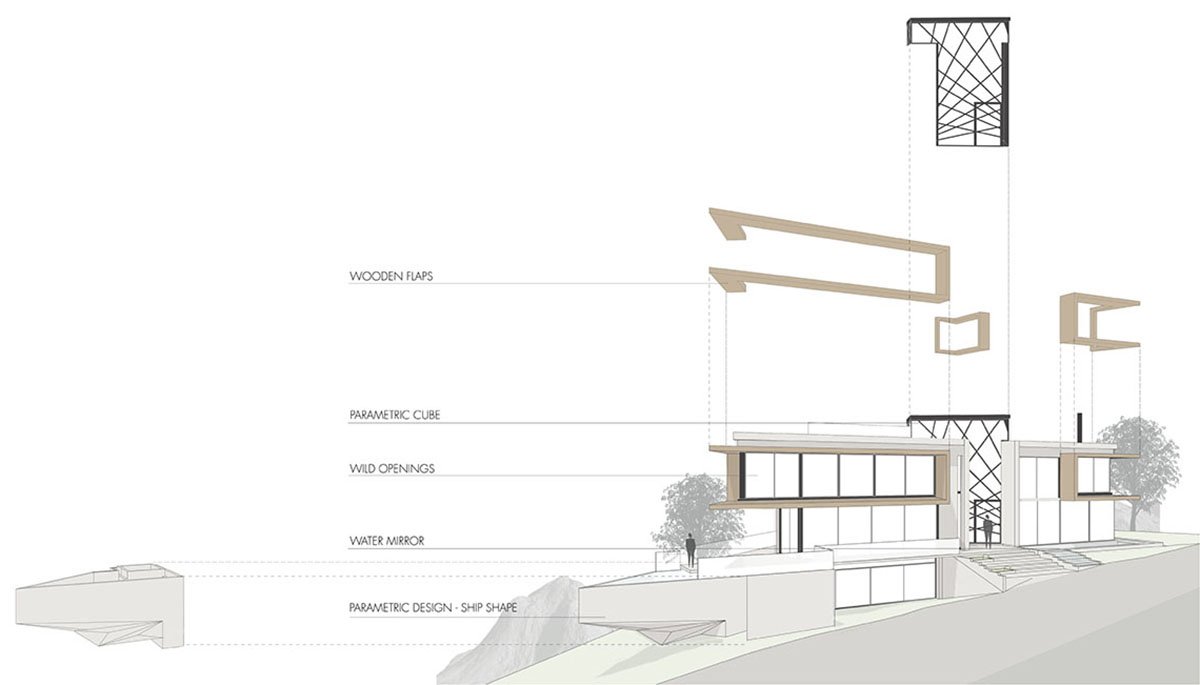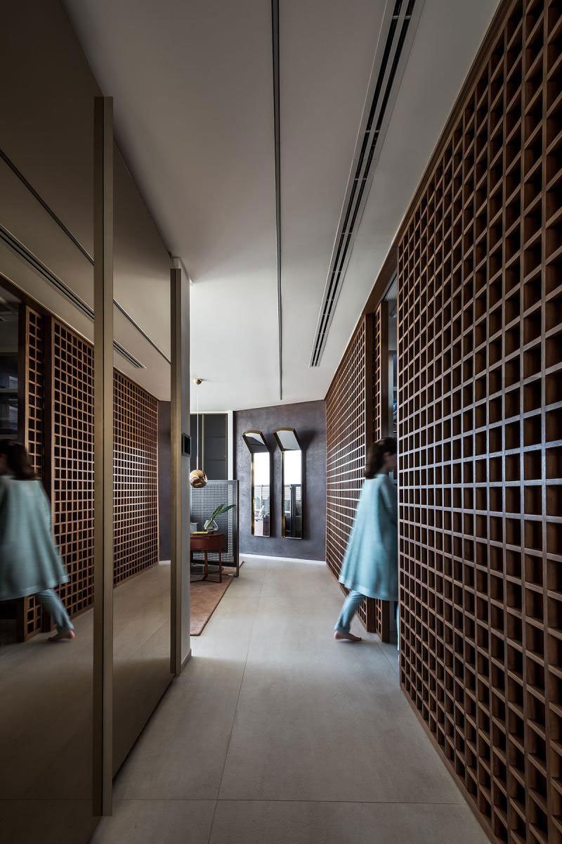 We developed an architecture of highly visual impact for the facade, bringing the element of glass and the boldness of the vertical line to demarcate the main access and dialogue with the purity of the horizontal lines, highlighted in the design of the project. In response to the challenge of occupying the tip of the land, we designed the pool that comes loose to make room for a beautiful garden below. The pool swing, promoted by the unusual and surprising structure of a single fixation point, receives a parametric polishing executed in limestone.