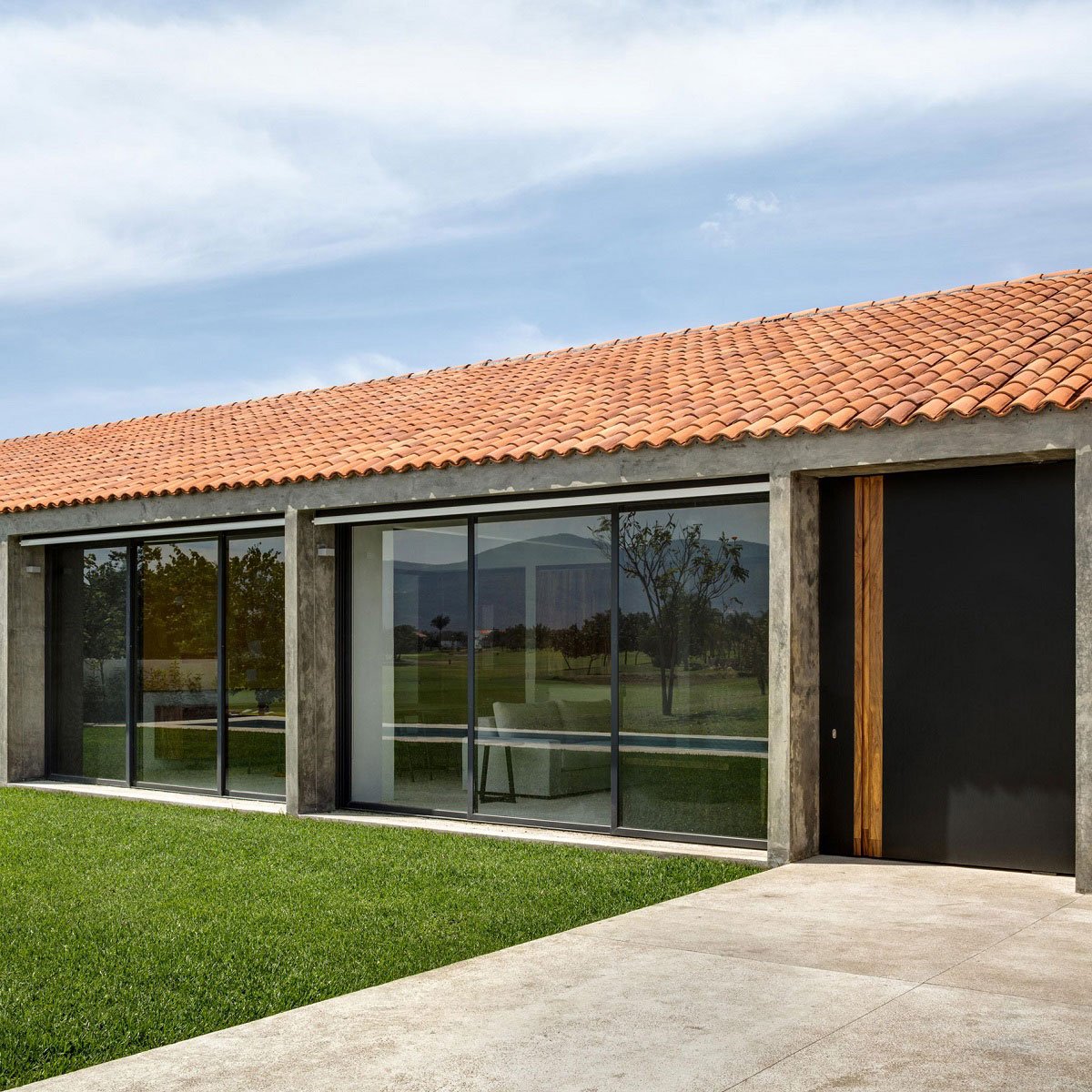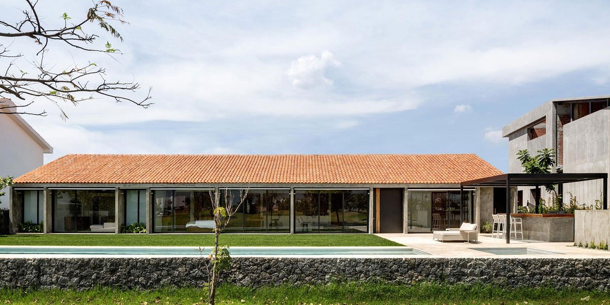 [Text as submitted by architect] Paraiso is a weekend house within a golf course in a residential area near Cuernavaca, Morelos. It stands on flat ground, neighbouring two-story houses on both sides. Our main design intention in this project was to create the sense of openness on its rear side, as it enjoys of a panoramic view of the golf course and a mountain chain on the horizon. The design presents a single-story house with two major openings; one facing south located on the street, and the other facing north on the backside where all outdoor and most social activities take place. Here, low-rise vegetation and trees, instead of walls or fences, mark the house’s boundaries by precisely blurring any limit between the golf course and the patio.
