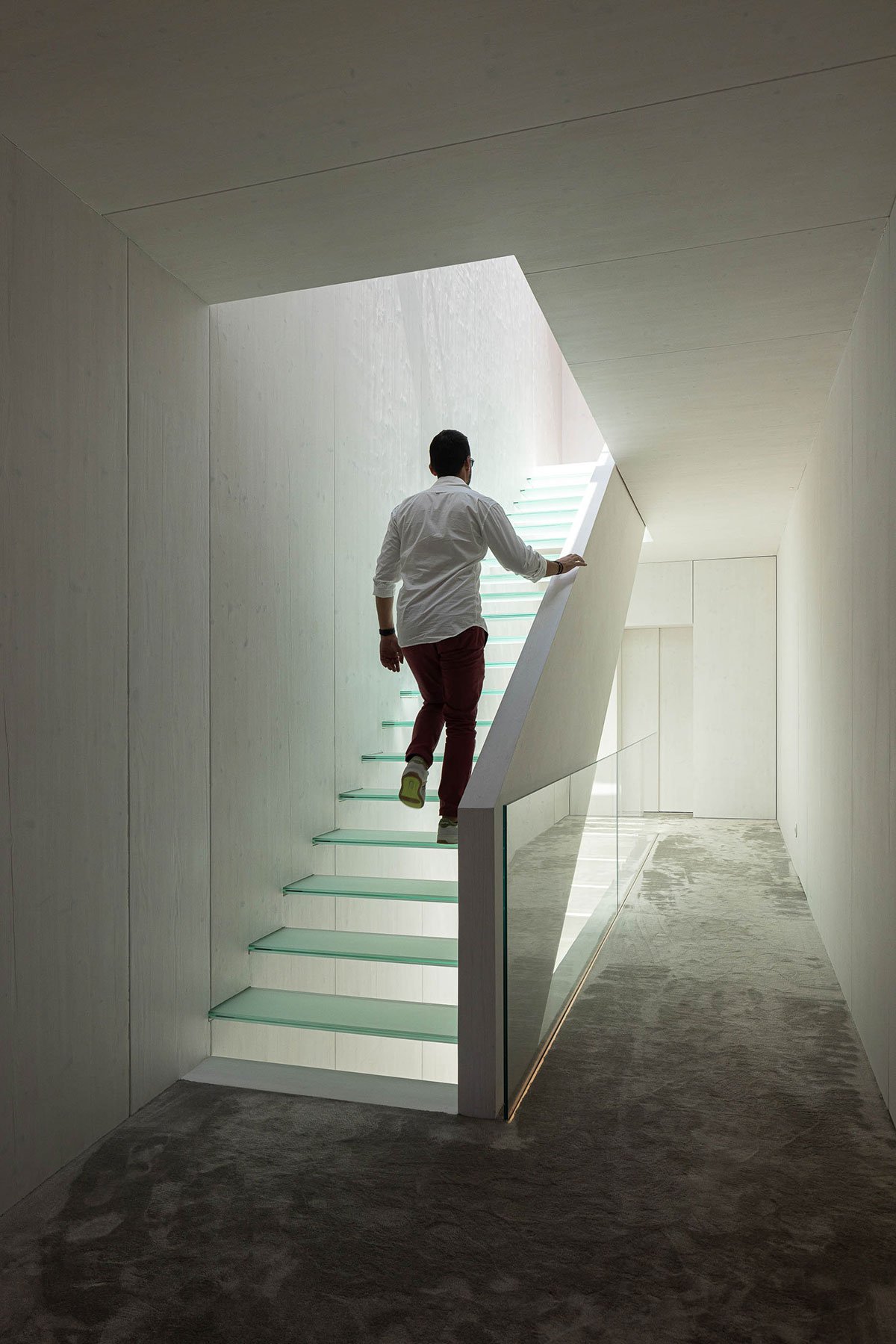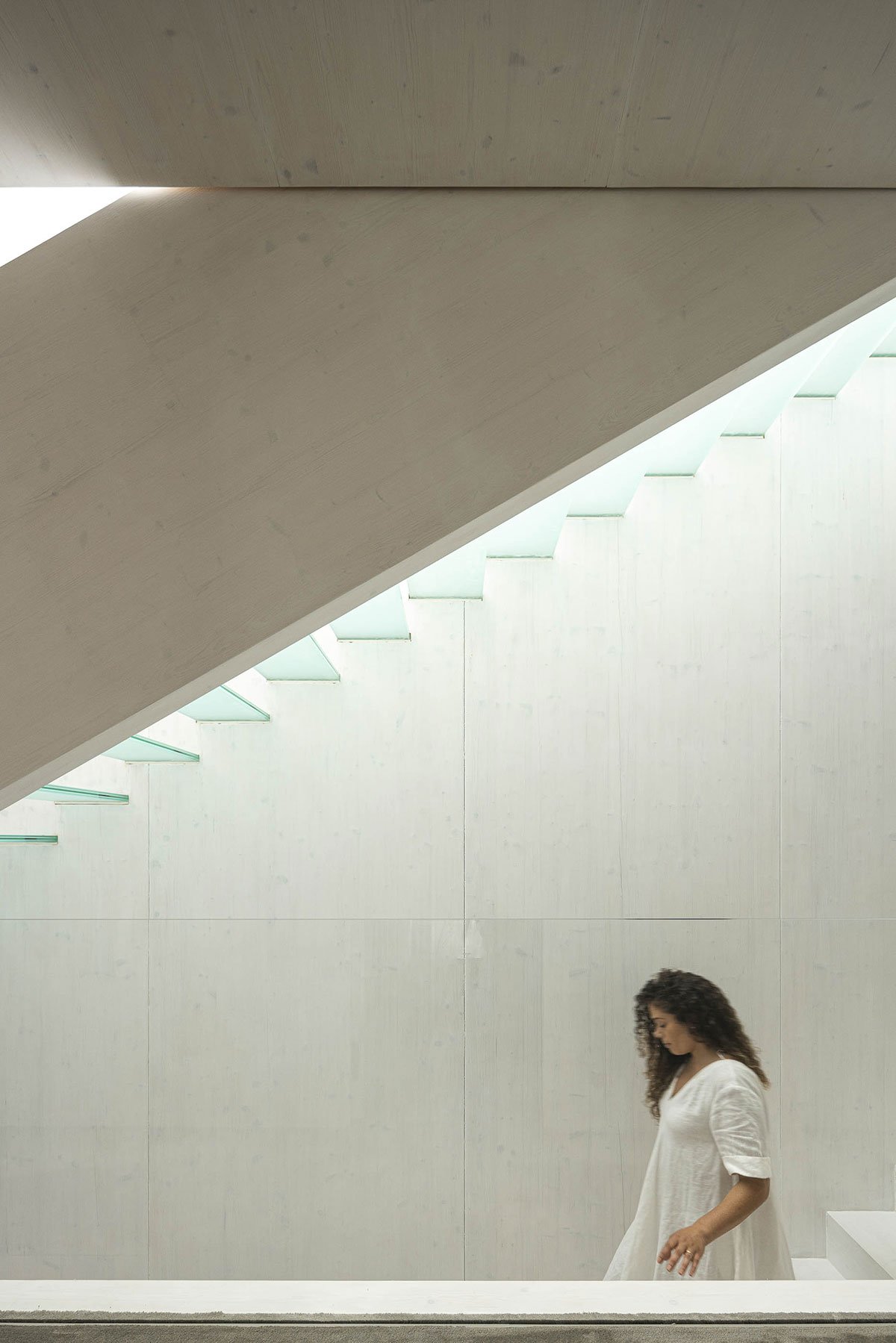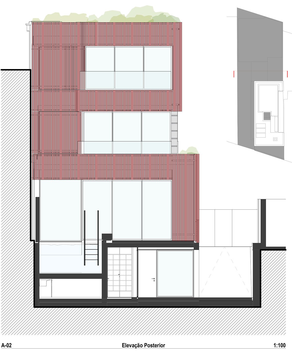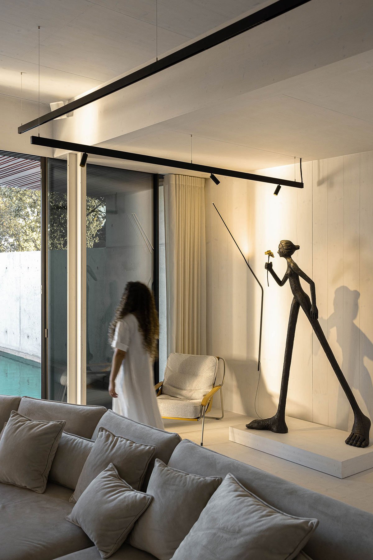 Constructed with the soul of wood (CLT), the house is organized over four floors: a garage and workspace in the basement floor, as an invitation to introspection and reflection; social spaces on the ground floor, inviting gatherings and sharing; the upper floors house four suites, and finally, crowning the structure, a terrace that offers 360o view over the city.