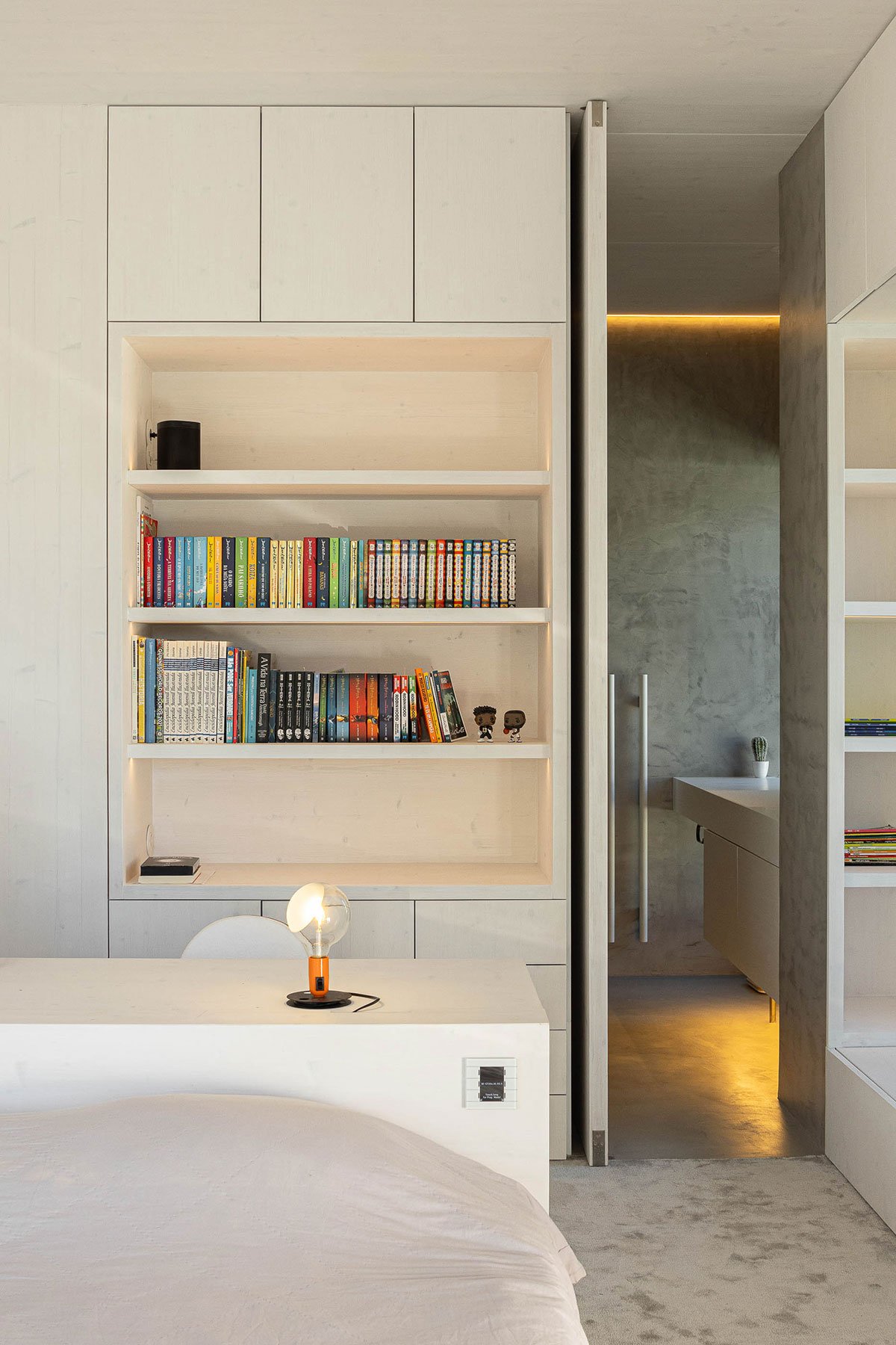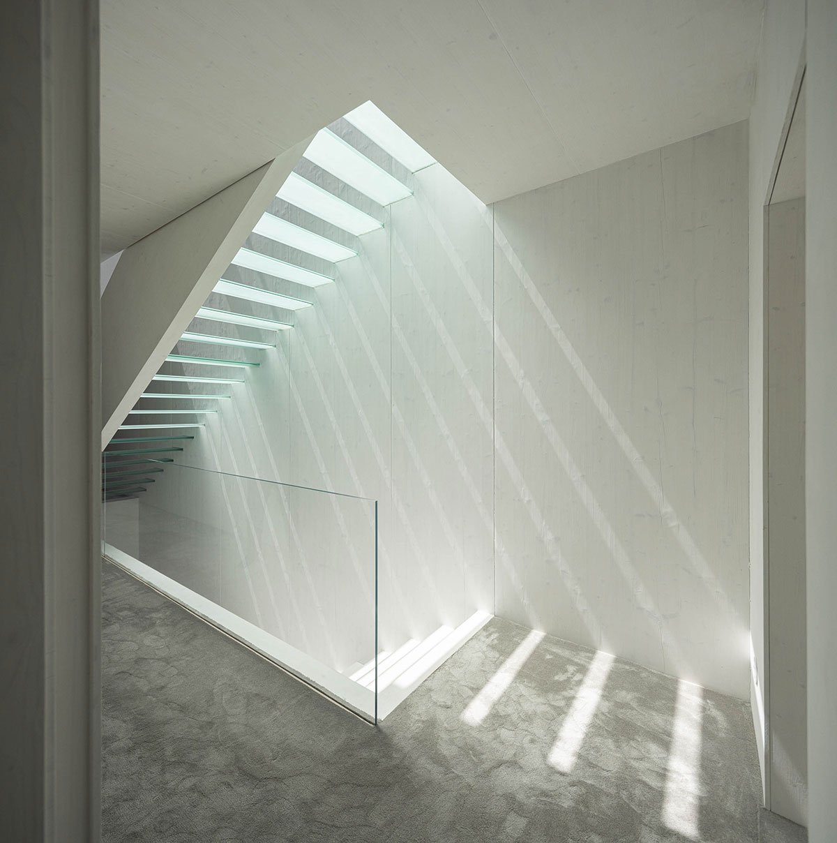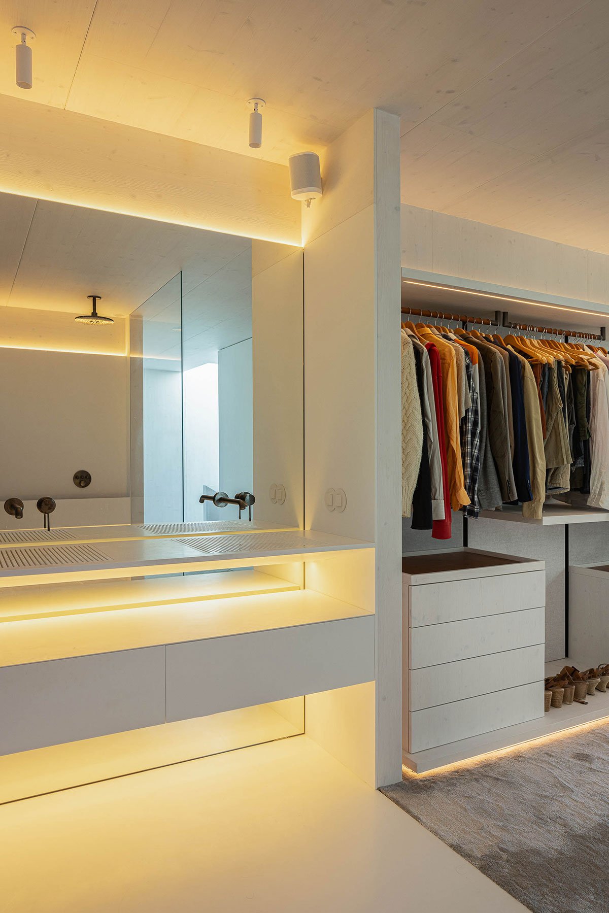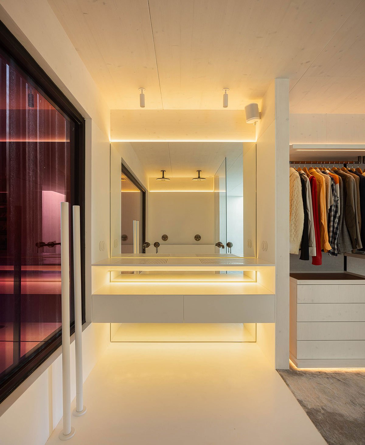 Constructed with the soul of wood (CLT), the house is organized over four floors: a garage and workspace in the basement floor, as an invitation to introspection and reflection; social spaces on the ground floor, inviting gatherings and sharing; the upper floors house four suites, and finally, crowning the structure, a terrace that offers 360o view over the city.
