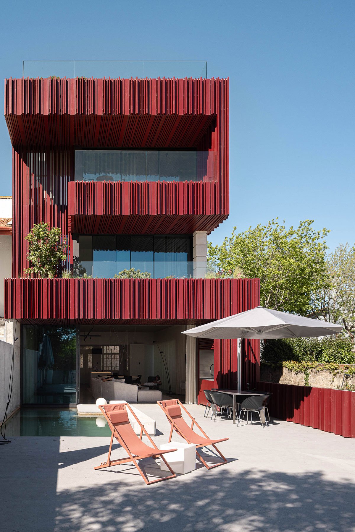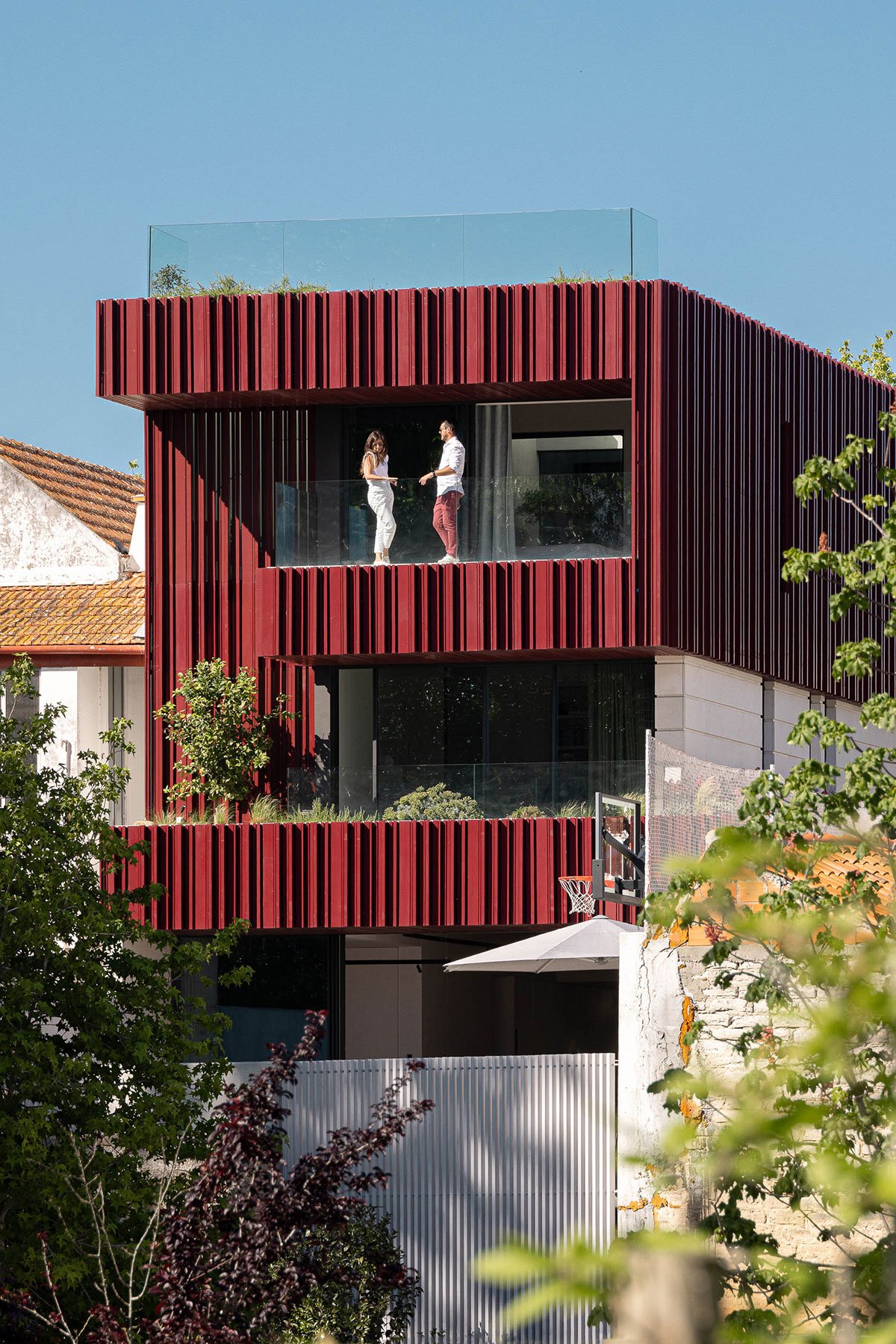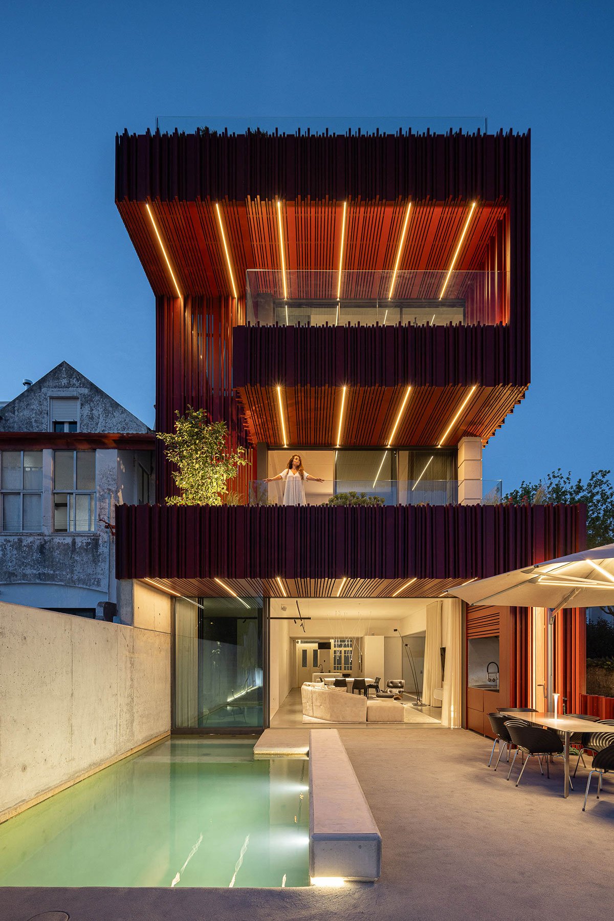 Excerpt: Park House by Paulo Martins Arquitectura e Design emerged from the alteration and expansion of a deteriorated 20th-century Art Nouveau building. Respecting the building’s original facade, the residence extends toward the city’s green heart, as if carved from the old structure. Its stony form, shaped by wooden slats, creates a visual narrative celebrating the passage of time, with lines and shadows reflecting the rhythm of the years.