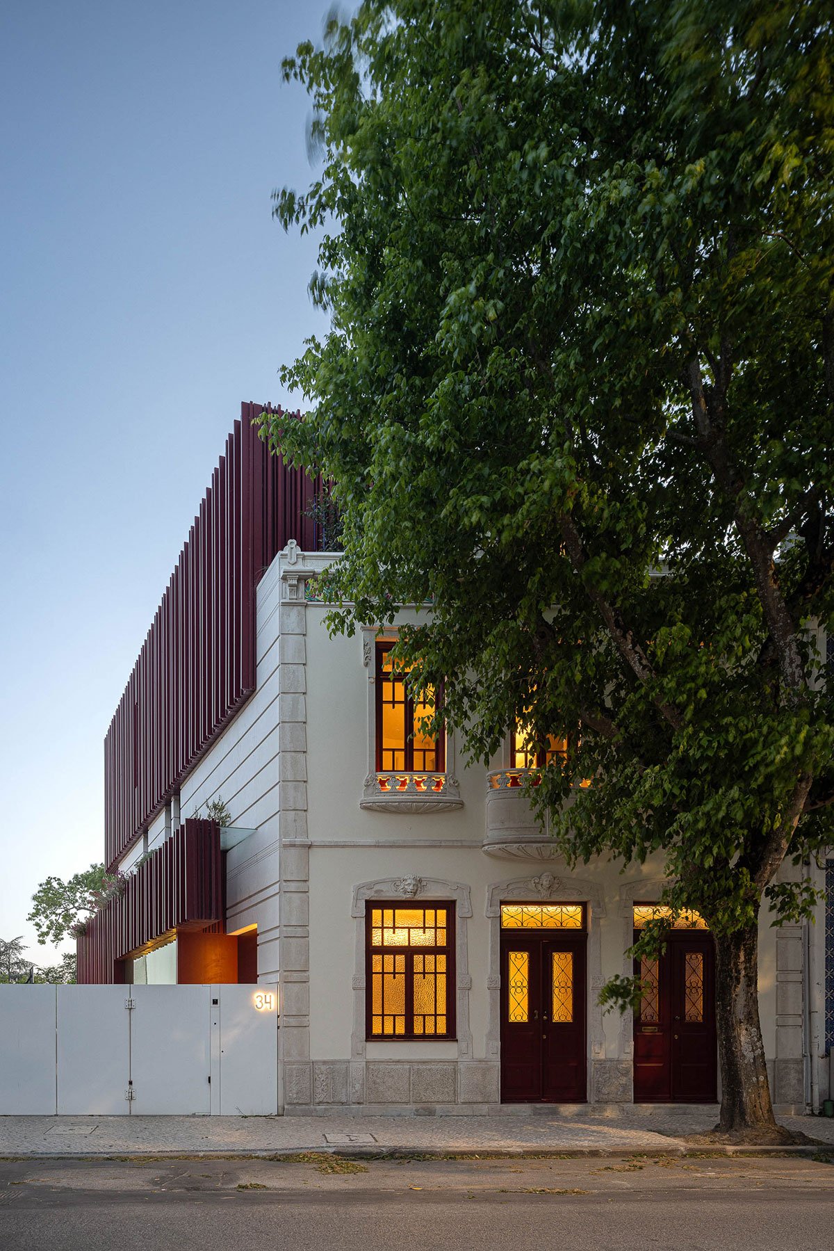 [Text as submitted by architect] The Park House is located on a quiet, central street in the city of Aveiro, facing a natural, tree-filled area, the city park. It emerged from the alteration and expansion of a deteriorated Art Nouveau building constructed in the 20th century. The facade features various plant, animal, and human elements carved in limestone, whose architectural and historical value was essential to preserve, thus guiding the material and formal character of the rest of the intervention.
