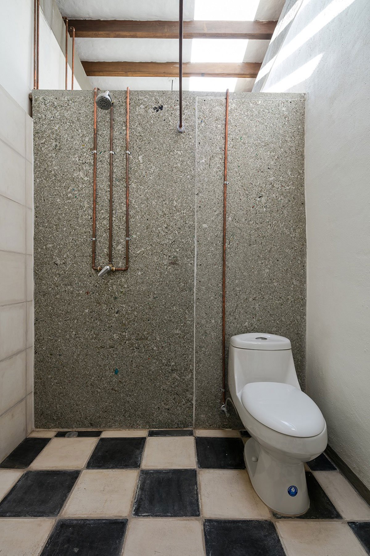 The roof consists of a system of wooden beams, tensioned trusses and a thin concrete slab. Several skylights provide proper lighting for the guestrooms and the corridor leading to the owner’s private quarters.