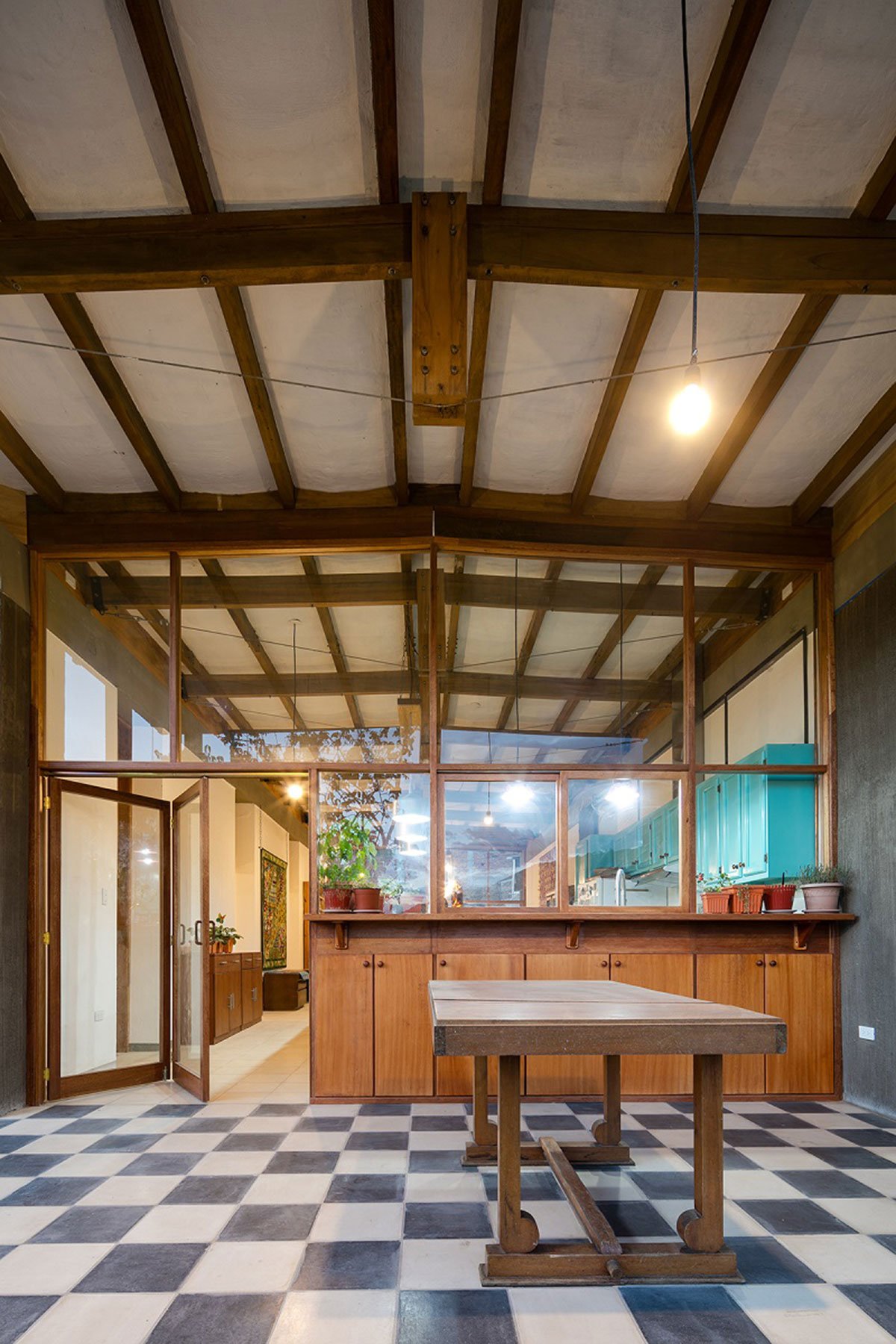 To begin, a single-level floor plan involved clearing out a large amount of earth. This earth was then used to build the mud walls that became the main structure of the house. In addition, almost all the windows, doors, and cabinets were recycled from the client’s previous home. Everything was recycled as a patchwork design. Materials that would seemingly be considered useless or not worthy were made to work by means of different systems. The windows were joined together and adapted to the wooden columns and mud walls; restored doors were hung from the concrete beams; restored and rebuilt cabinets were adapted to fit in new spaces, and old gates and fences were used to enclose the new garden.