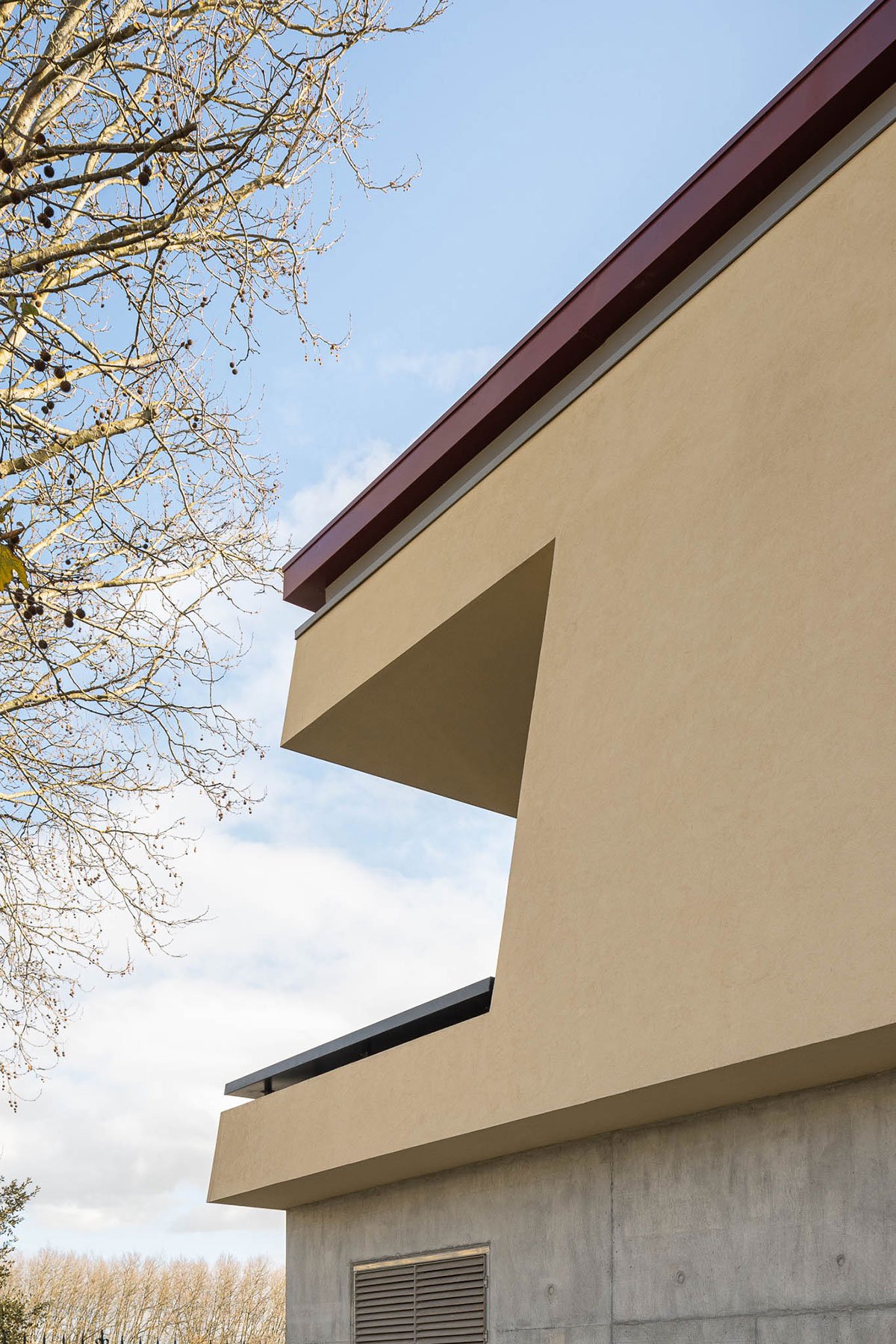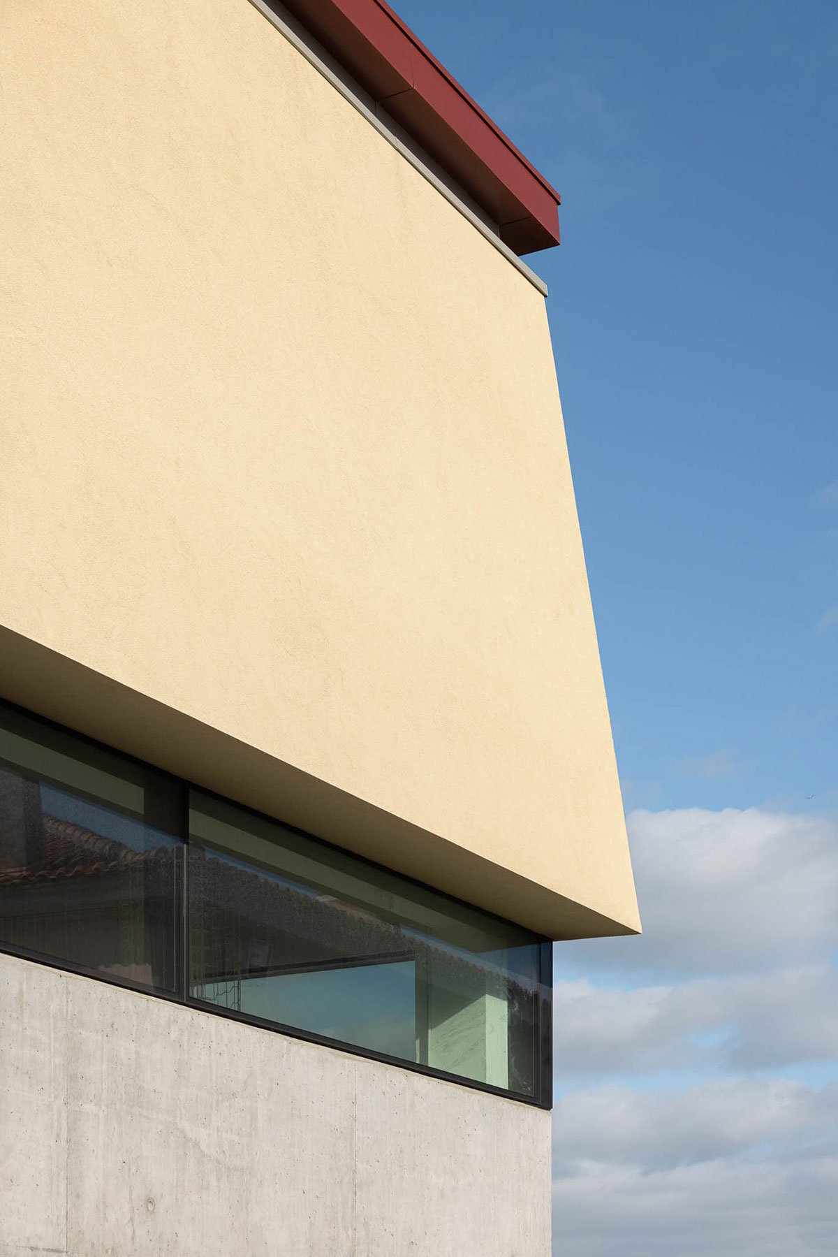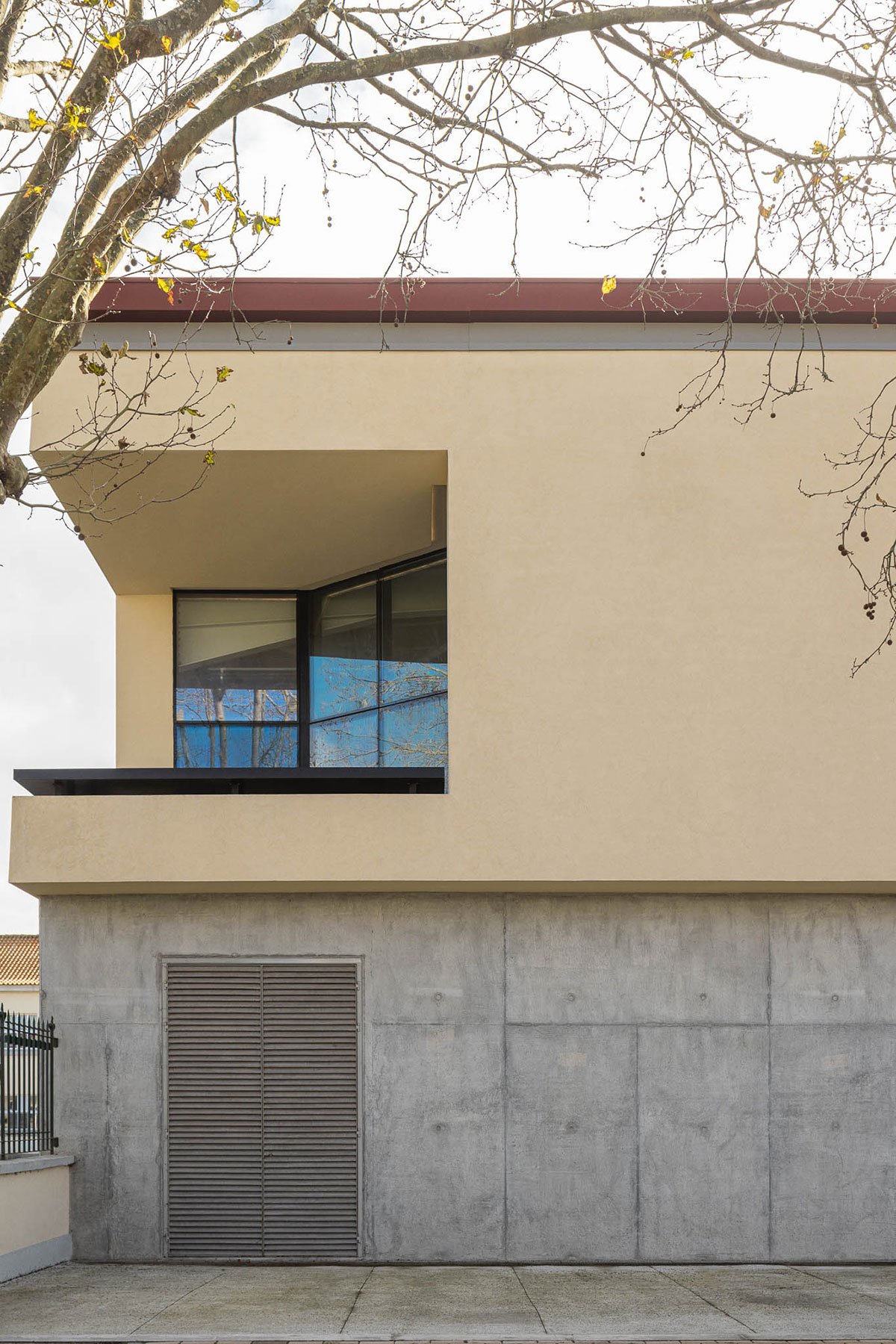 At the interior corner, a small balcony was designed with intentional enigmatic metric and alignments, offering a place to pause, where parents can relax in the break from their children’s games next to the leaves of the trees on Rua Alberto Pimentel, and appreciate the nonlinear facade of the house that is also known as the “bomb house”.