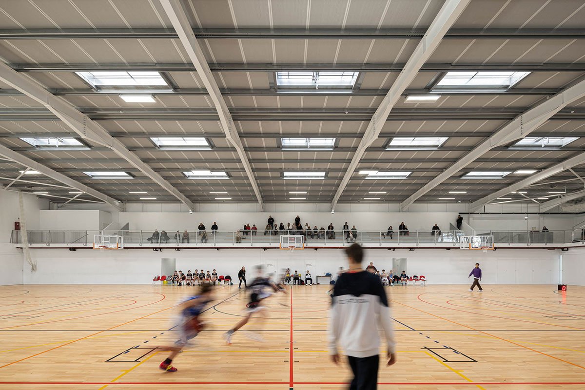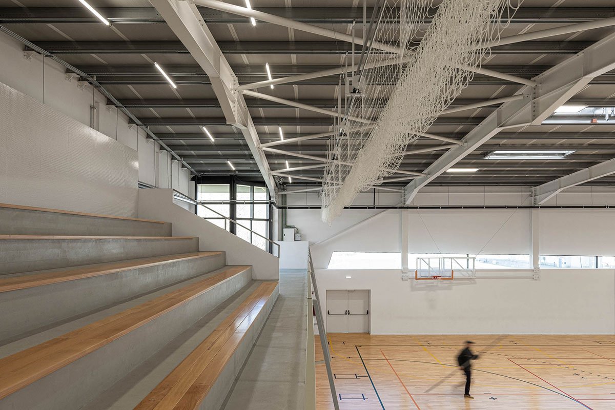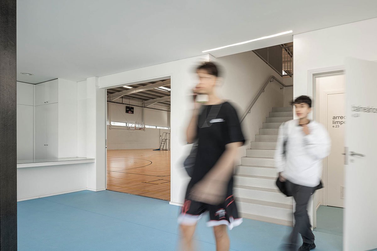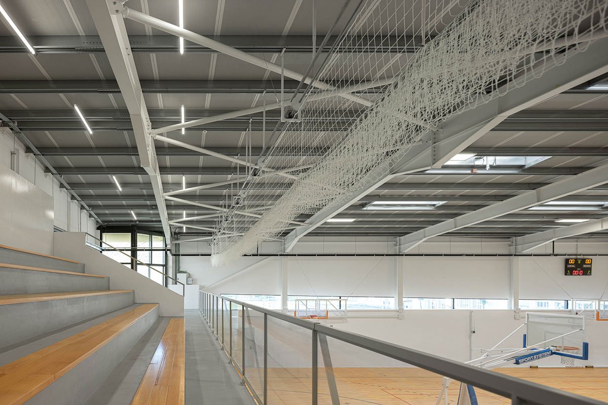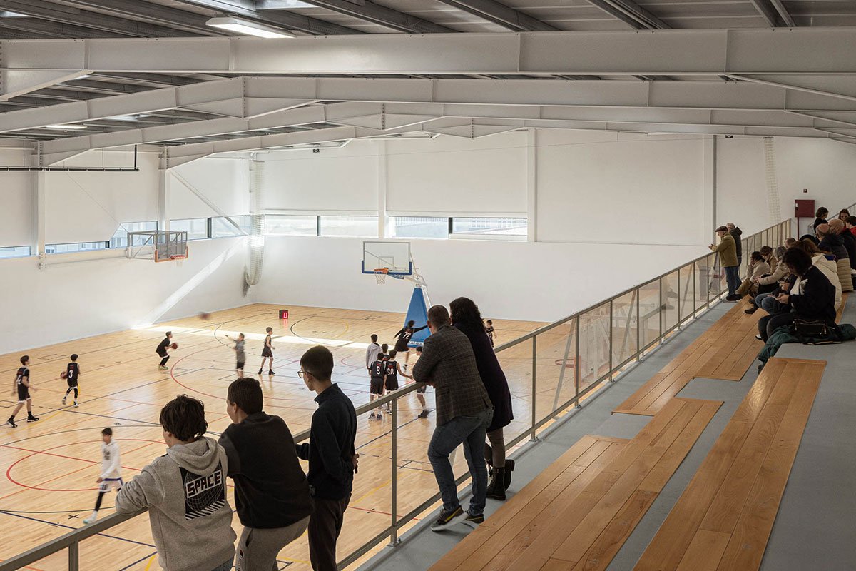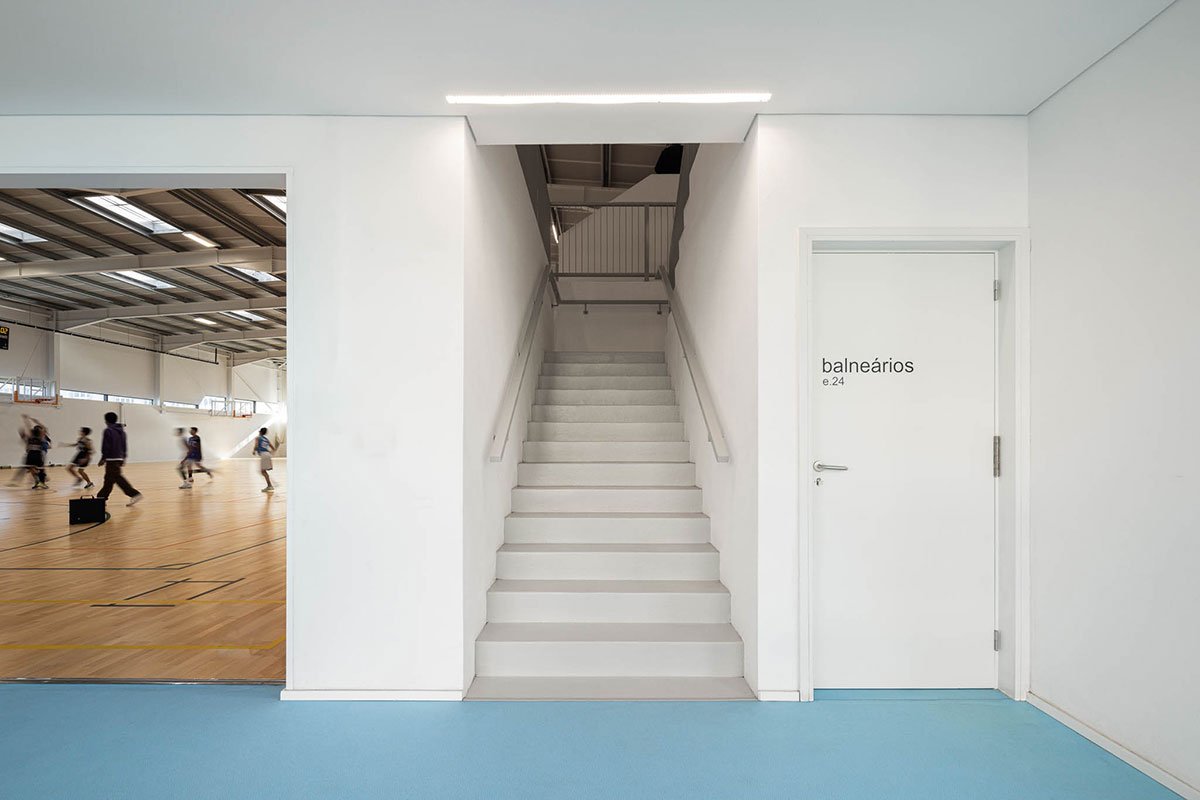 The wooden sports floor provides the versatility of use that was sought, both for sports and for any event that the school or community intends to hold there. The natural light, always present, namely through the numerous skylights, seeks to minimize energy needs, but also to reinforce the interior-exterior connection. From the audience benches it is possible to appreciate the outdoor playground with the children playing having the old facades as background.