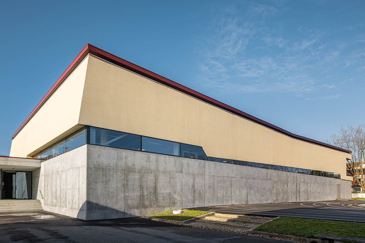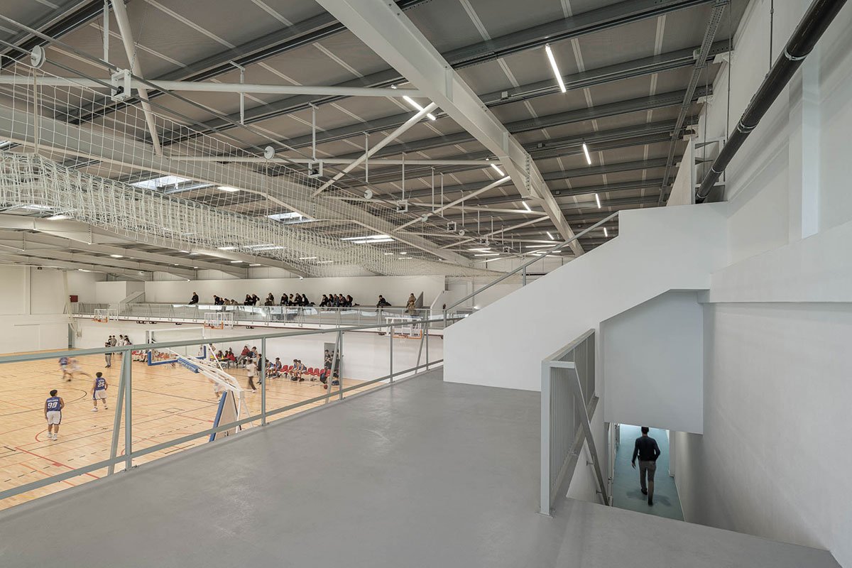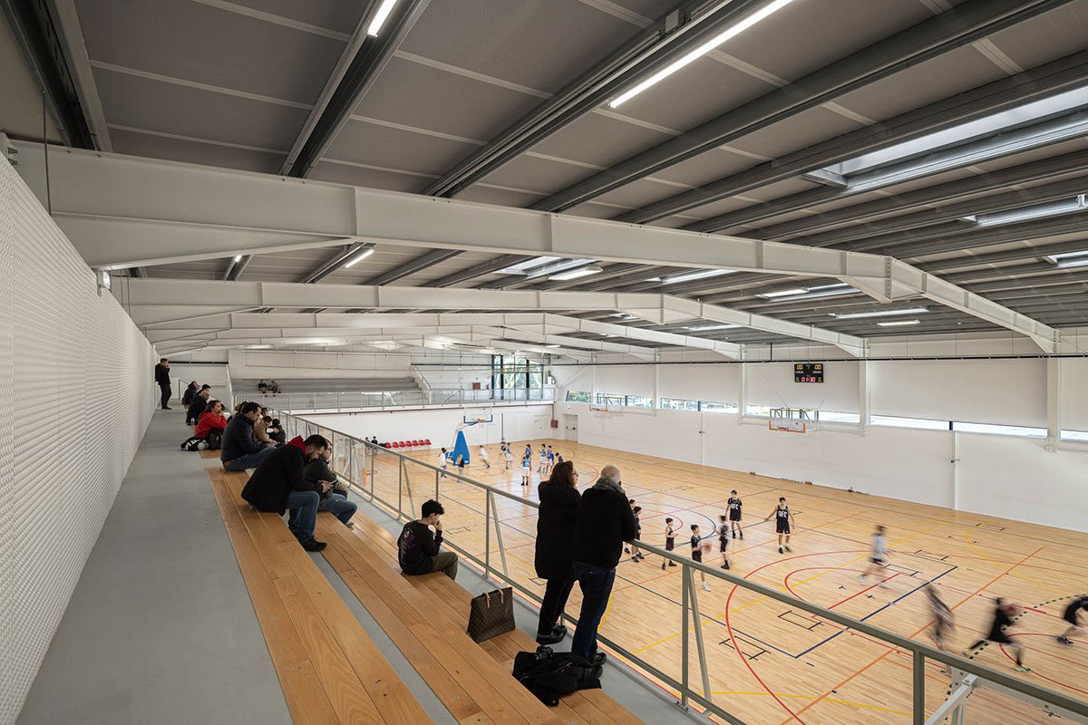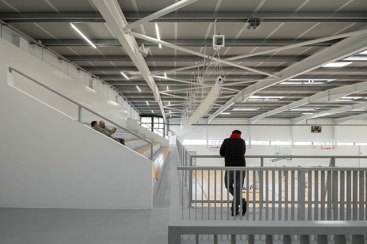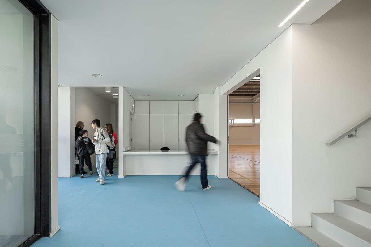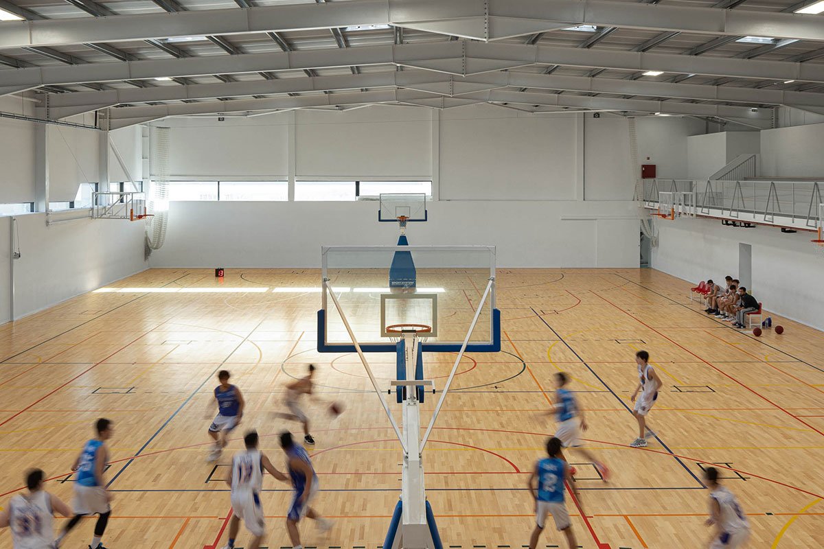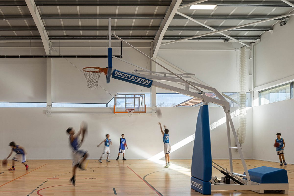 The wooden sports floor provides the versatility of use that was sought, both for sports and for any event that the school or community intends to hold there. The natural light, always present, namely through the numerous skylights, seeks to minimize energy needs, but also to reinforce the interior-exterior connection. From the audience benches it is possible to appreciate the outdoor playground with the children playing having the old facades as background.