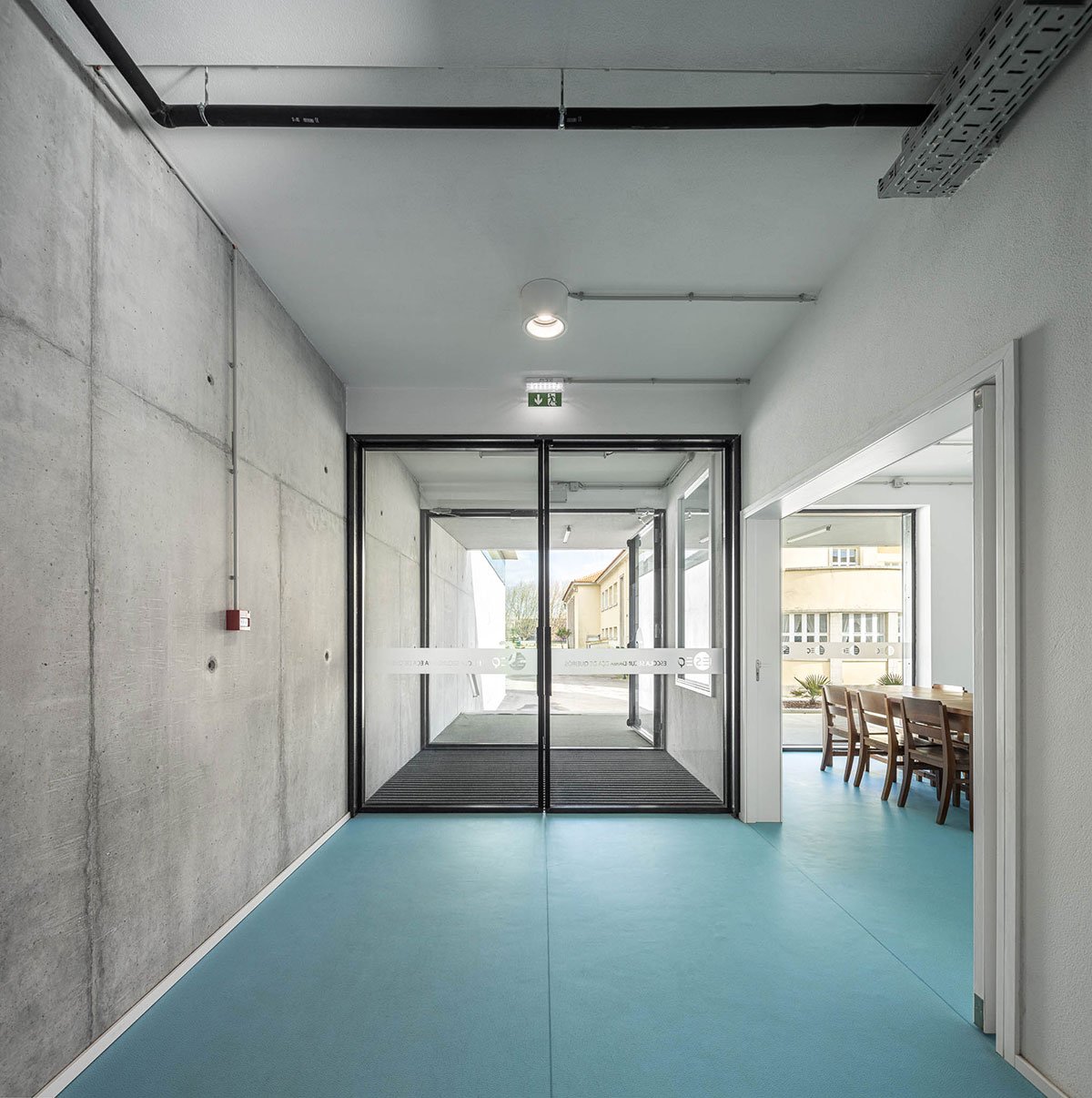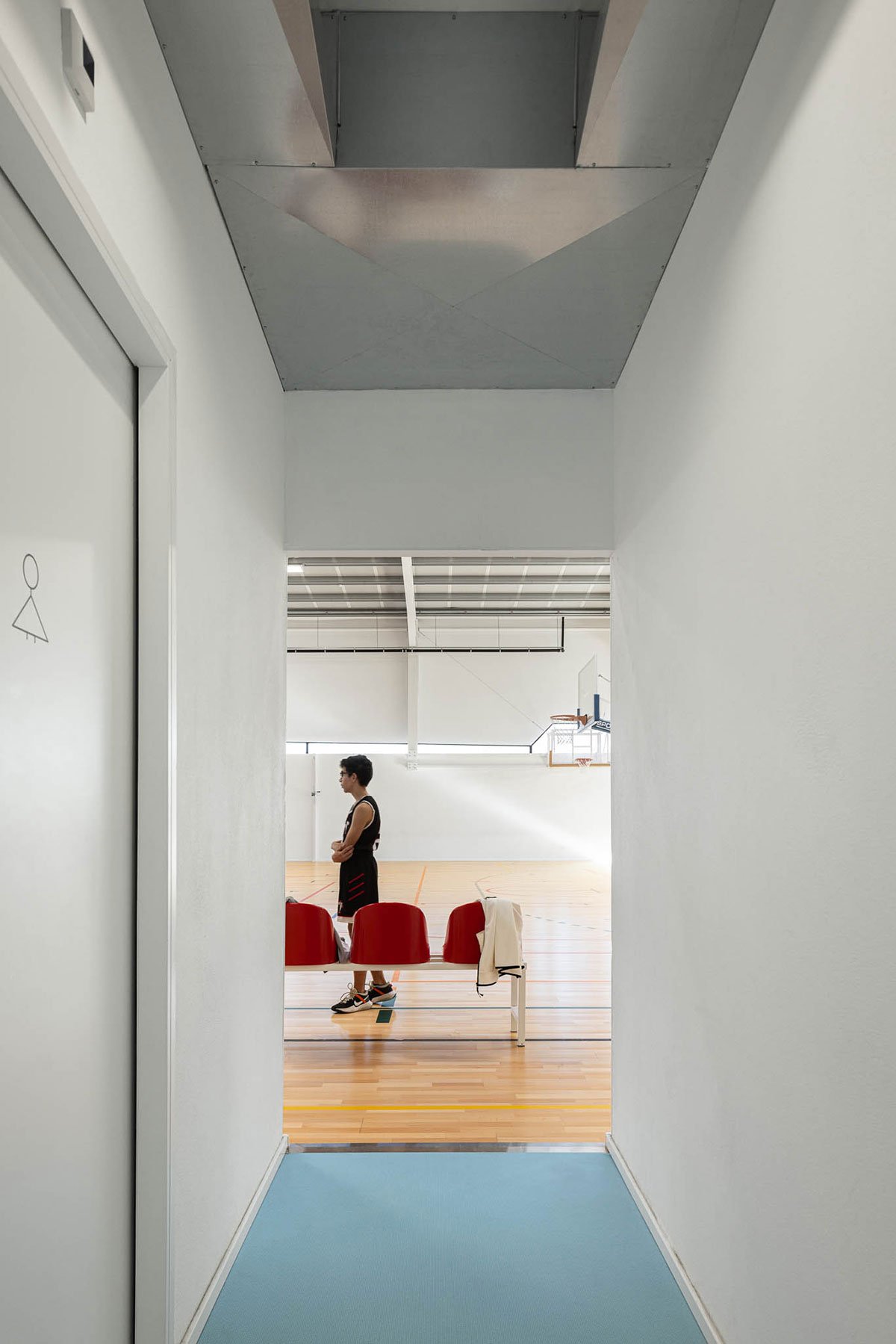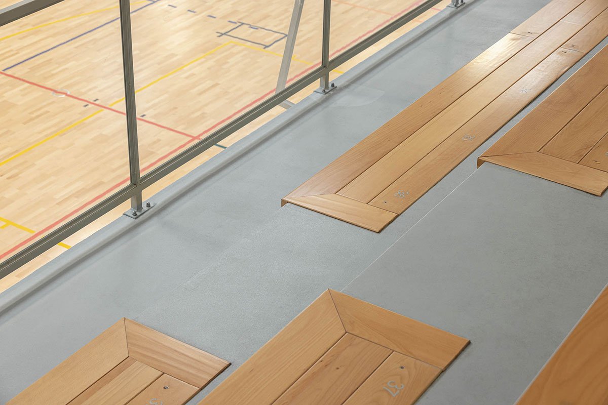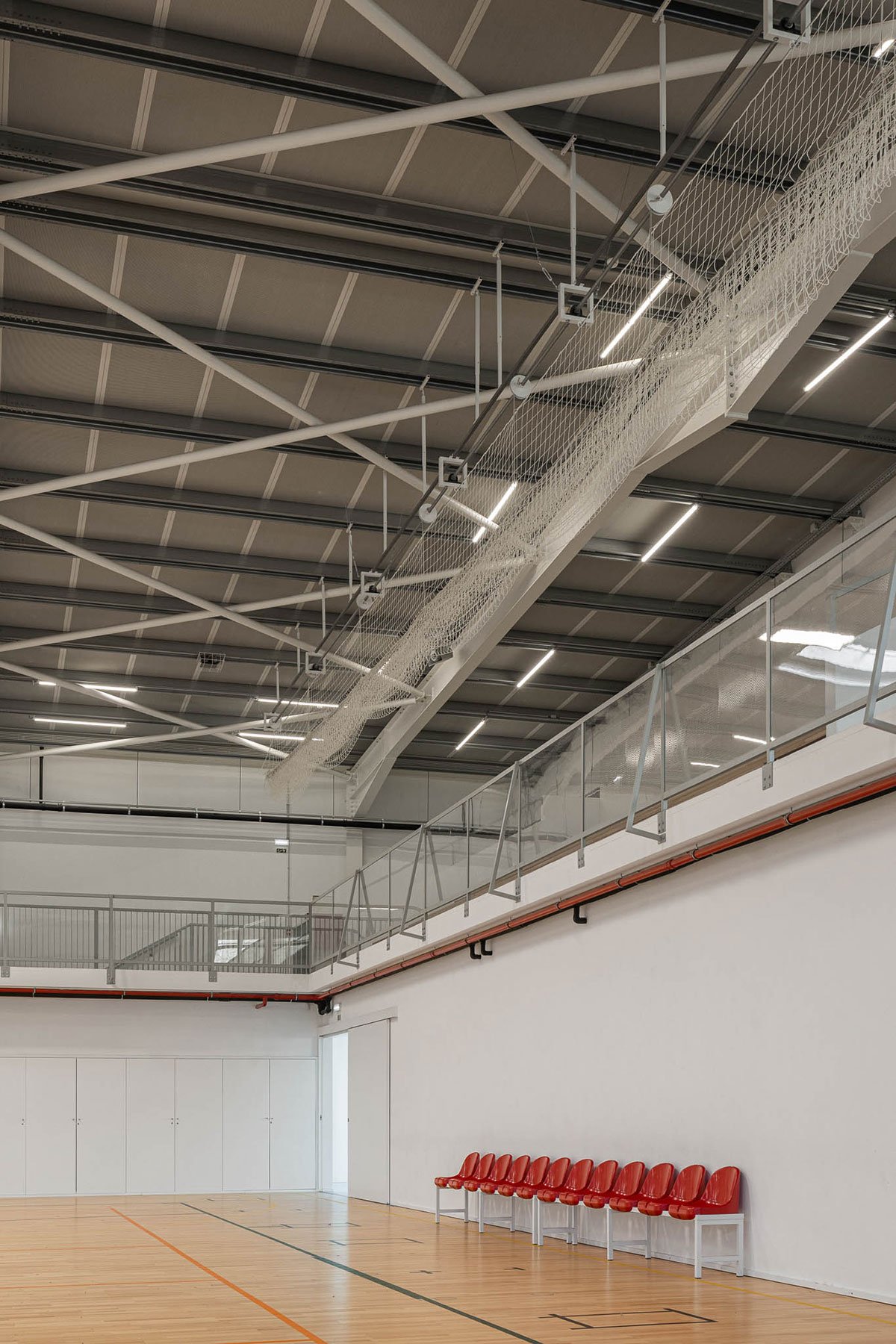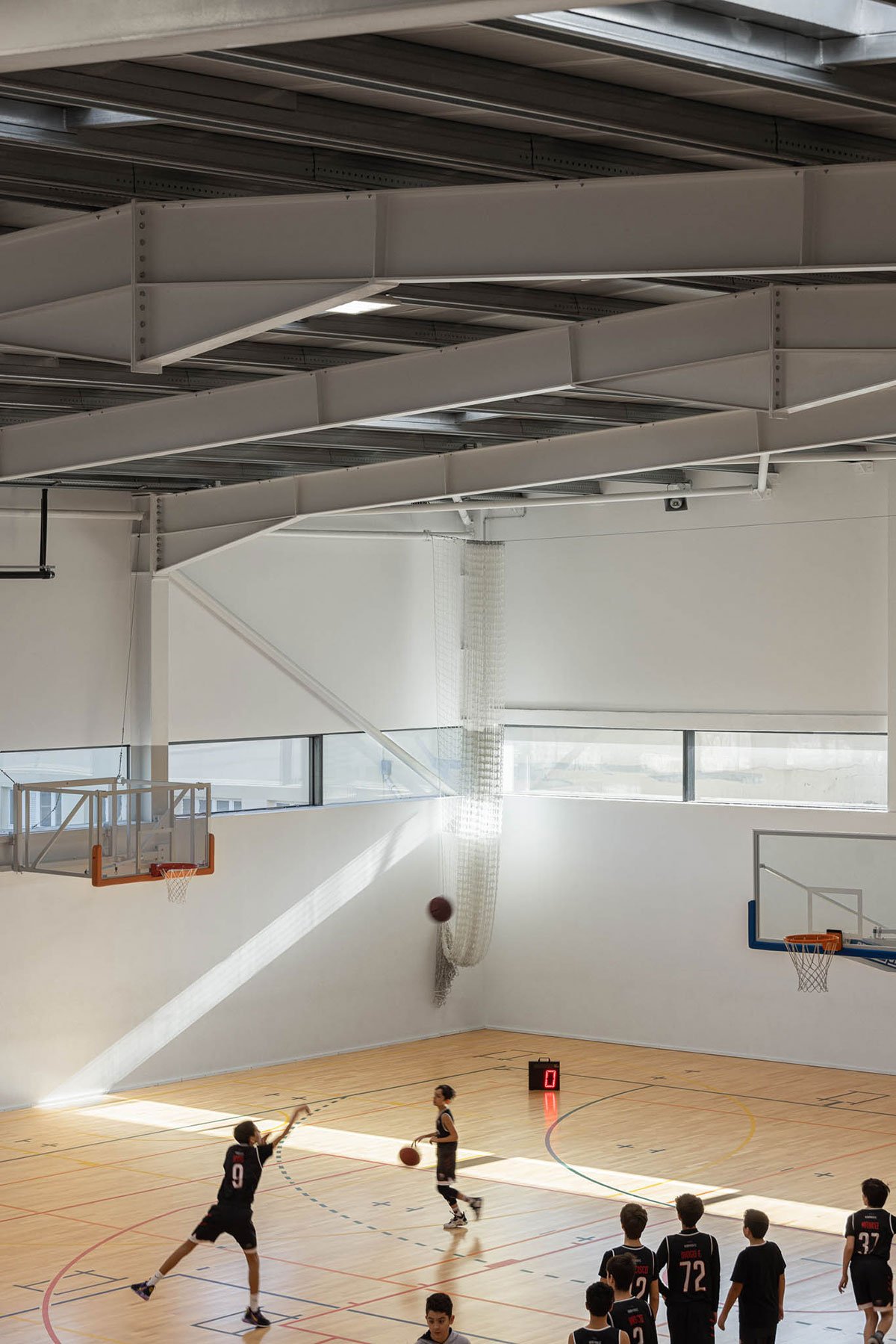 The wooden sports floor provides the versatility of use that was sought, both for sports and for any event that the school or community intends to hold there. The natural light, always present, namely through the numerous skylights, seeks to minimize energy needs, but also to reinforce the interior-exterior connection. From the audience benches it is possible to appreciate the outdoor playground with the children playing having the old facades as background.
